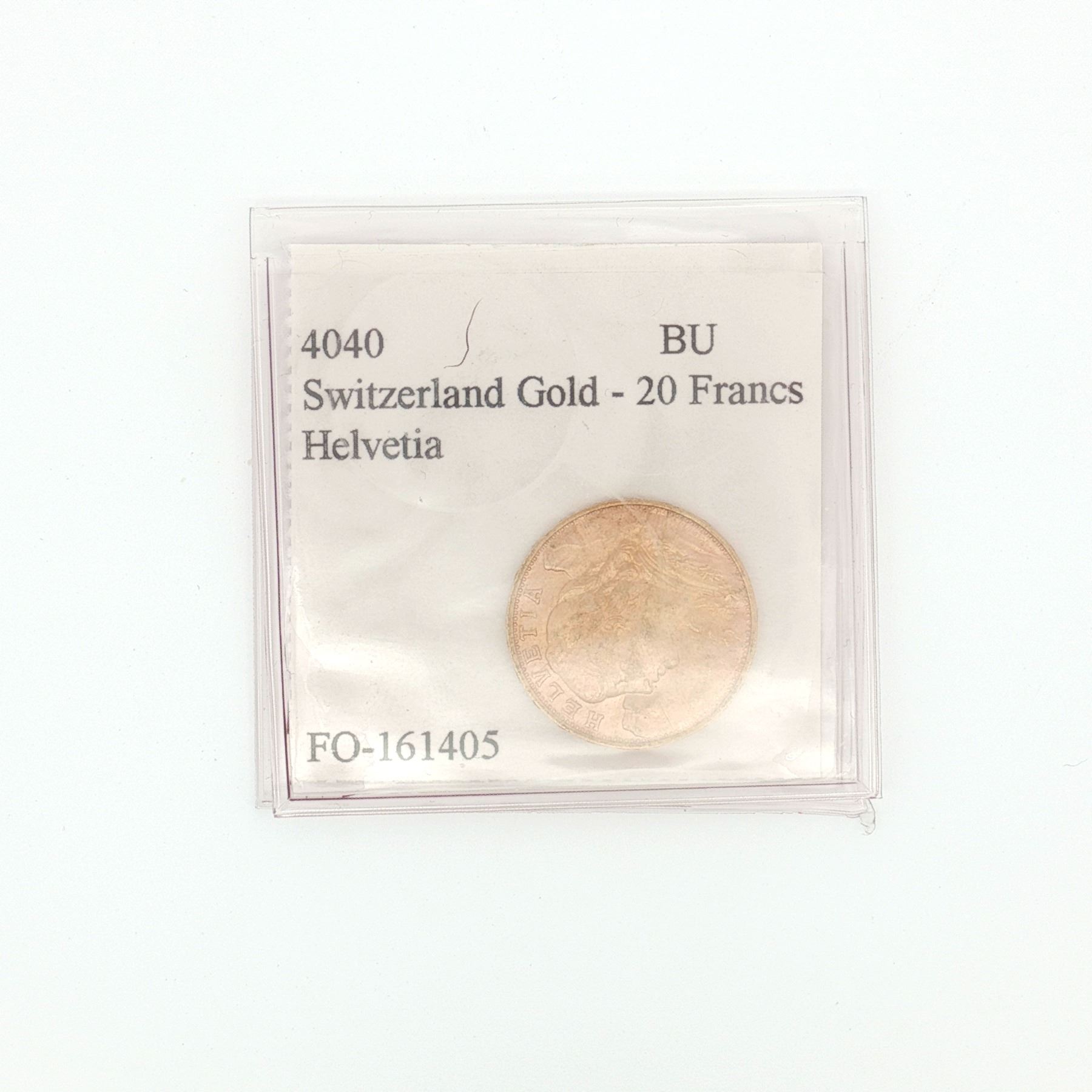Minted by Bern, Switzerland. The obverse depicts bust of young woman left-facing with tresses and a garland of edelweiss. The reverse displays Coat of Arms and Oak (Quercus robur) branch with acorns and ribbons behind. The denomination appears as "20" on the left and "FR" on the right. The coin is housed in a Eastern Numismatics plastic envelope. Gold content is 21.55K (89.80% gold), tested with a Thermo Scientific Niton XL2 XRF Precious Metal Analyzer. AGW 0.1867 oz.