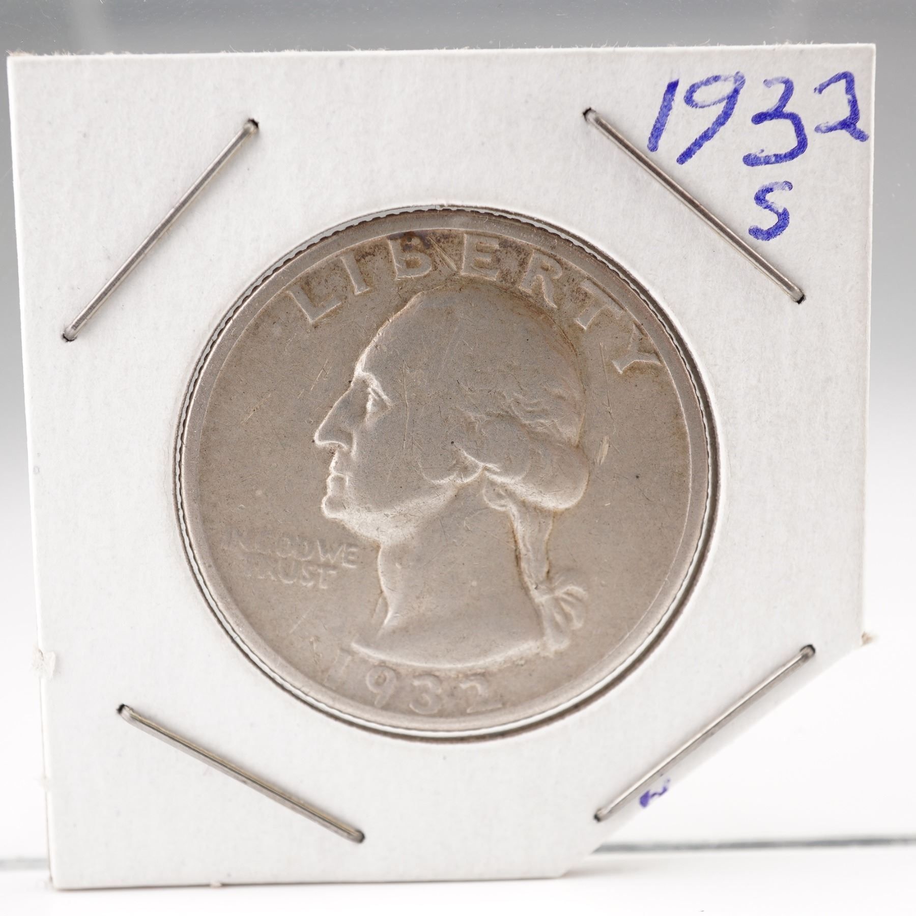 The obverse features a left-facing portrait of George Washington, with inscriptions LIBERTY, IN GOD WE TRUST, and the date 1932. The reverse depicts a heraldic eagle perched on a bundle of arrows with olive branches below, accompanied by the inscriptions UNITED STATES OF AMERICA, E PLURIBUS UNUM, and QUARTER DOLLAR. Mintmark "S" located below the wreath designates the San Francisco Mint. Metal content: 90% silver, 10% copper; weight 6.25 grams.