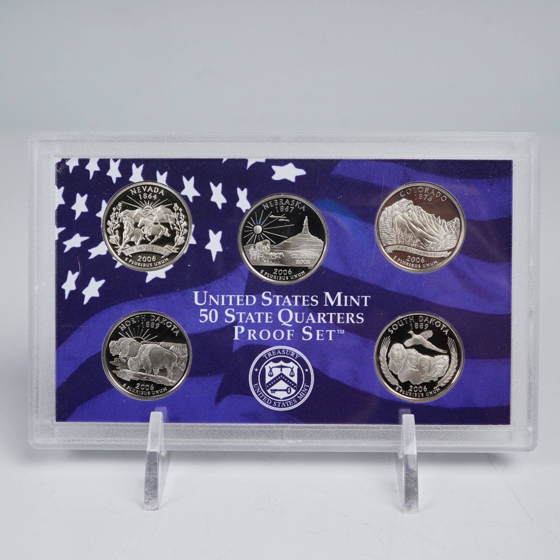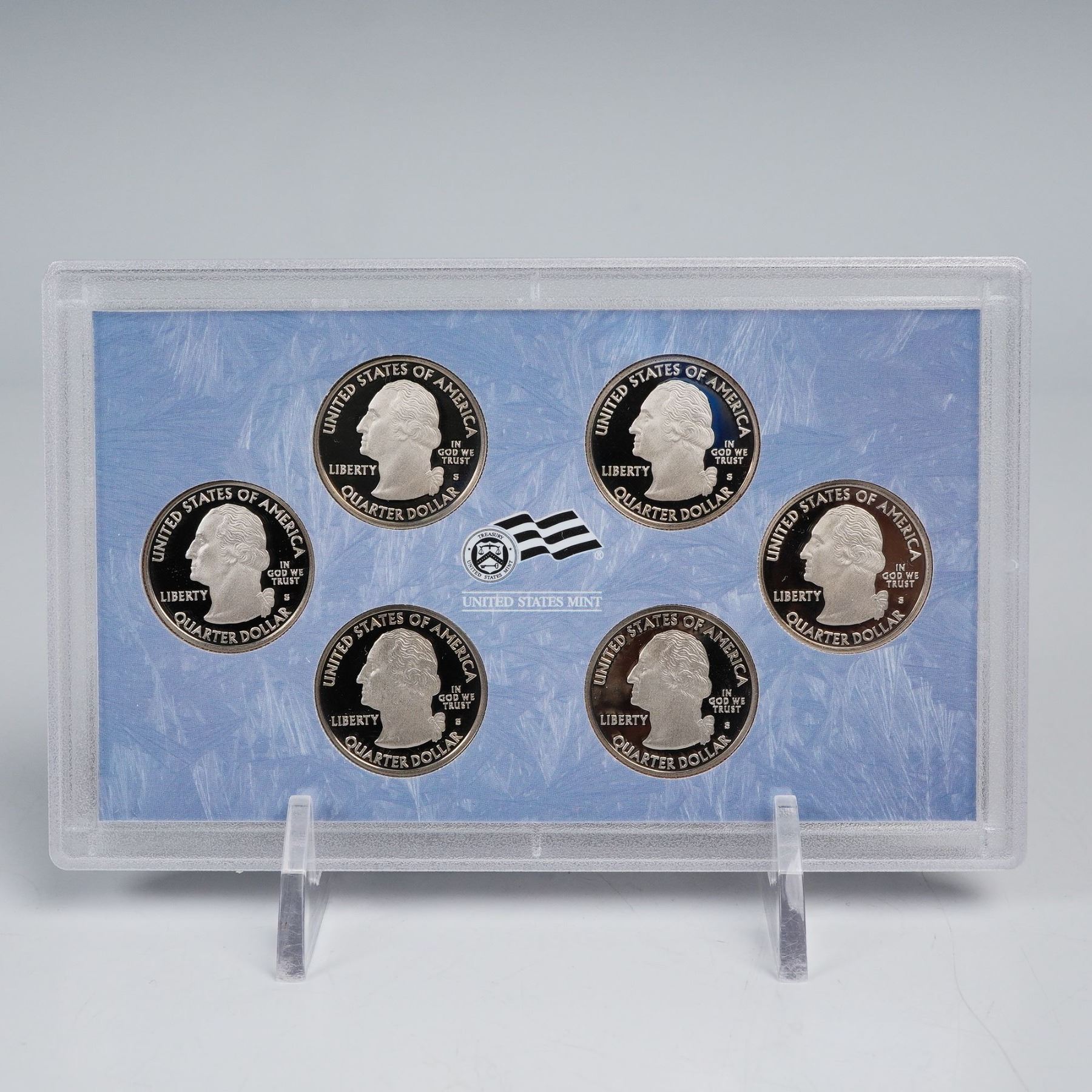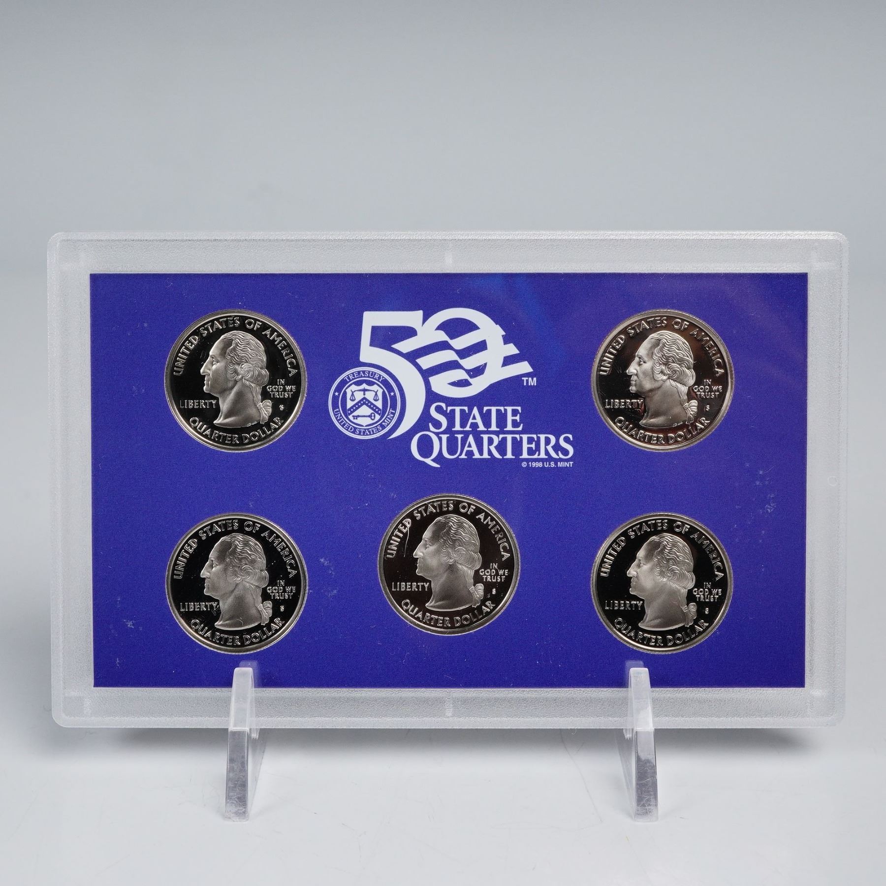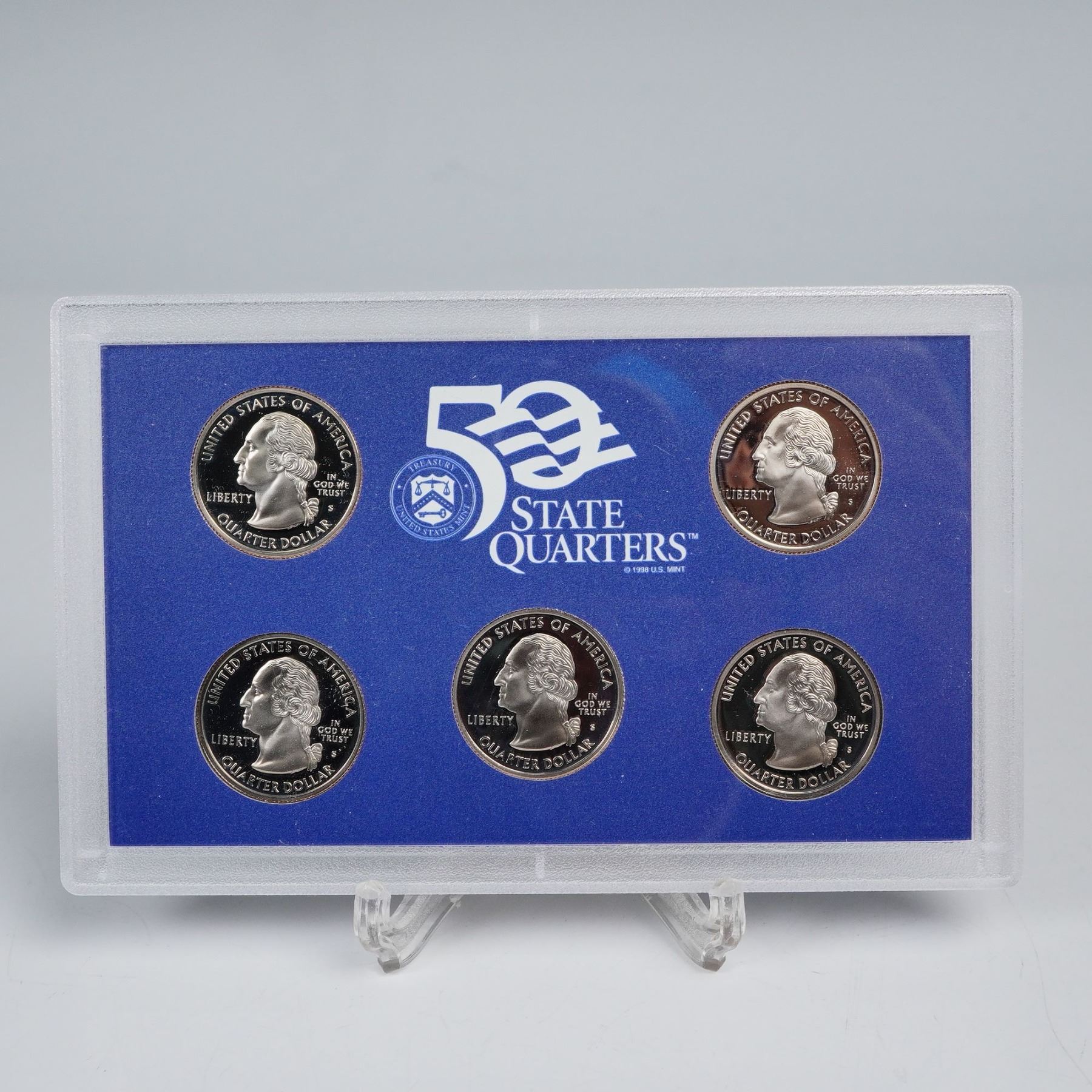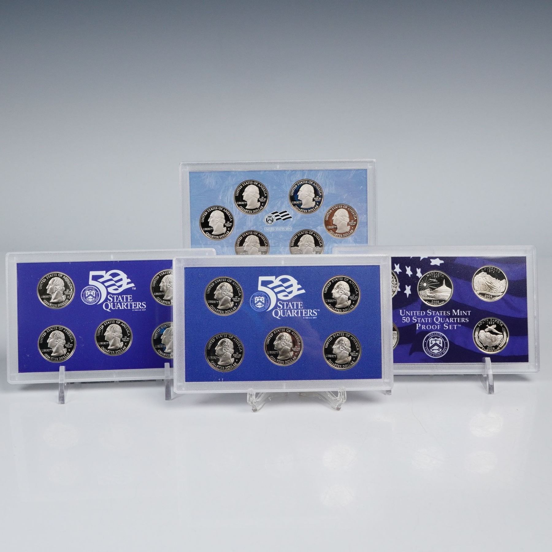 This lot includes four United States Mint 50 State Quarters Proof Sets, three of which each contain five quarters and one containing six. Each coin features the portrait of George Washington on the obverse with the inscriptions UNITED STATES OF AMERICA, LIBERTY, QUARTER DOLLAR, and IN GOD WE TRUST. The reverse of each quarter highlights a different state or territory with designs celebrating their unique heritage, landmarks, and history. Among the featured examples are California, Colorado, Puerto Rico, Guam, and Georgia, along with many others from the celebrated 50 State Quarters Program. Marked United States Mint. Certificate of Authenticity included. This item has its original box.