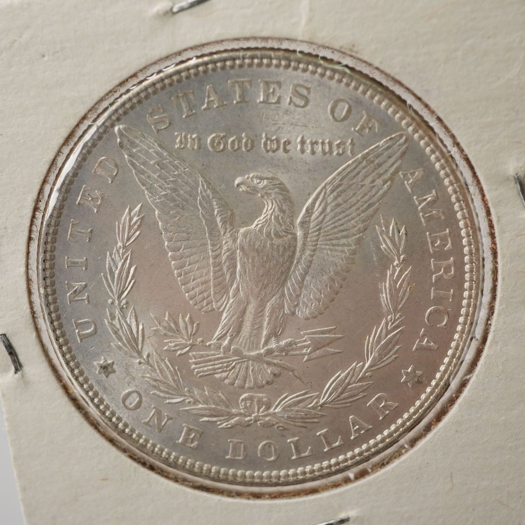 Silver dollar struck at the Philadelphia Mint, displaying George T. Morgan's Liberty portrait on the obverse with flowing hair and a Phrygian cap adorned with agricultural motifs, surrounded by the inscription E PLURIBUS UNUM, thirteen stars, and the date 1886 at the base. The reverse features a heraldic eagle with outstretched wings clutching arrows and an olive branch, encircled by a laurel wreath, with the inscriptions UNITED STATES OF AMERICA, IN GOD WE TRUST and ONE DOLLAR. This example shows attractive original surfaces with light cartwheel luster visible beneath the album toning; housed in a vintage 2-2 holder labeled. Net silver weight 0.8593 troy oz.