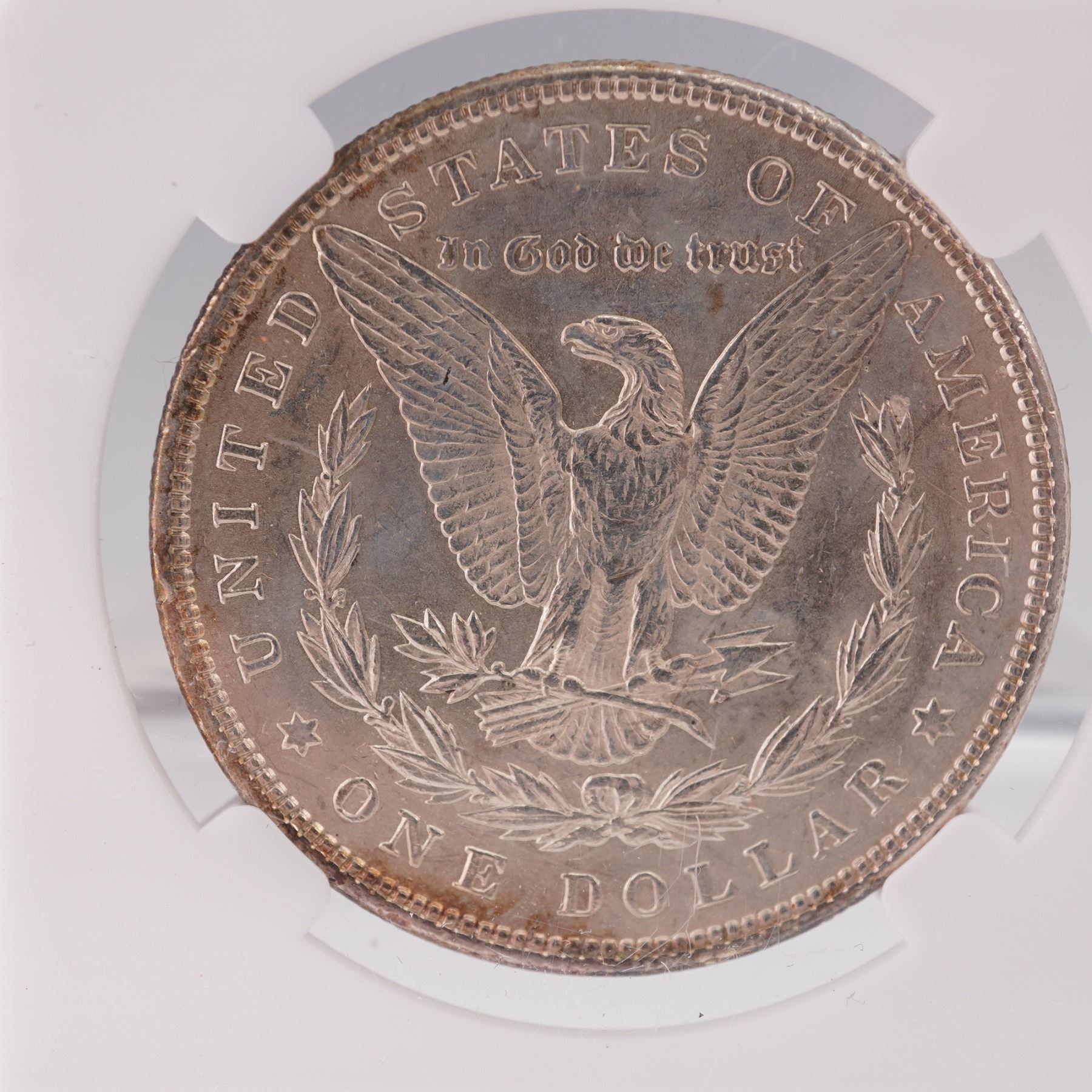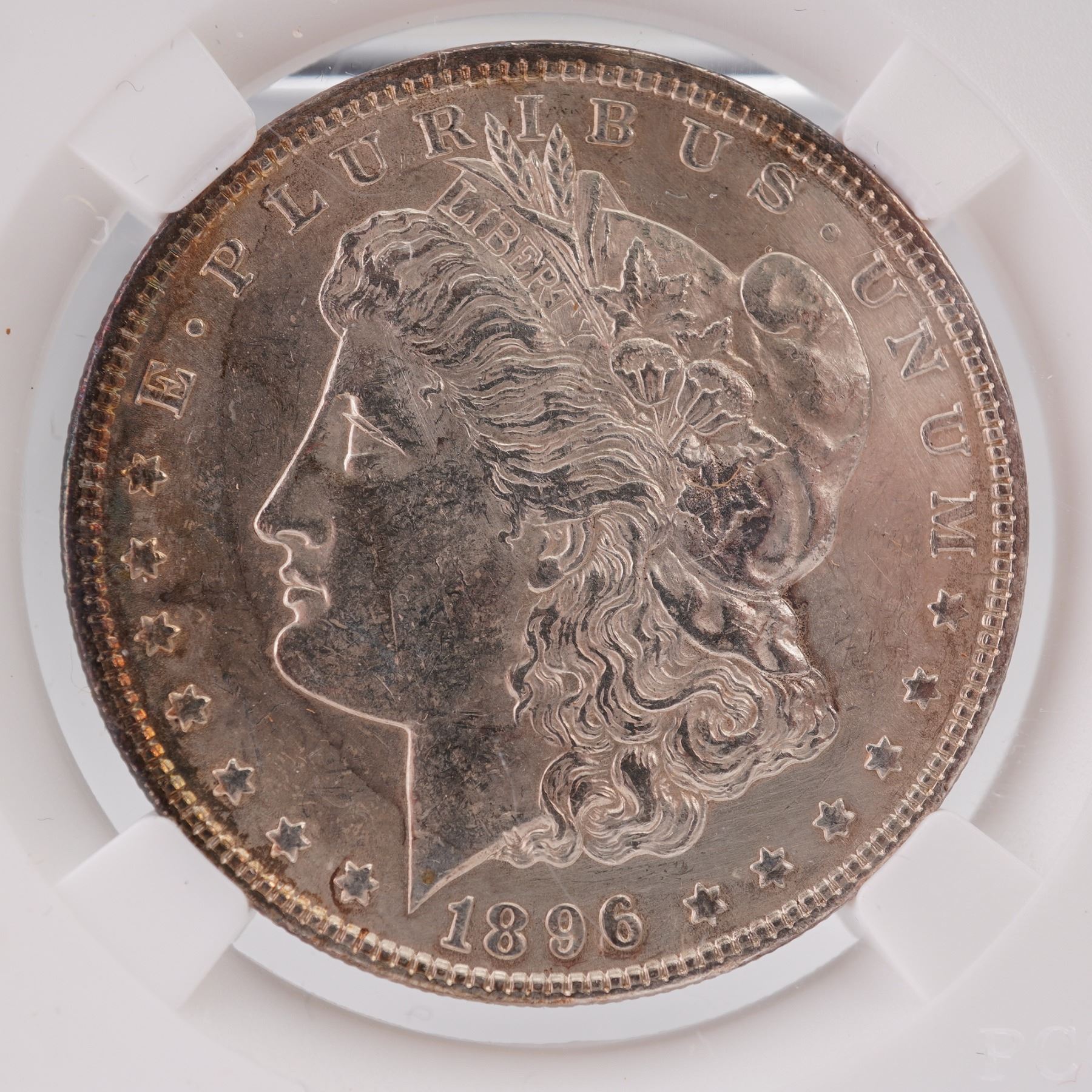 Presented here is an 1896 Morgan Silver Dollar designed by George T. Morgan, housed in a protective case. The obverse shows Liberty wearing a Phrygian cap adorned with wheat and cotton, surrounded by stars and the inscriptions E PLURIBUS UNUM and the date 1896. The reverse, also by Morgan, depicts a heraldic eagle clutching arrows and an olive branch, framed by a wreath with the inscriptions UNITED STATES OF AMERICA, IN GOD WE TRUST, and ONE DOLLAR.
