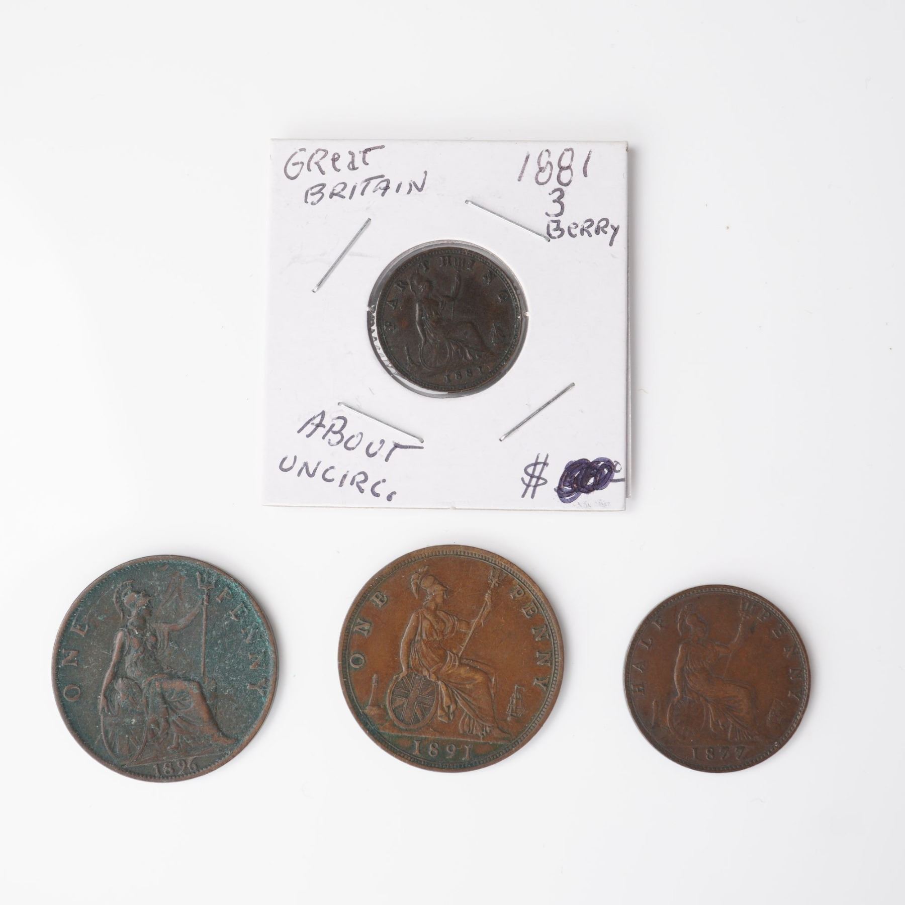 A group of four Victorian British coins featuring Queen Victoria. Includes an 1881 three pence (3D) piece encased in a holder marked "Great Britain 1881 3 Berry," struck in sterling silver (0.925 fine), minted at the Royal Mint, London. The obverse depicts the crowned bust of Queen Victoria with the inscription VICTORIA D:G:BRITT:REG:F:D:, and the reverse features Britannia seated with shield and trident, inscription ONE PENNY, or denomination in corresponding coins. Accompanied by three bronze coins: one penny dated 1896, one penny dated 1897, and one halfpenny dated 1877, each bearing the young or veiled bust of Victoria on the obverse and Britannia on the reverse.