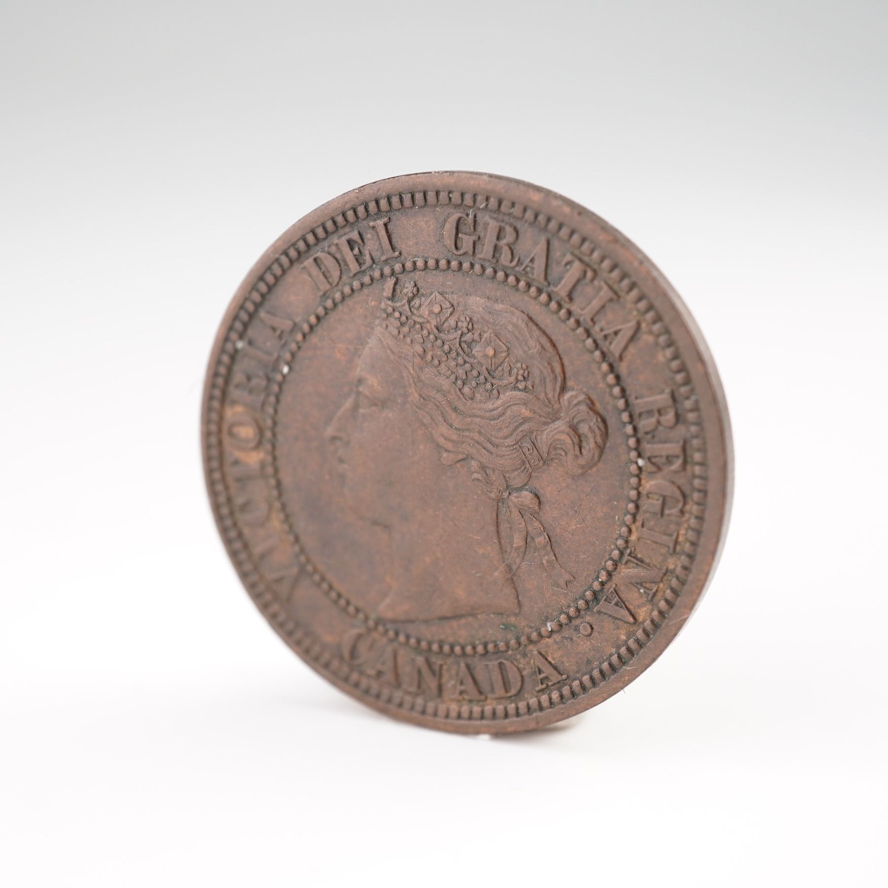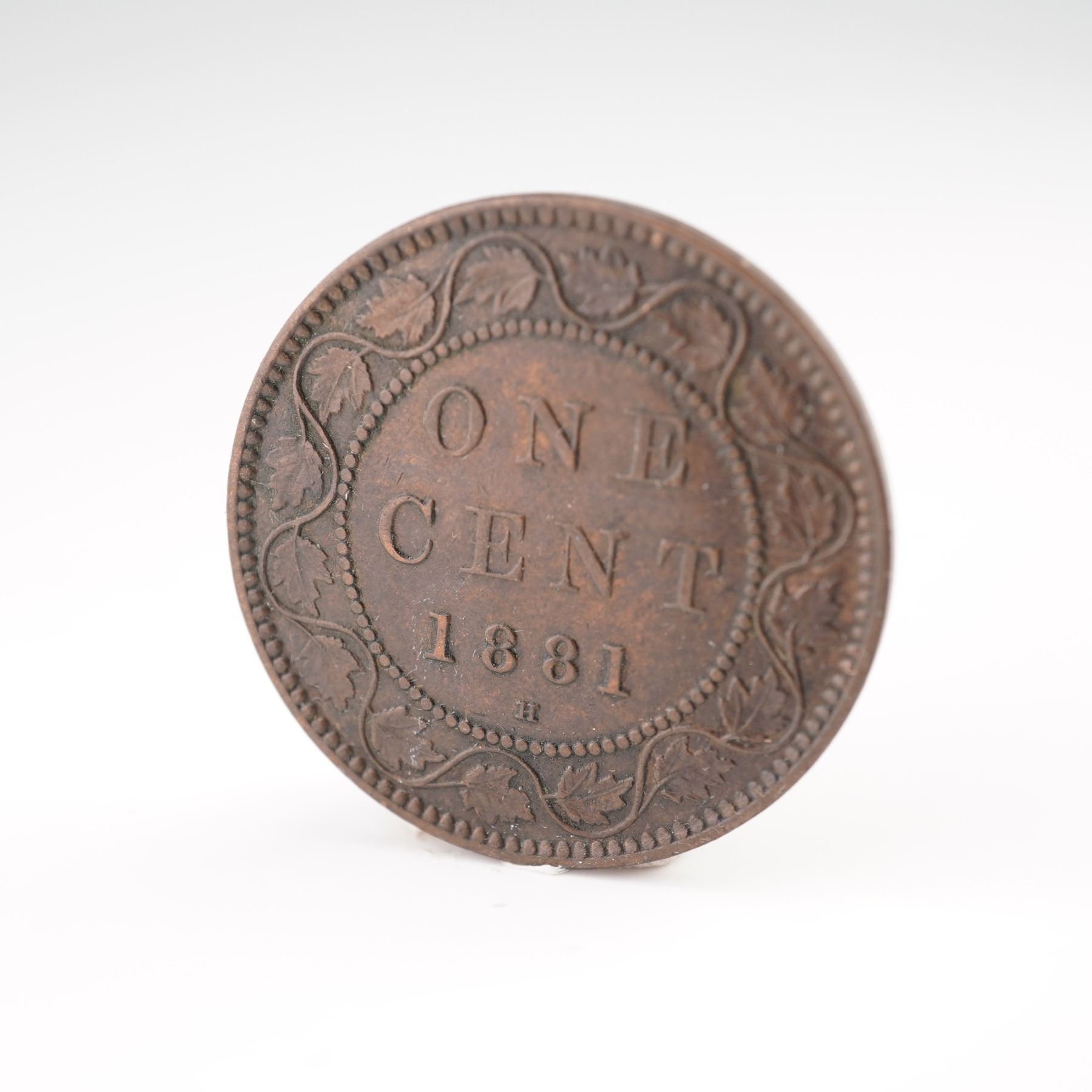 Struck at the Heaton Mint in Birmingham, England, this bronze coin features the left-facing portrait of Queen Victoria wearing a laurel wreath on the obverse, surrounded by the inscription VICTORIA DEI GRATIA REGINA CANADA. The reverse displays the denomination ONE CENT encircled by a vine of maple leaves, with the date 1881 and the small "H" mintmark below, indicating the Heaton Mint. Metal Content: bronze (composition typically 95% copper, 4% tin, and 1% zinc). Design elements reflect the colonial coinage of Canada prior to Confederation's standardization of domestic minting.