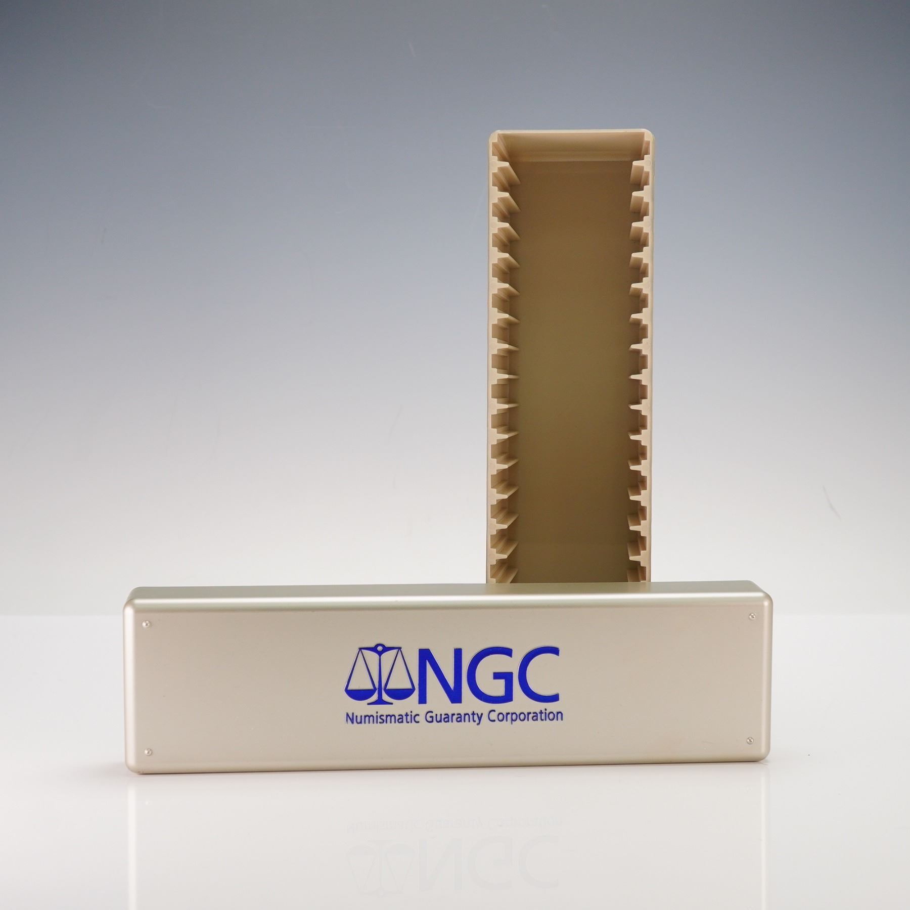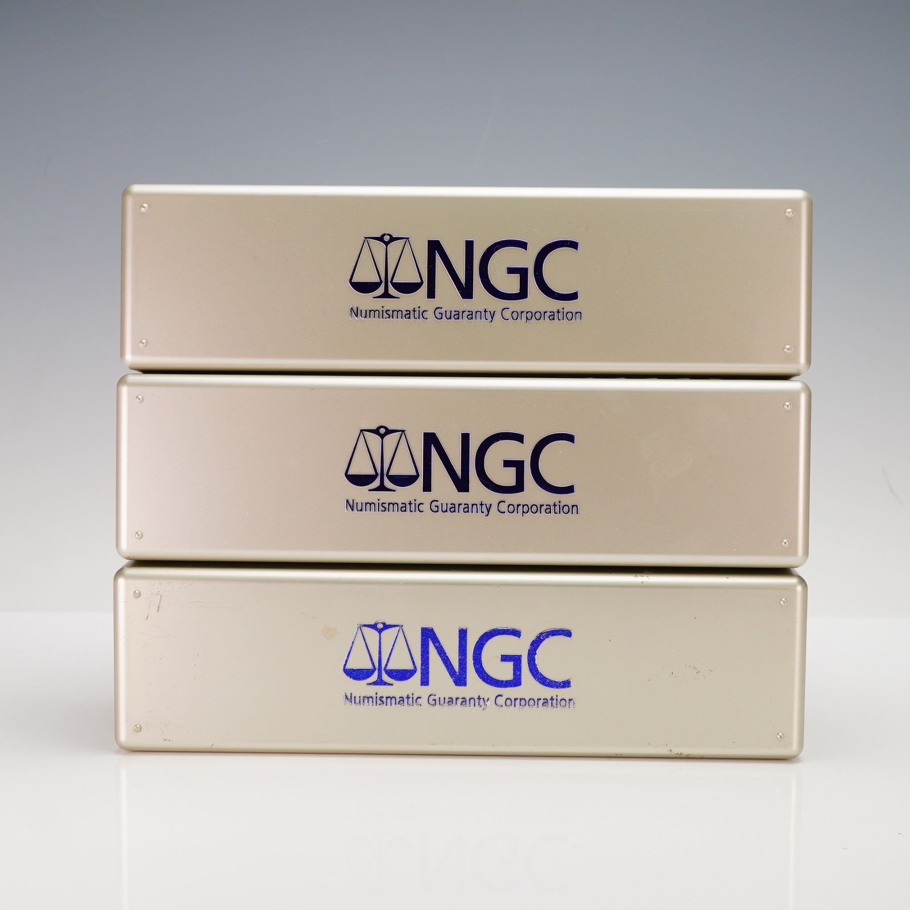 A trio of empty storage boxes manufactured by the Numismatic Guaranty Corporation (NGC) designed for securing certified graded coin slabs. These are standard NGC plastic slab cases, typically holding 20 slabs each, resulting in a total capacity of 60 certified graded coins for the lot. The exterior finish is a light silver or champagne metallic color, featuring the blue NGC logo and corporate name printed on the front face. The internal structure consists of tan plastic channels engineered to secure the slabs. This lot consists of three empty storage boxes. Weight is for all three boxes.