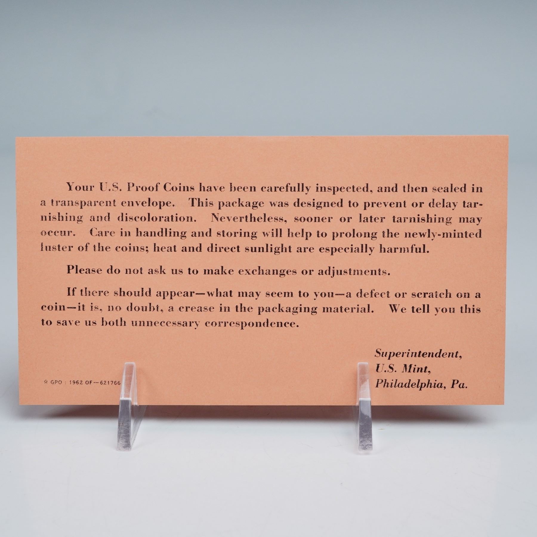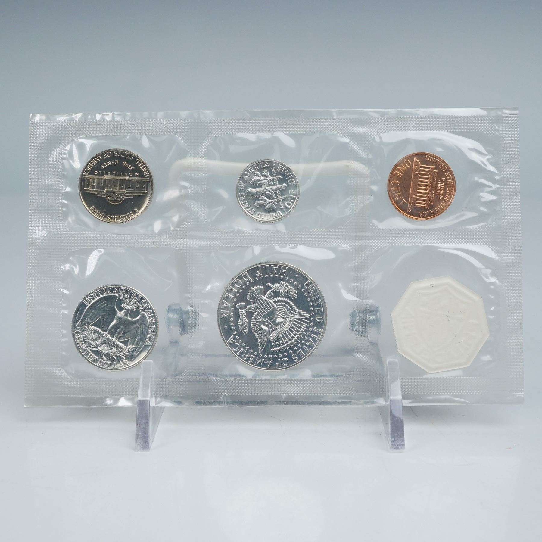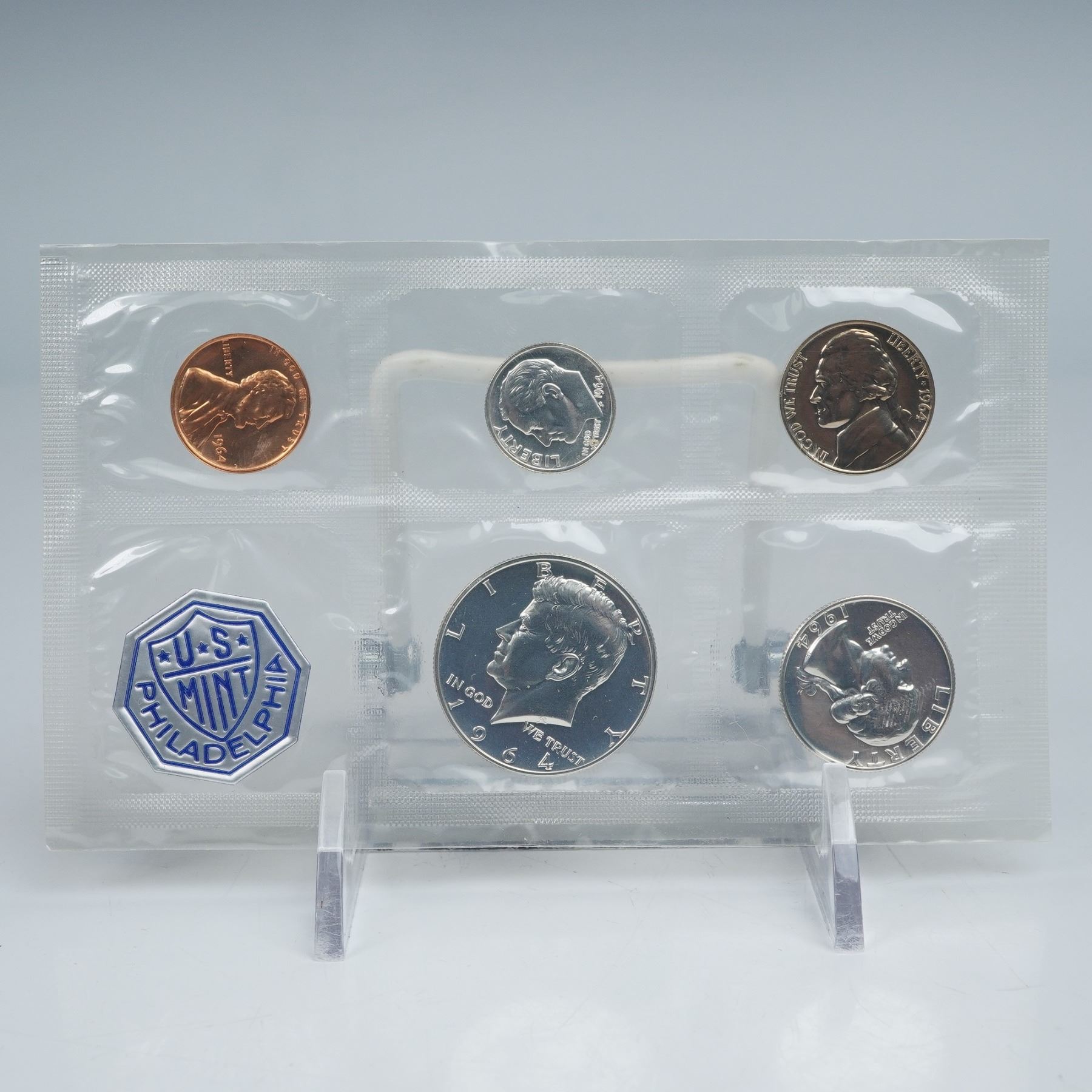 Includes a Lincoln Cent, Jefferson Nickel, Roosevelt Dime, Washington Quarter, and Kennedy Half Dollar, each struck in proof finish. The obverse designs feature portraits of Abraham Lincoln, Thomas Jefferson, Franklin D. Roosevelt, George Washington, and John F. Kennedy, respectively, while the reverses display the Lincoln Memorial, Monticello, torch and olive branch, eagle with shield, and the presidential seal. Inscriptions include LIBERTY, IN GOD WE TRUST, UNITED STATES OF AMERICA, and E PLURIBUS UNUM. Struck at the Philadelphia Mint. The Kennedy Half Dollar in this set contains 90% silver with a weight of 12.5 grams (0.3617 troy ounce fine silver).