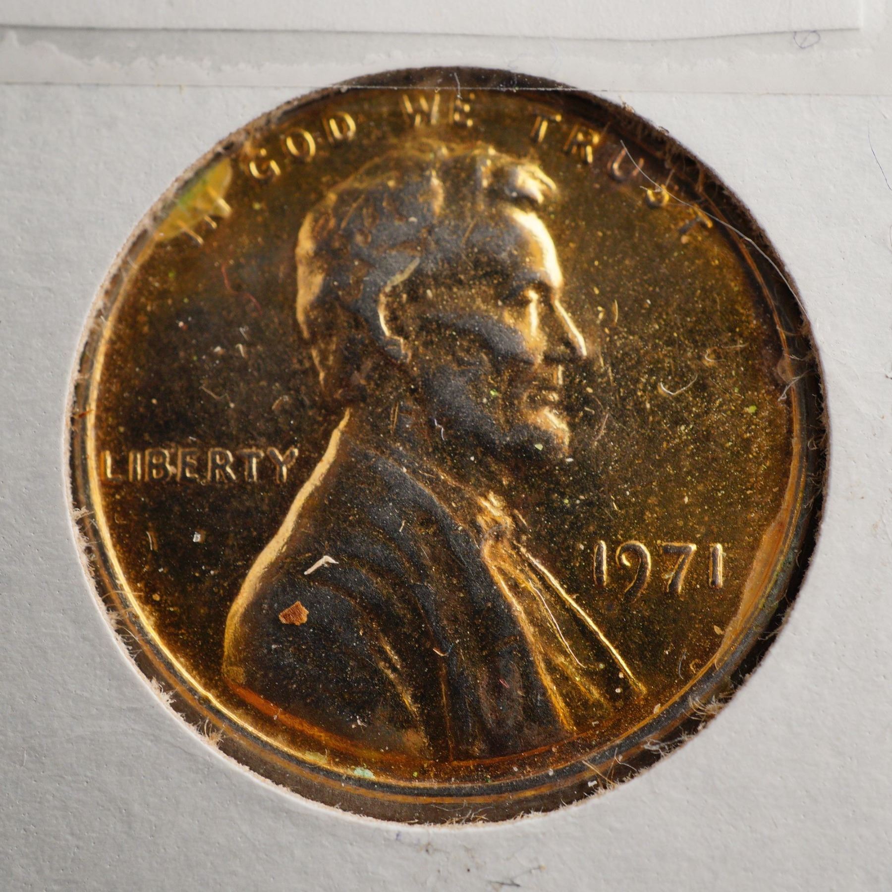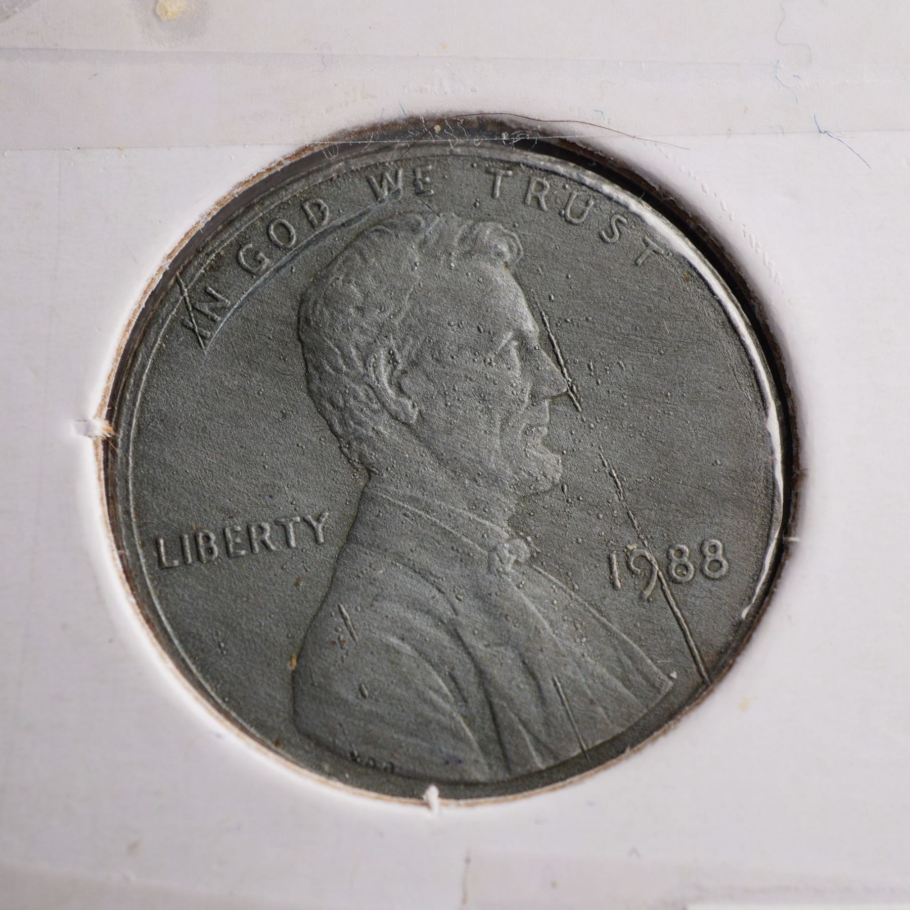 A collection of five US One Cent coins, commonly known as the Lincoln Memorial Cent, covering various dates from 1960-D, 1971, 1987, 1988, and 1994. The obverse features the Lincoln Portrait and the reverse features the Memorial Reverse design. All coins are designated as exhibiting a planchet lamination error.All housed in protective cardboard sleeves.