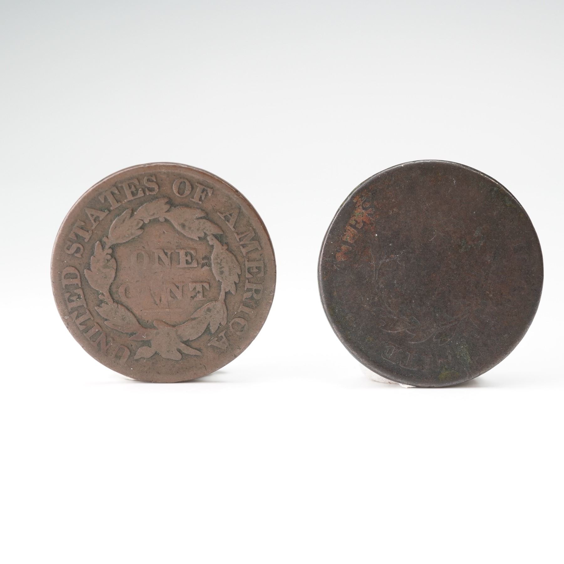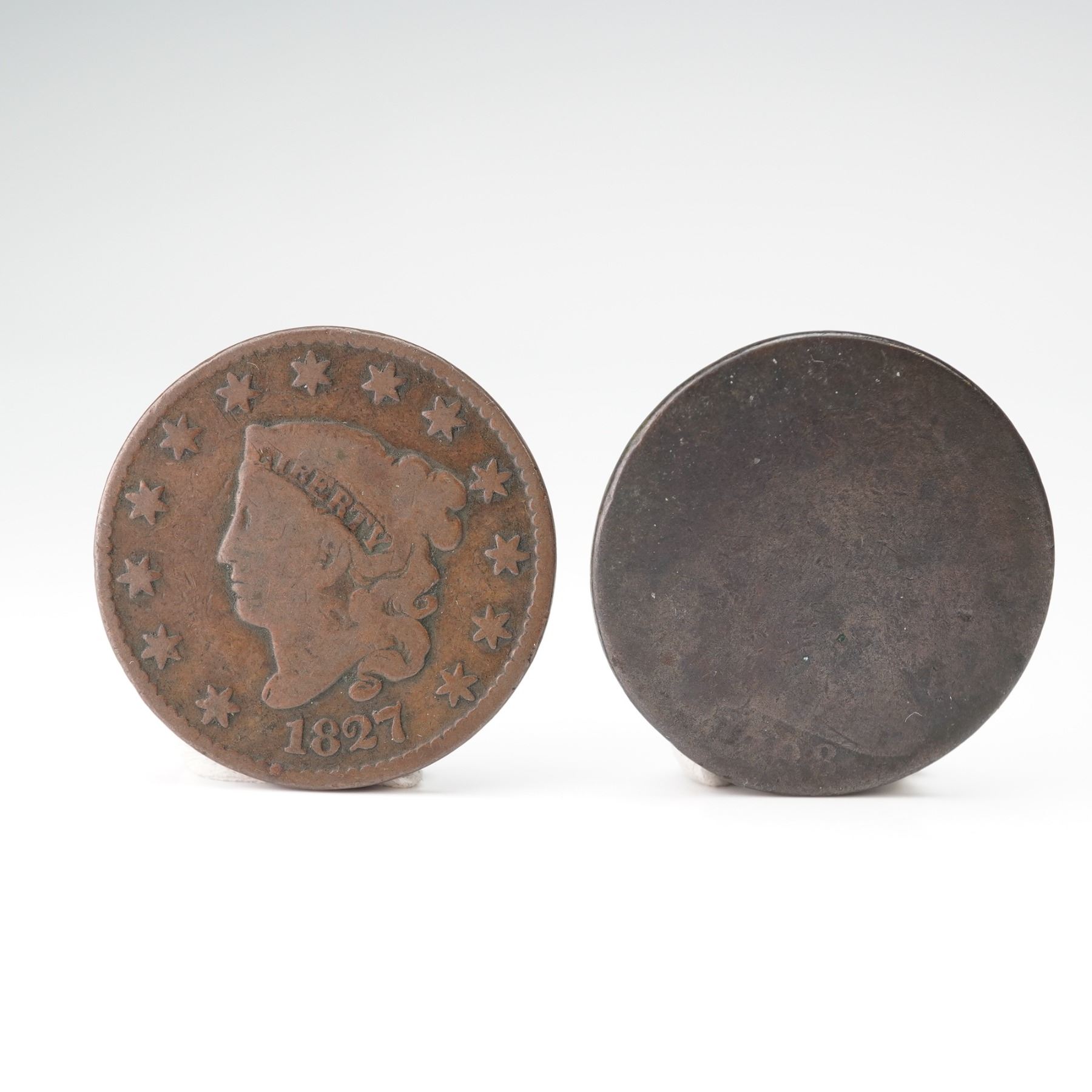 This 2 piece group includes early U.S. large cents from two distinct design eras. The first is a 1798 Draped Bust cent designed by Robert Scot, featuring Liberty facing right on the obverse with the inscription LIBERTY above and the date below. The reverse displays a laurel wreath encircling the denomination ONE CENT, with the fraction 1/100 below and the legend UNITED STATES OF AMERICA surrounding. The second coin is an 1827 Liberty Head (Matron Head) large cent, designed by Robert Scot and John Reich, showing Liberty facing left with 13 stars encircling the bust and the date below. Its reverse features ONE CENT within a wreath, encircled by UNITED STATES OF AMERICA. Both struck in copper, these early issues represent the evolution of U.S. cent design during the late 18th and early 19th centuries and remain highly collectible examples of early American coinage.