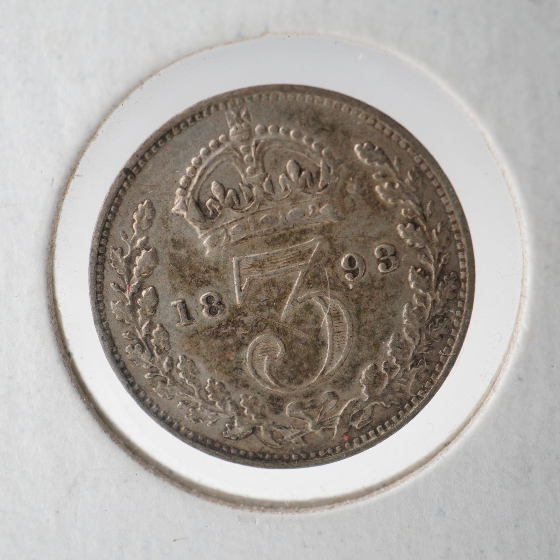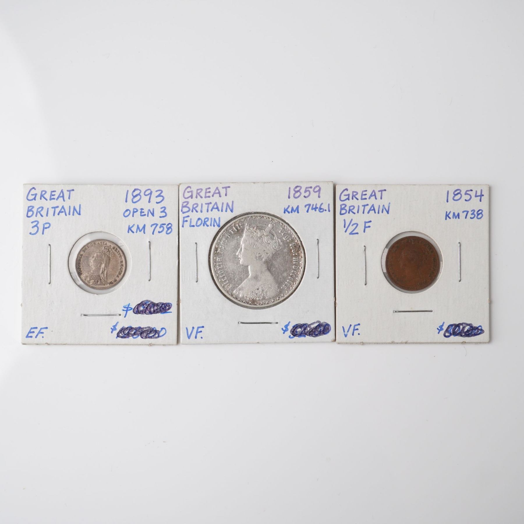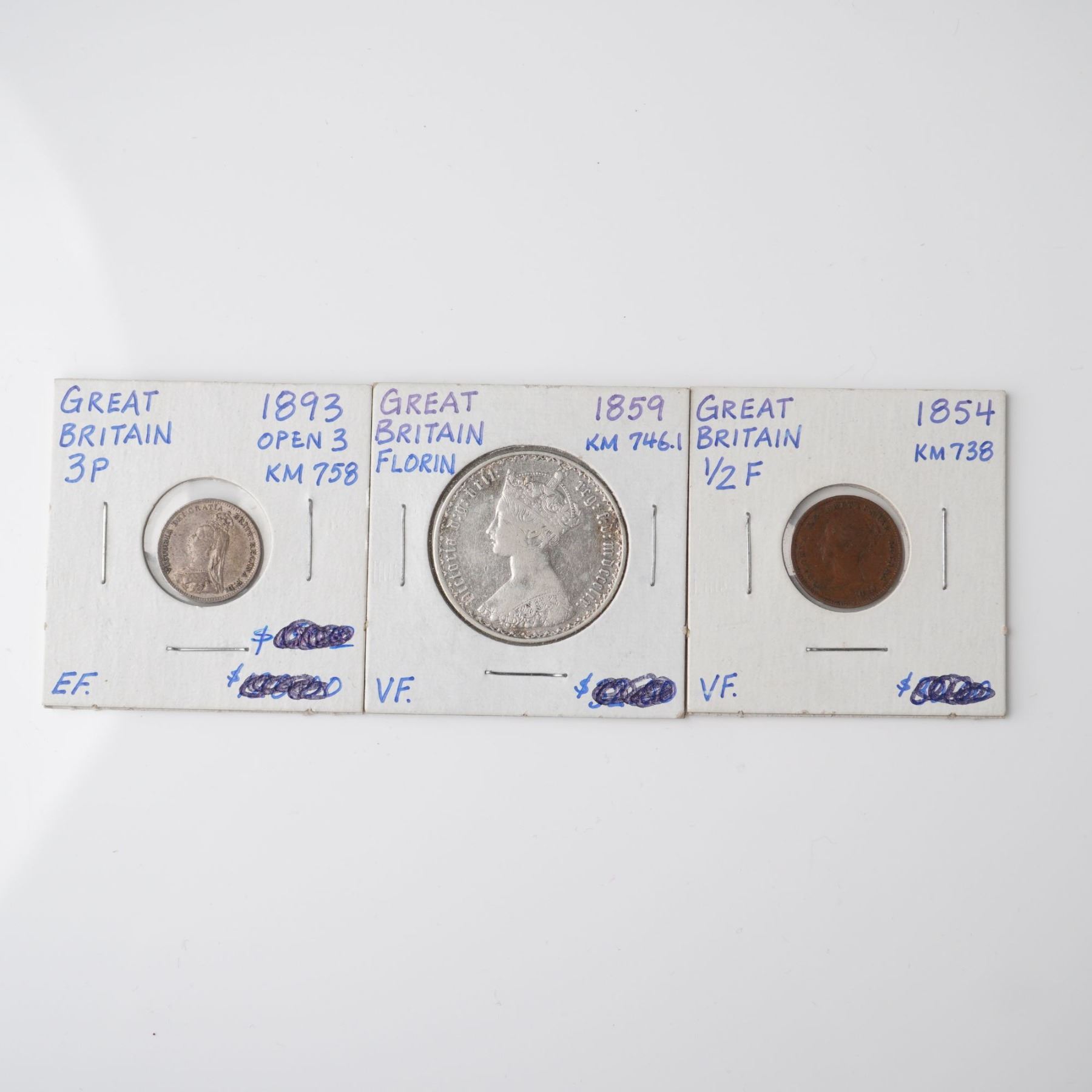 The 1854 Half Farthing, struck in bronze, features the crowned inscription HALF FARTHING and date on the reverse, with the young head portrait of Queen Victoria and legend VICTORIA D:G: BRITANNIAR: REGINA F:D: on the obverse. The 1893 silver 3 Pence bears the crowned numeral 3 surrounded by a wreath and the date on the reverse, while the obverse depicts Queen Victoria's veiled bust with the inscription VICTORIA DEI GRATIA BRITT: REG: F:D:. The Gothic Florin, struck in .925 fine silver and weighing approximately 11.3 grams, was minted at the Royal Mint in London. Its obverse presents the crowned bust of Queen Victoria facing left with a finely detailed lace collar and gothic legend VICTORIA D:G: BRITT: REG: F:D:, while the reverse displays a cruciform arrangement of crowned shields representing England, Scotland, and Ireland, with the surrounding inscription ONE FLORIN ONE TENTH OF A POUND.