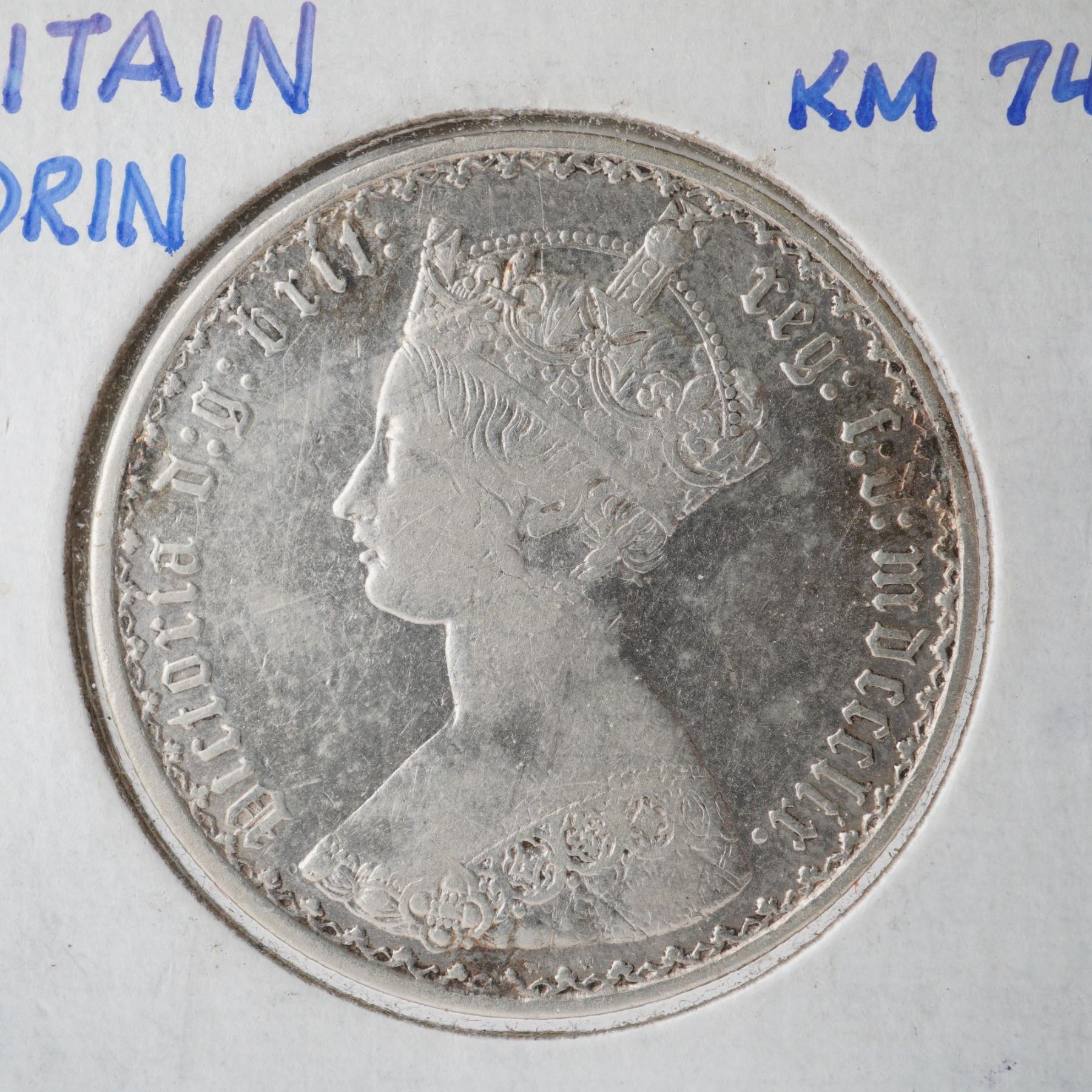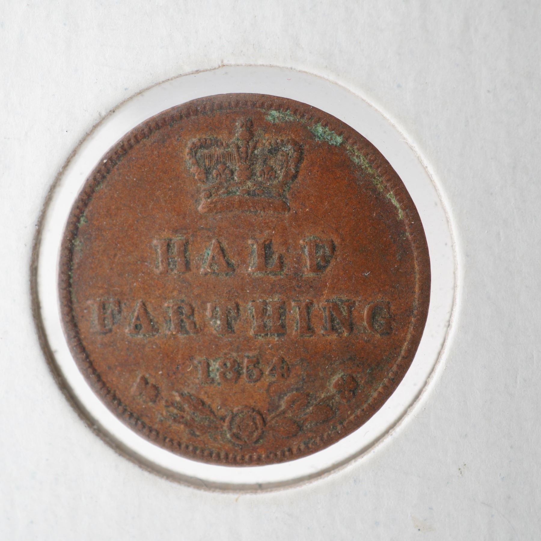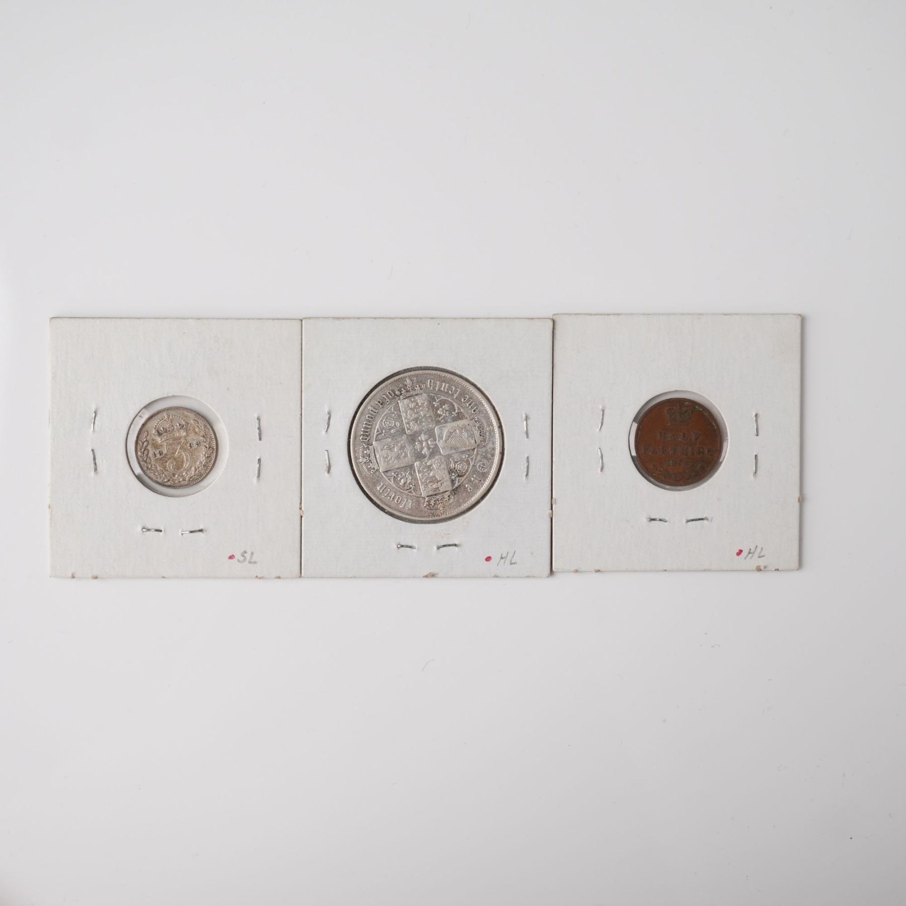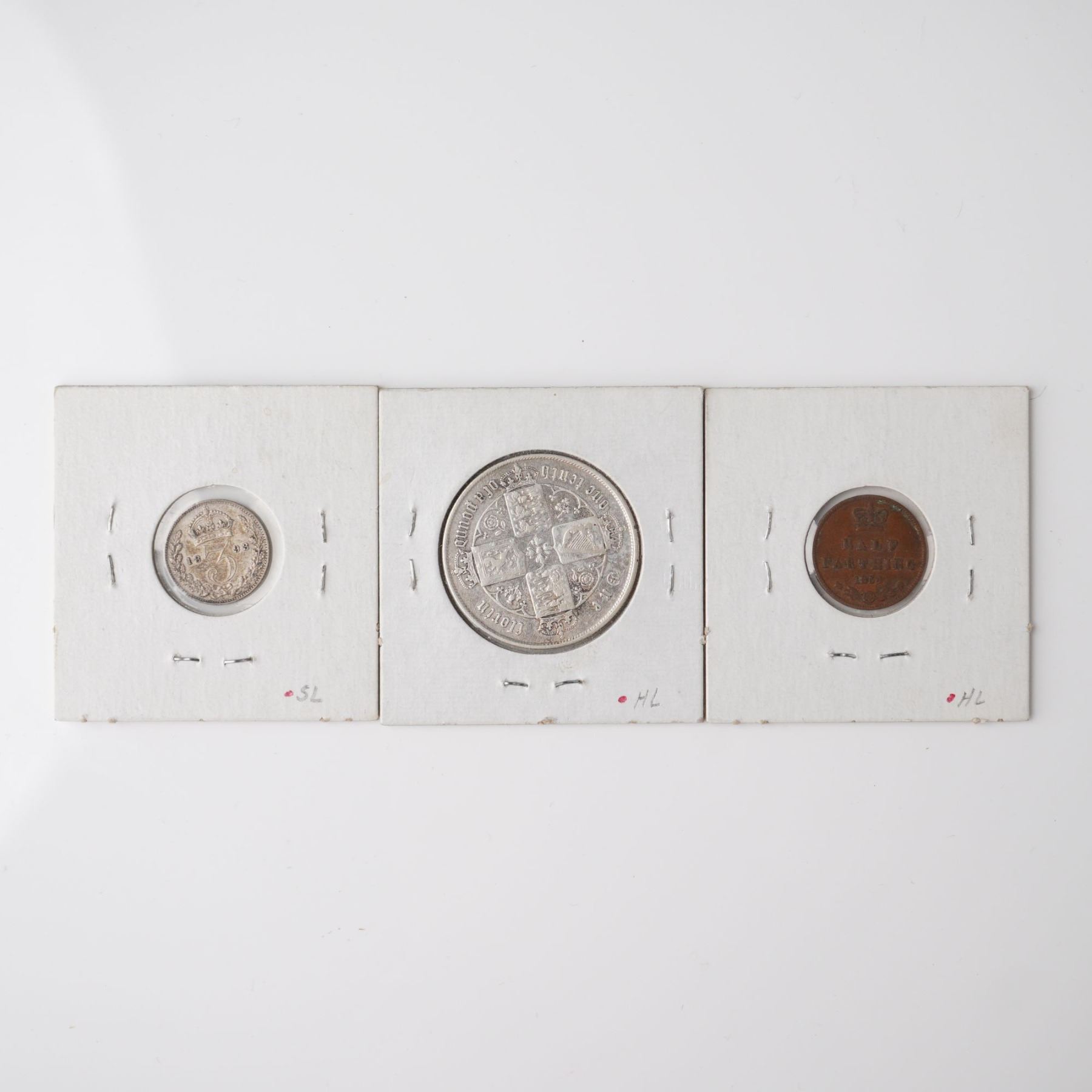 Lot 323 3pc 1854 to 1893 British Half Farthing, 3 Pence, & Gothic Type Florin