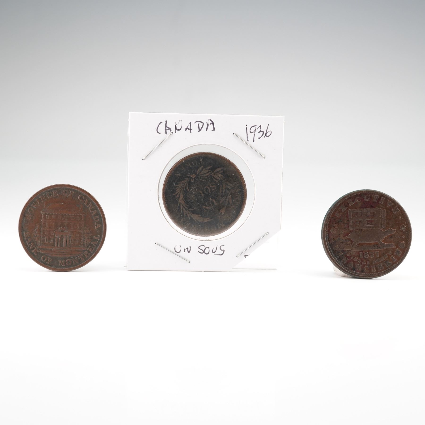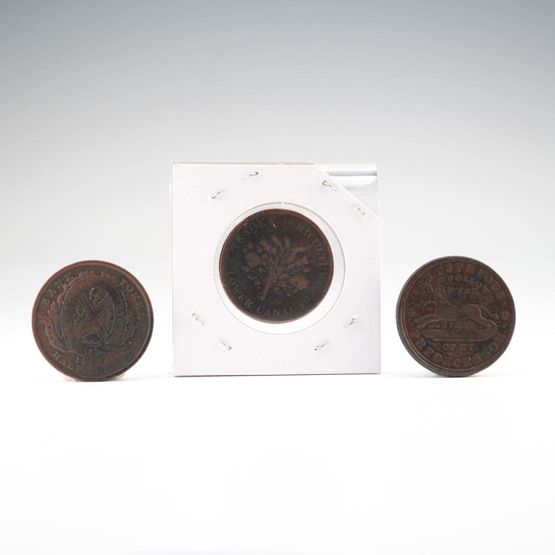 This lot includes a Bank of Montreal Half Penny Token, a Bank of Montreal One Sou Token, and an Illustrious Predecessor Hard Times Token. The Bank of Montreal pieces feature the bank building and provincial arms, while the American token shows a turtle carrying a trunk on one side and a donkey on the other. Together, these coins represent the diverse coinage and token circulation that shaped North American trade and politics.