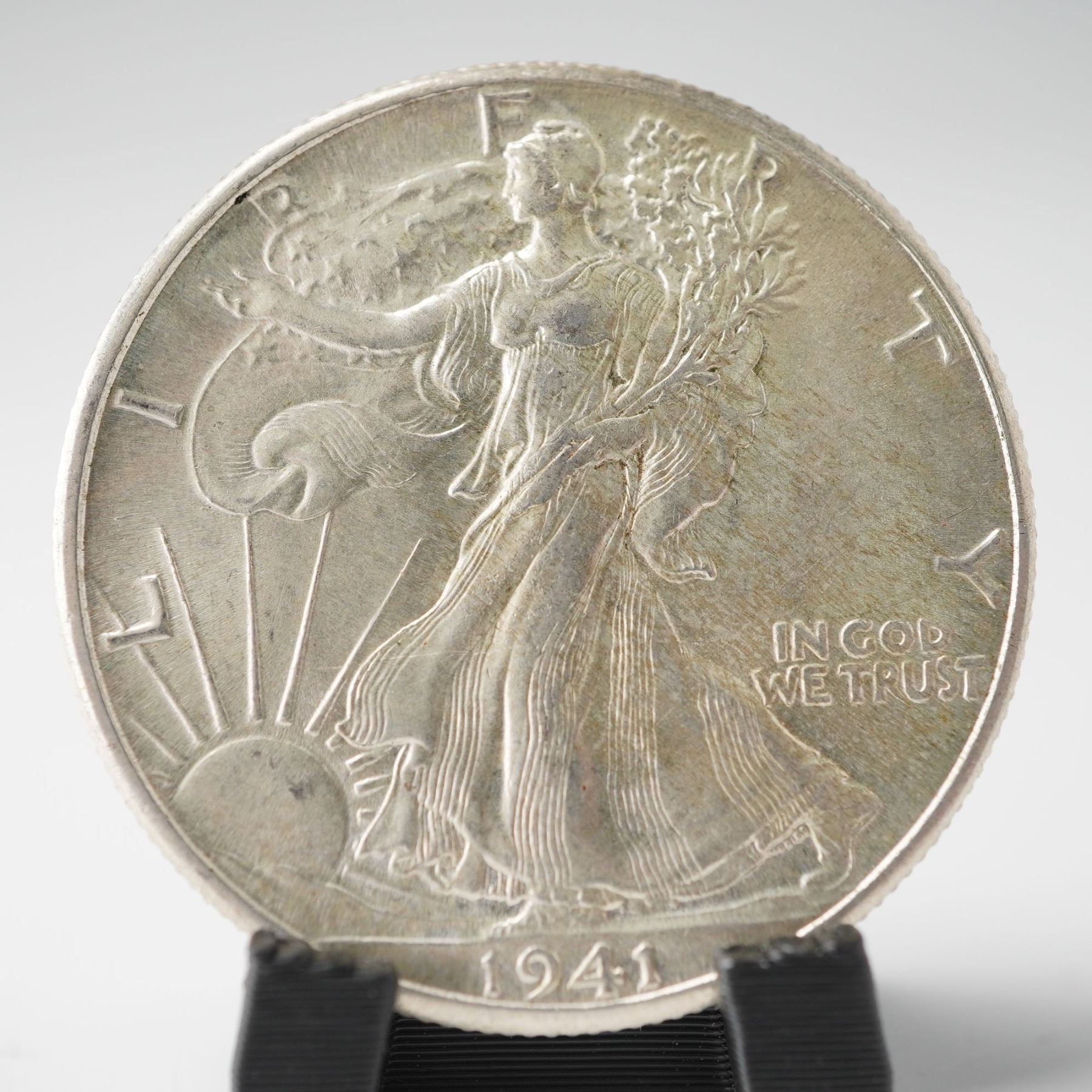 All coins composed of .900 fine silver alloy. Includes a 1941, a 1943, 2 1945, and a 1946. Each obverse features Liberty striding toward the dawn draped in the American flag, with the date below and LIBERTY above. The reverse depicts a defiant bald eagle perched upon a mountain crag, along with UNITED STATES OF AMERICA above and the denomination below.