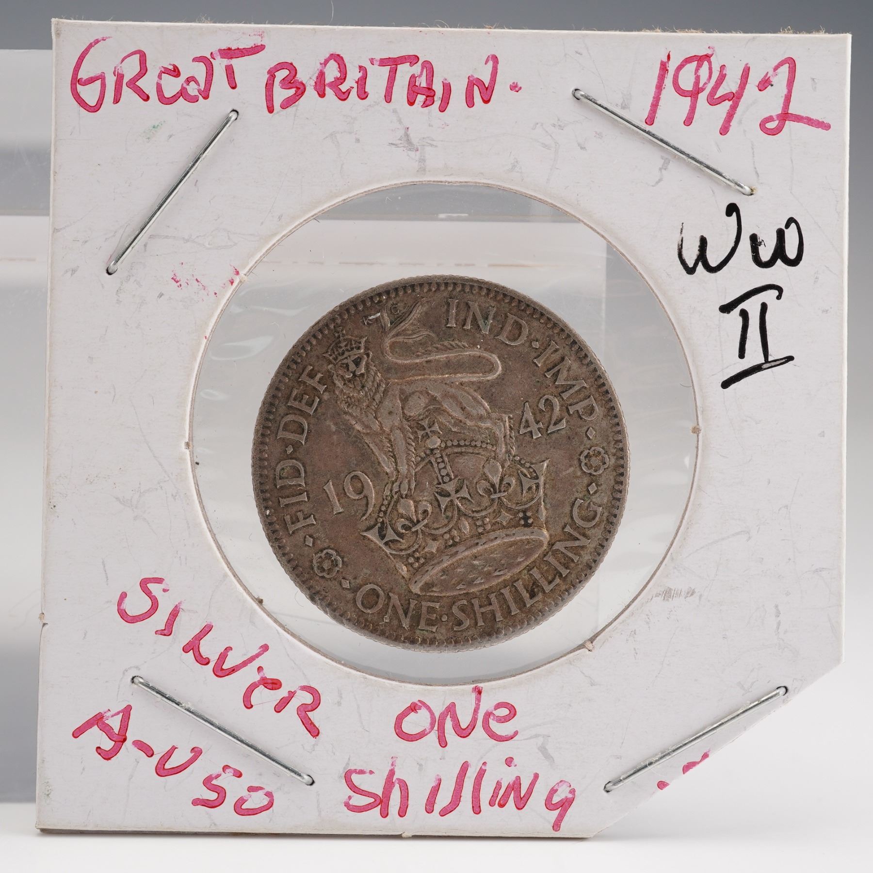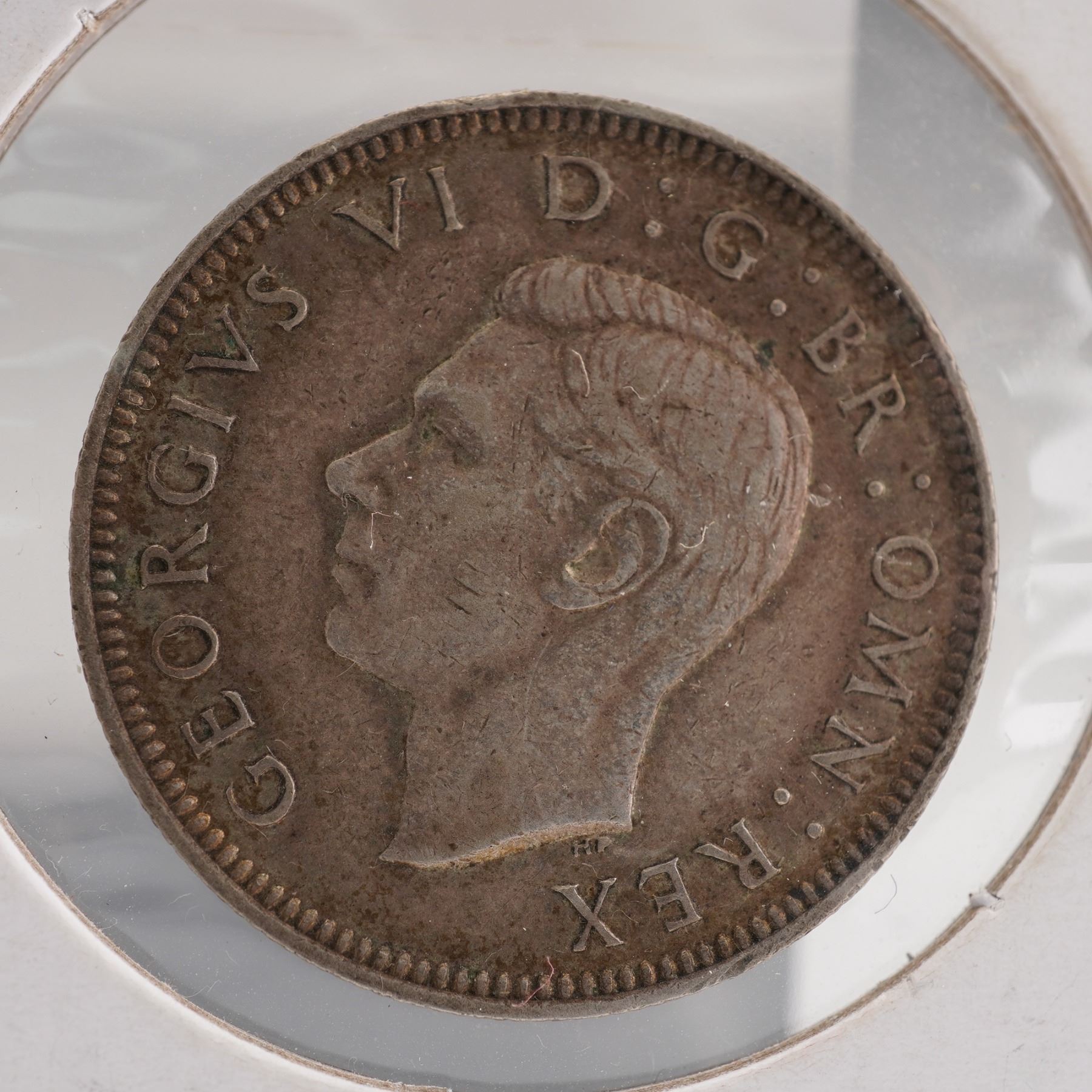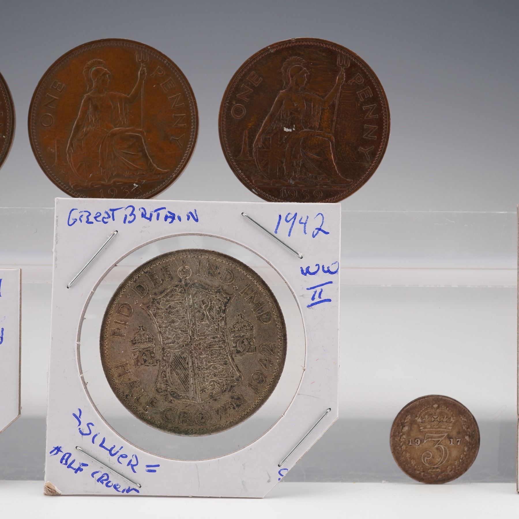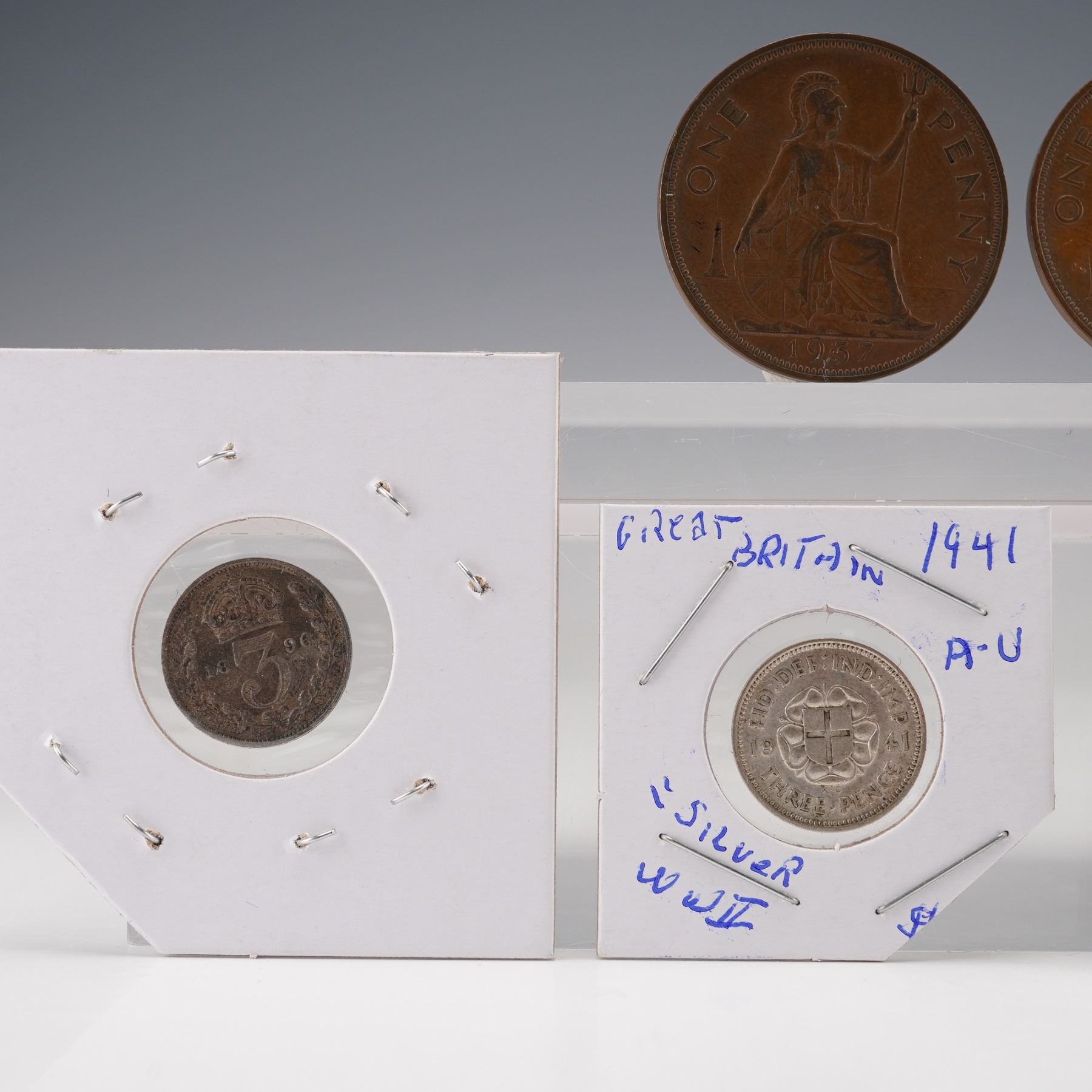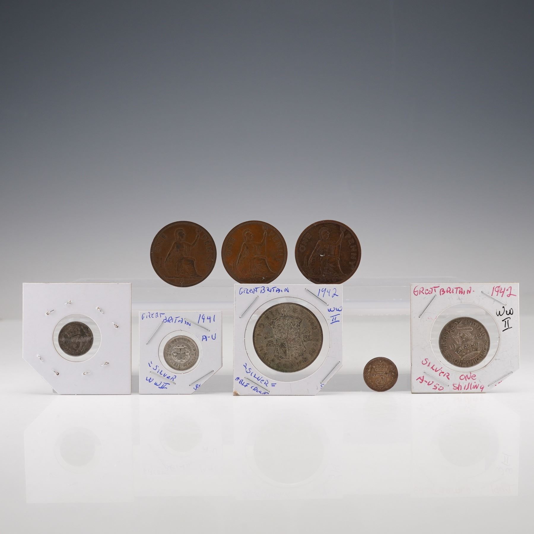 Including an 1896 silver 3 pence featuring the crowned value on the reverse and the portrait of Queen Victoria on the obverse; a George V silver 3 pence with crowned numeral and royal cipher; a George VI silver 3 pence dated 1941 with the crowned thrift plant design; a George VI silver one shilling dated 1942 depicting the lion atop the crown with inscriptions FID DEF IND IMP and ONE SHILLING; a George VI silver half crown dated 1942 with the quartered shield of England, Scotland, and Ireland; a bronze George VI penny with Britannia seated on the reverse; a second bronze penny of similar design; and an additional bronze small-denomination coin showing the crowned value on the reverse. All pieces display the respective monarchs' portraits on the obverse with inscriptions in Latin identifying their titles.