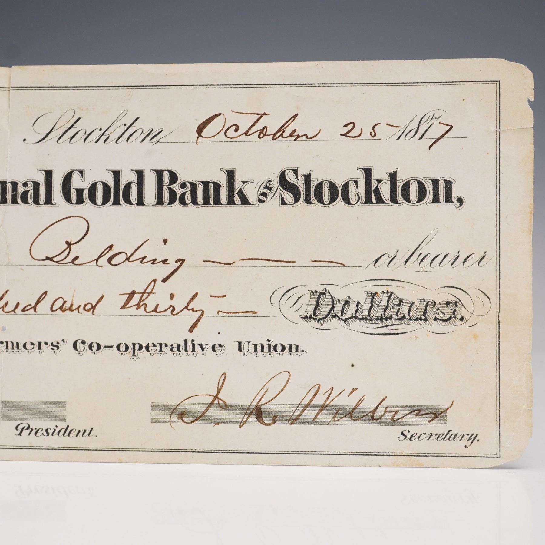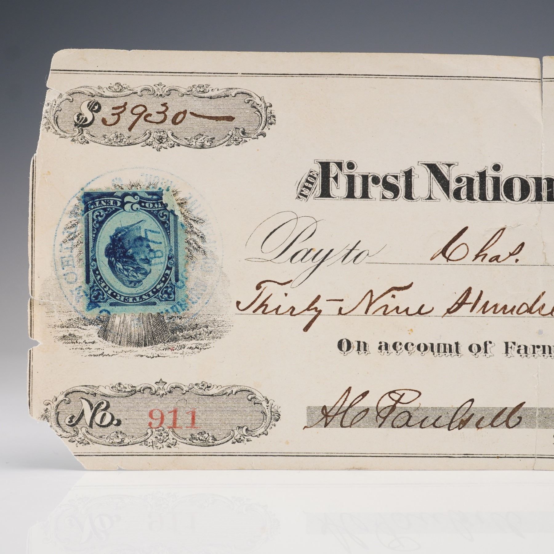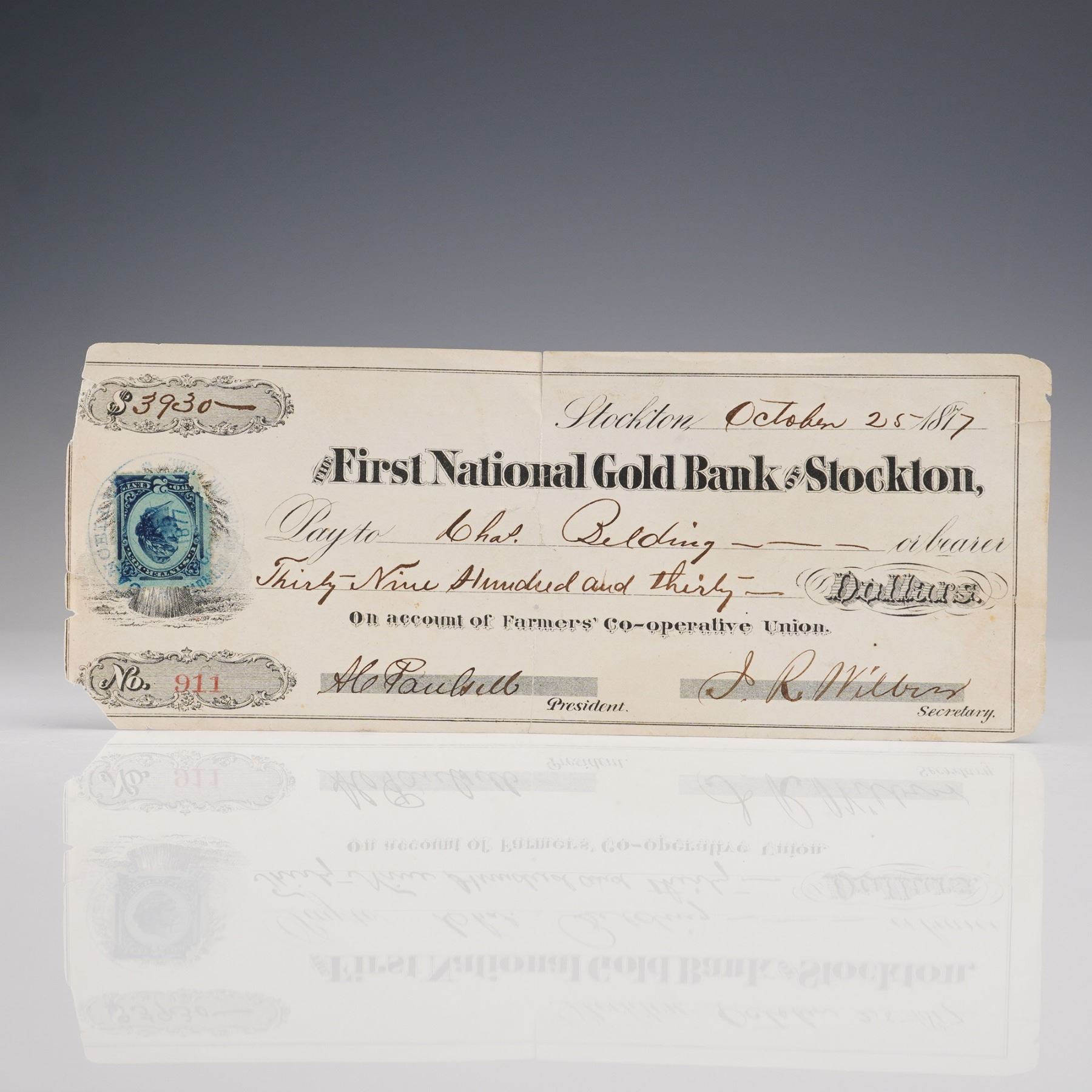 An original dated October 25, 1877, bank draft issued by the First National Gold Bank of Stockton, California. Made payable to Chas. Belding in the amount of $3,930, this historic financial document was drawn on behalf of the Farmers' Co-operative Union. The check is printed with intricate border designs, and it features an affixed blue two-cent revenue stamp. Signatures of the bank's president and secretary, A.C. Paulsell and J.R. Wilson respectively, appear in ink along the lower edge. Document is numbered 911 on the lower left corner.