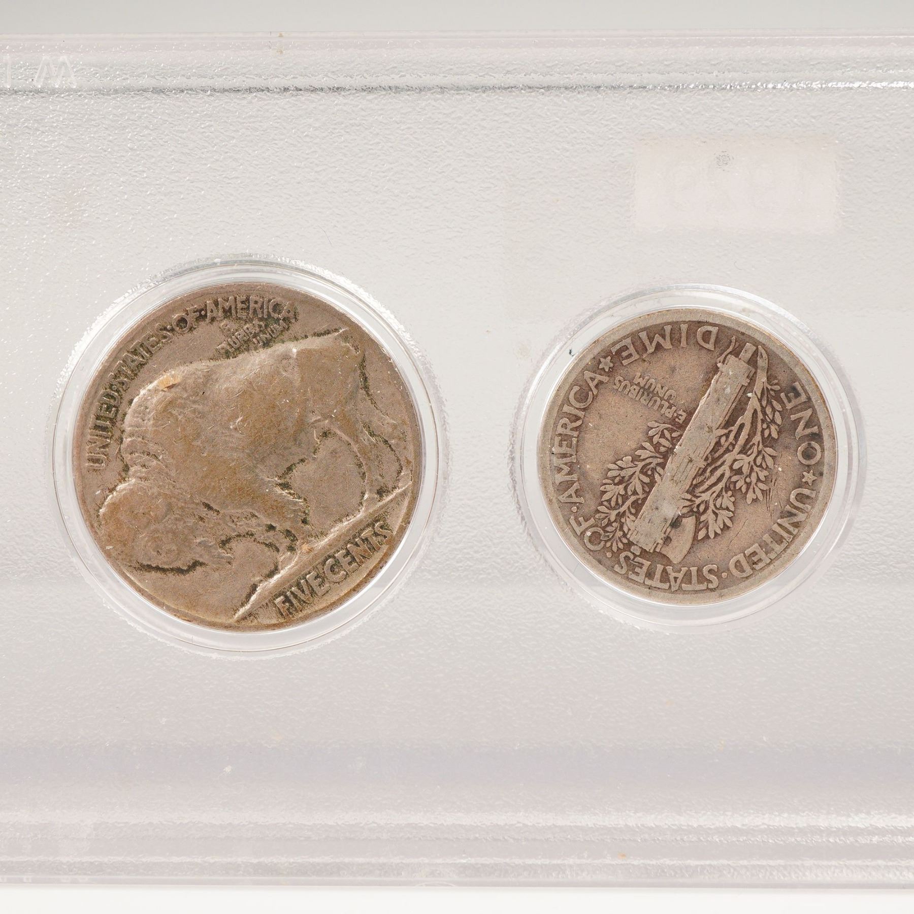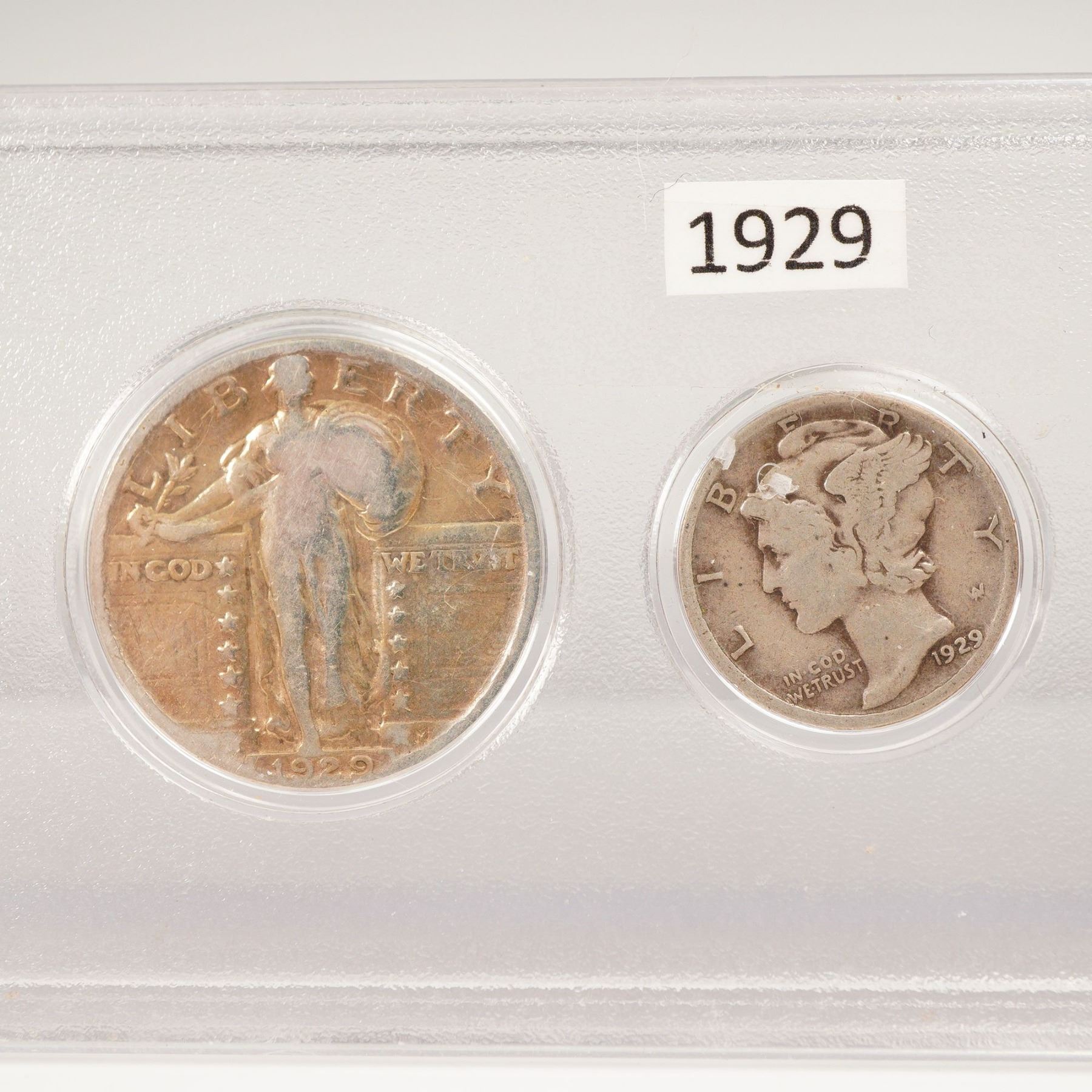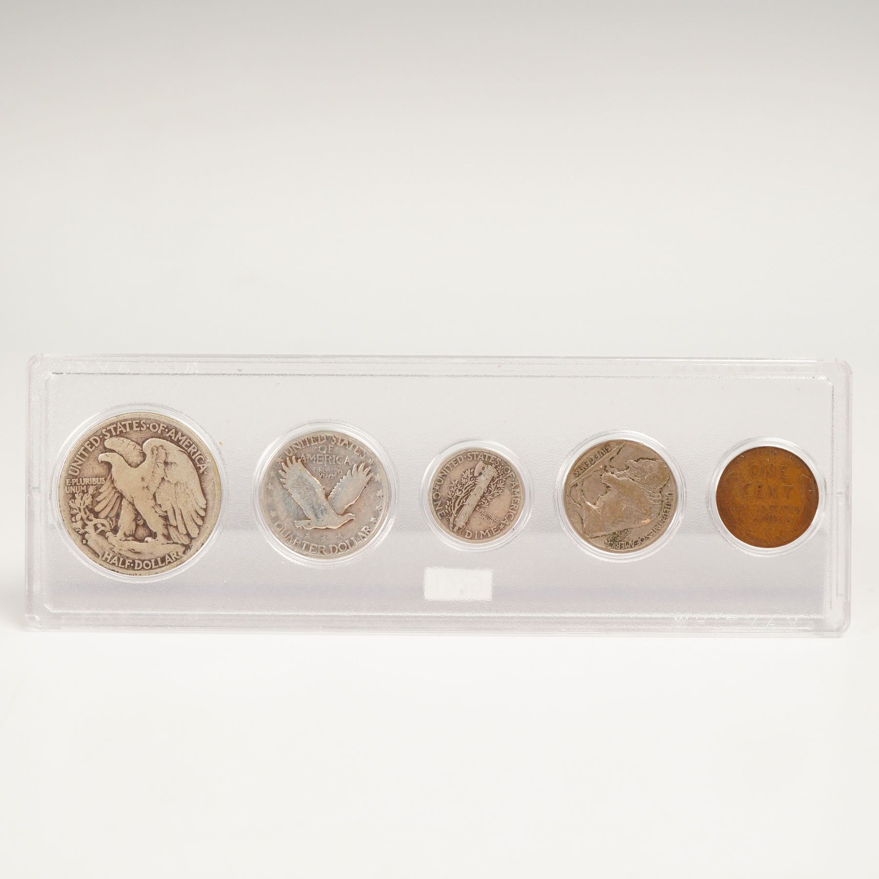 Comprises five United States coins dated 1929, including a Walking Liberty half dollar, a Standing Liberty quarter, a Mercury dime, a Buffalo nickel, and a Lincoln wheat cent. The Walking Liberty and Lincoln Cent bear the "S" mintmark signifying its San Francisco origin. The coins are enclosed in a Whitman holder.