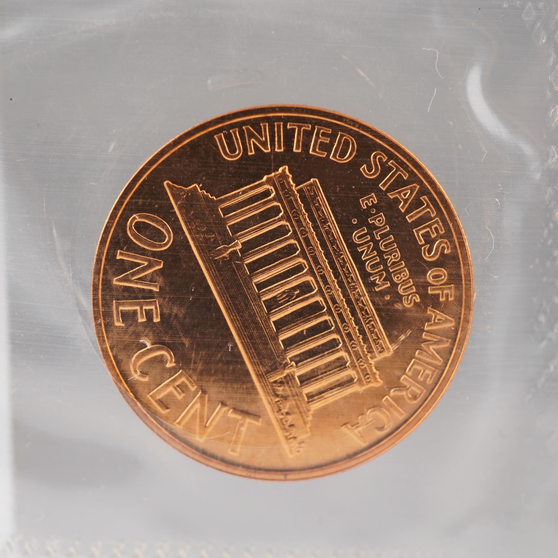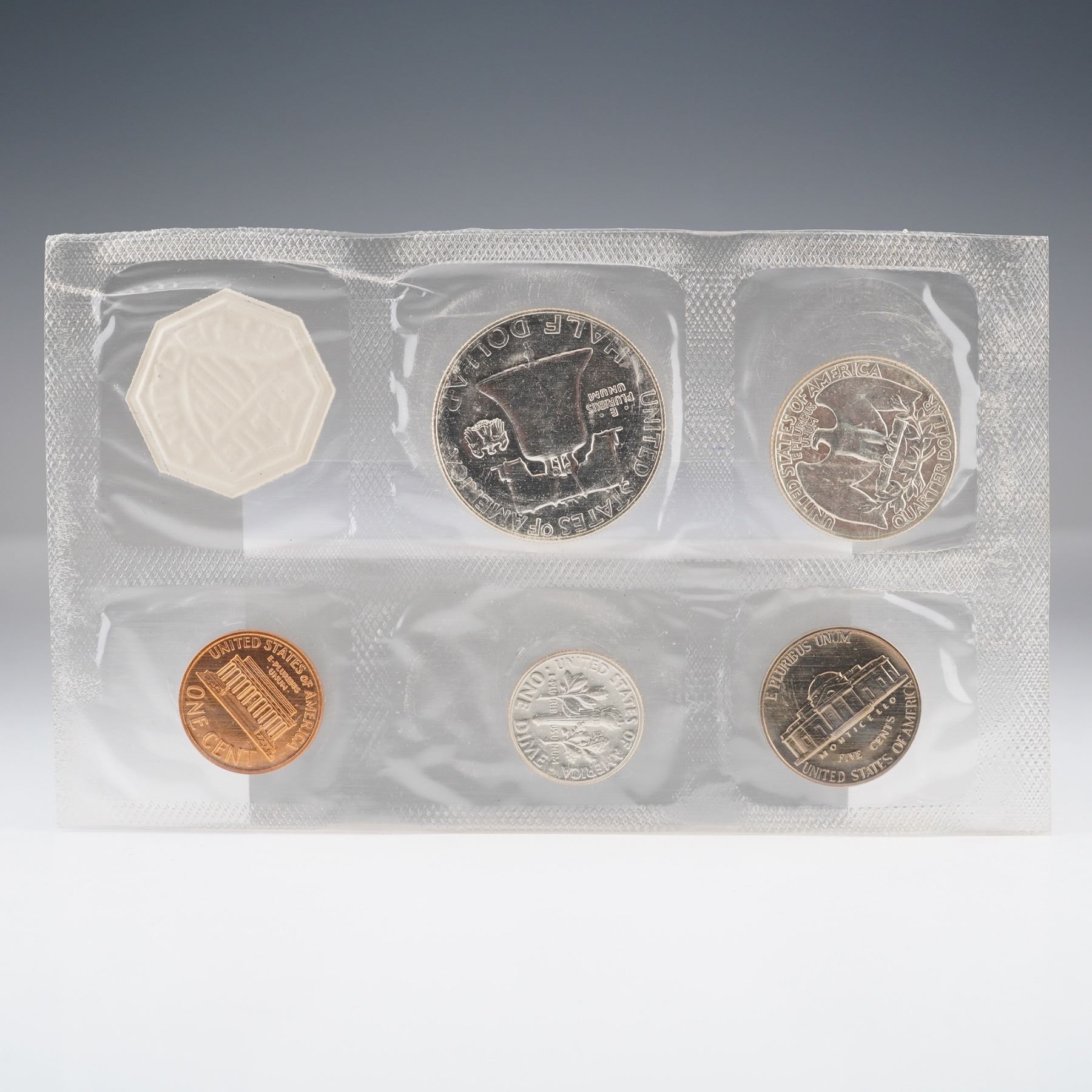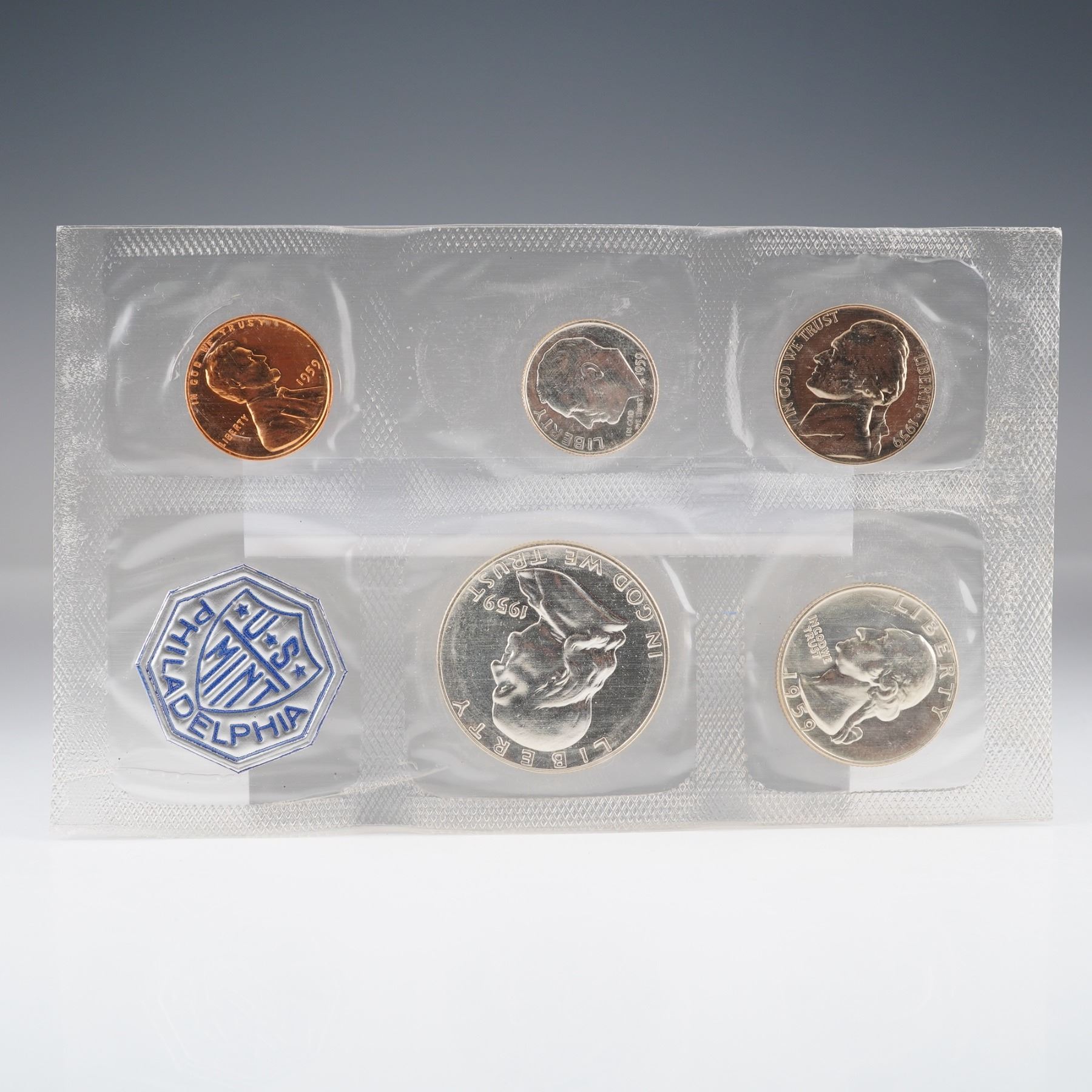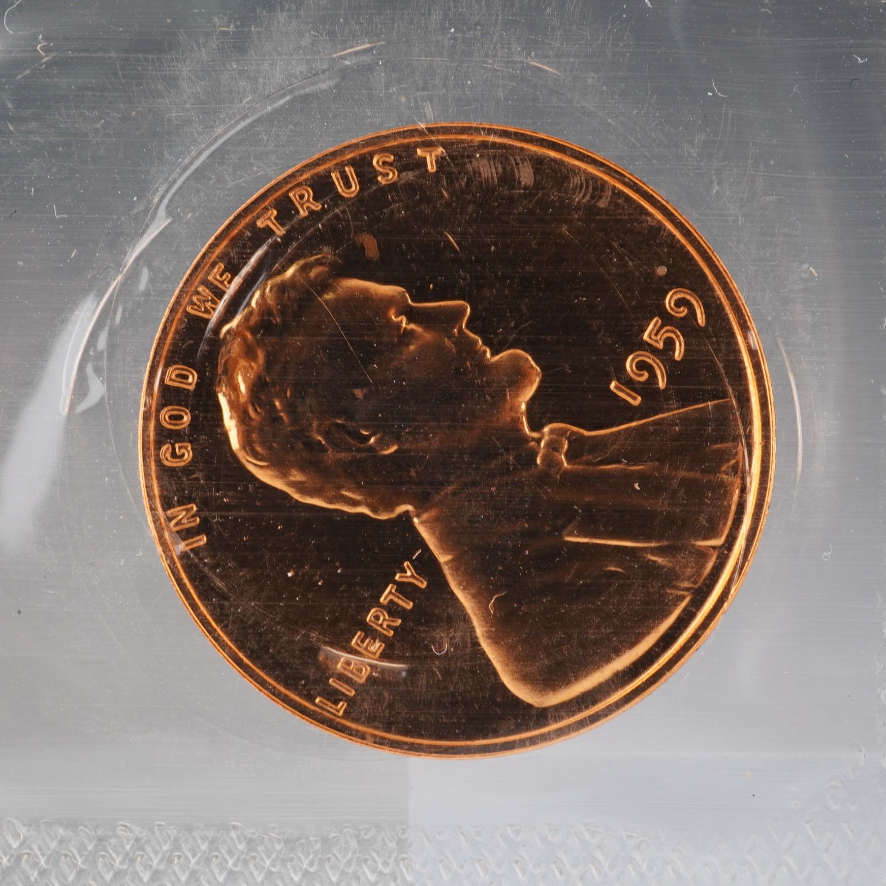 This 1959 United States Mint Proof Set, produced at the Philadelphia Mint. It contains five proof struck coins; Jefferson nickel, Roosevelt dime, Washington quarter, and Franklin half dollar. Included with the coin set is the distinctive blue U.S. Mint Philadelphia insignia. Each exhibiting the reflective surfaces and precision detail characteristic of early modern proof coinage. The coins and emblem is encased within the original cellophane packaging.