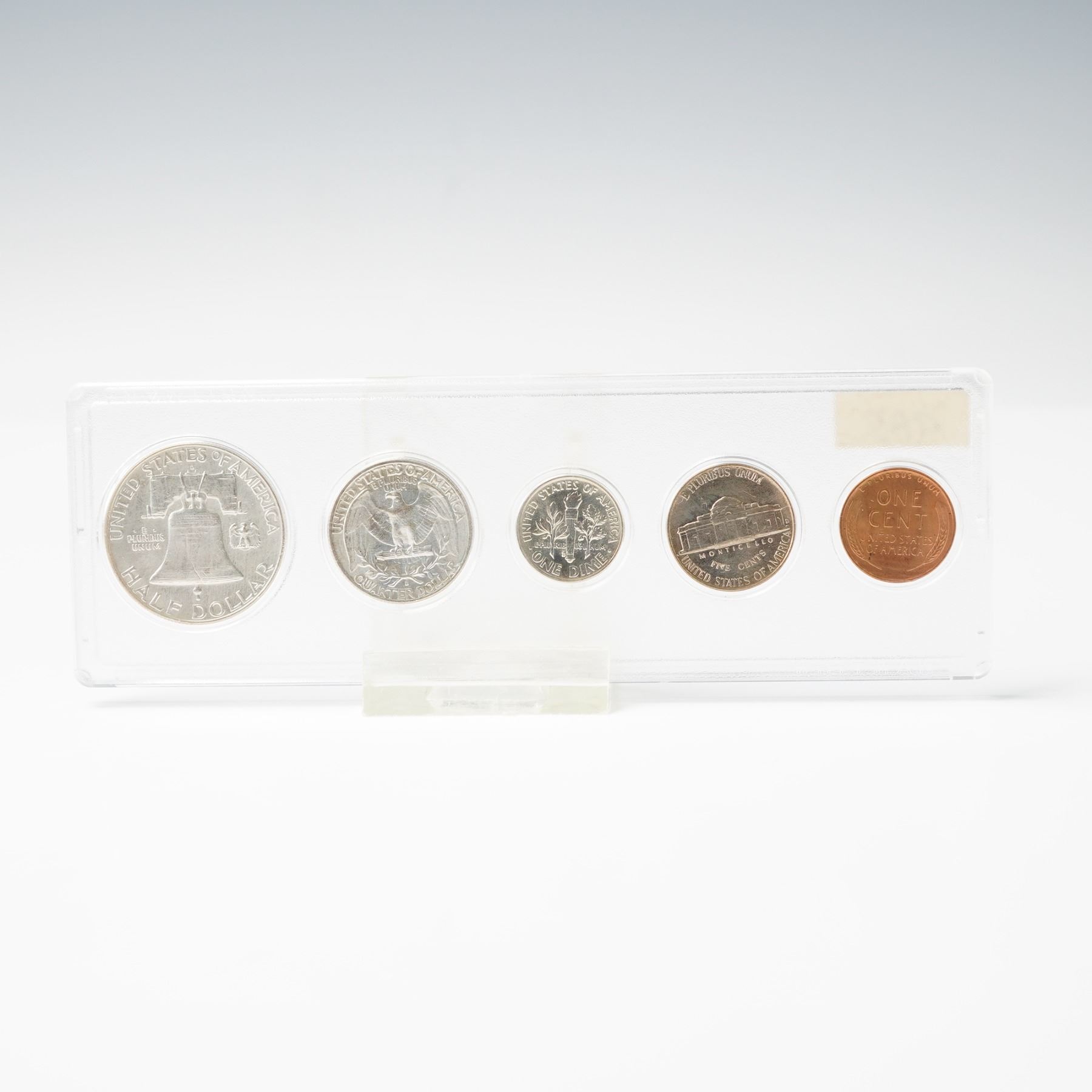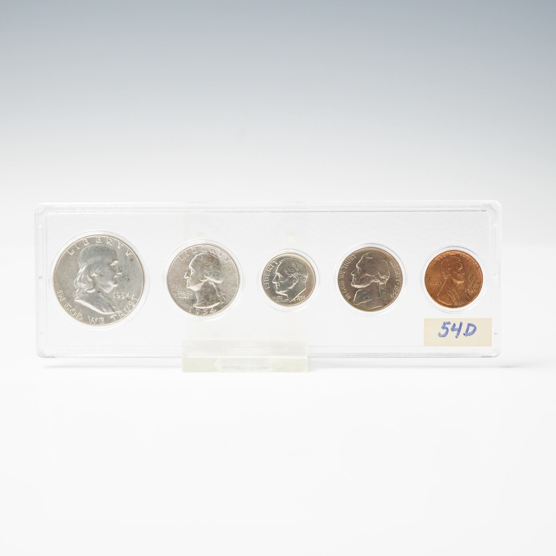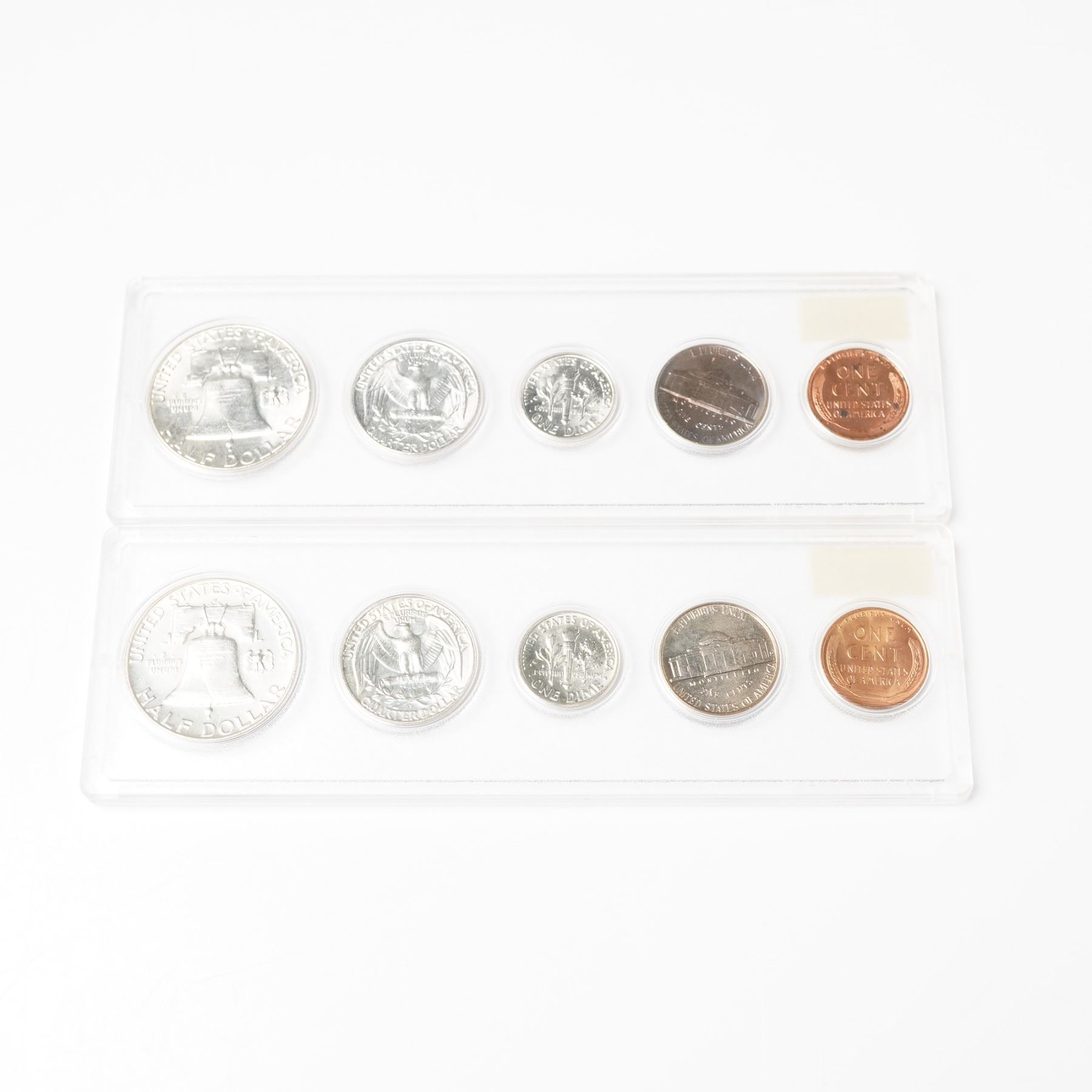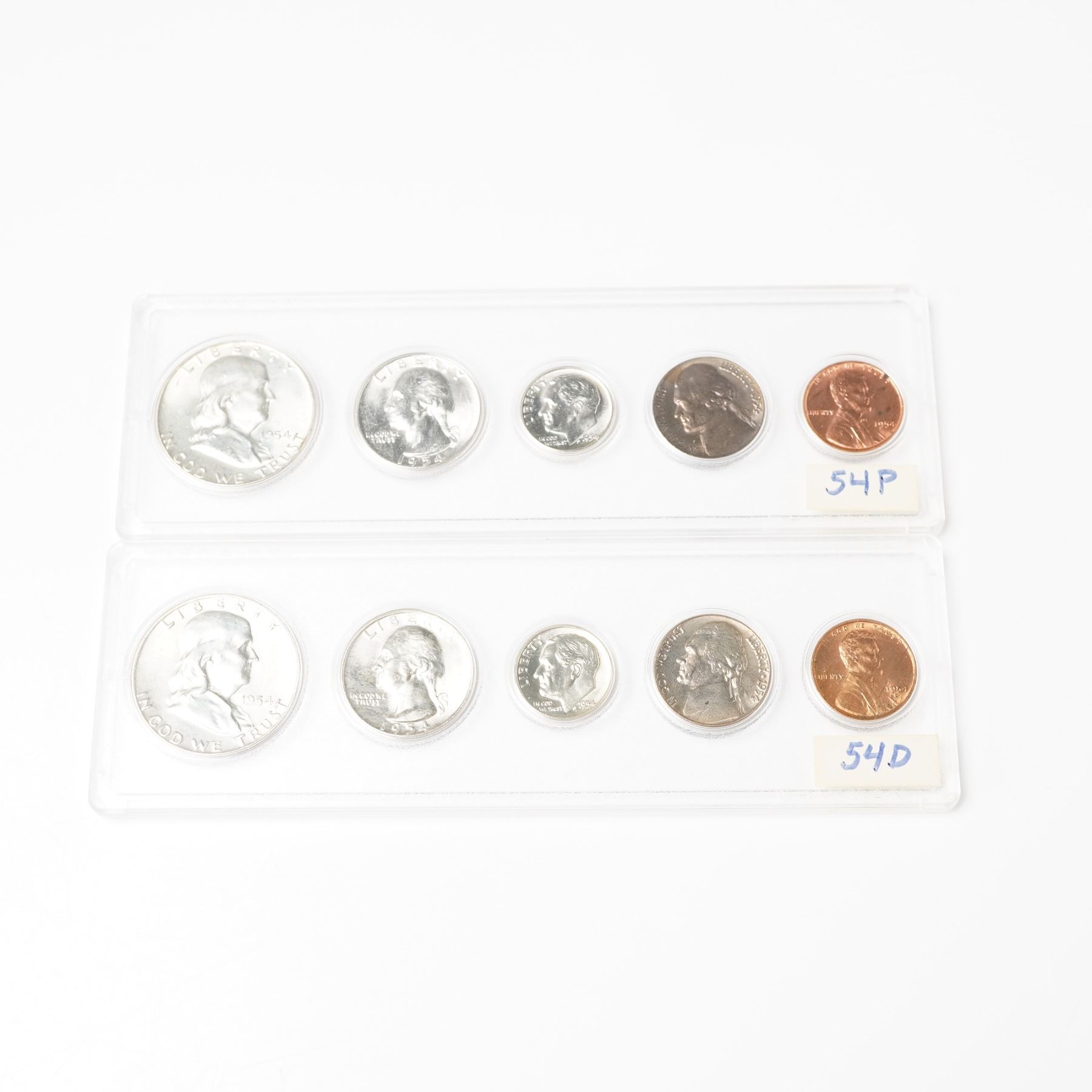 Includes a 1954-D and a 1954, each are a completed set including the Franklin Half Dollar, Washington Quarter, Roosevelt Dime, Jefferson Nickel, and Lincoln Cent. The fractional denominations; the half dollar, quarter, and dime are struck from the statutory .900 fine silver alloy. The coins are enclosed in a Whitman slab.