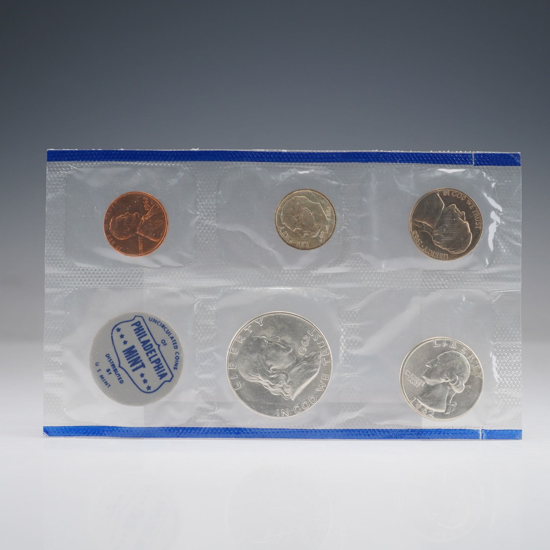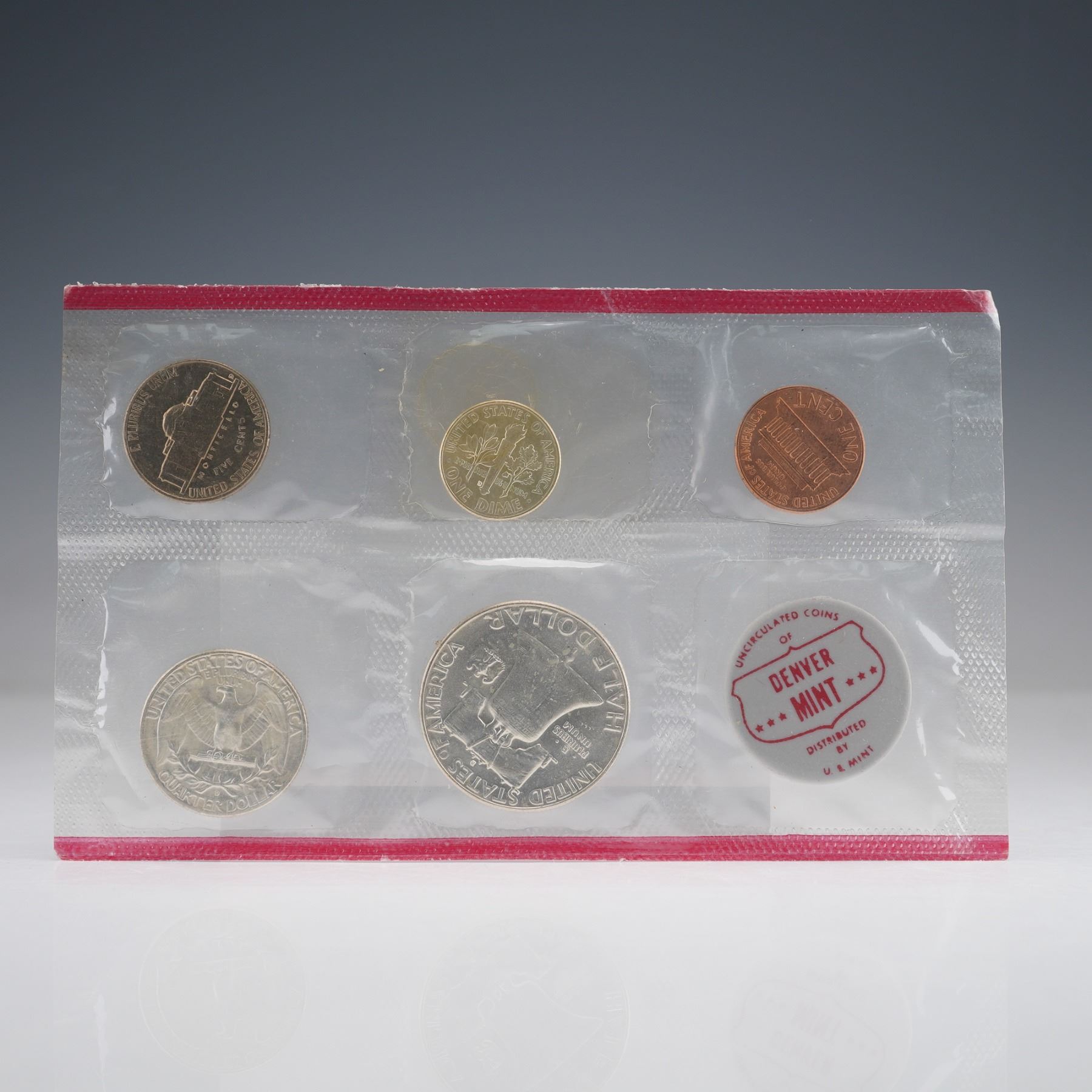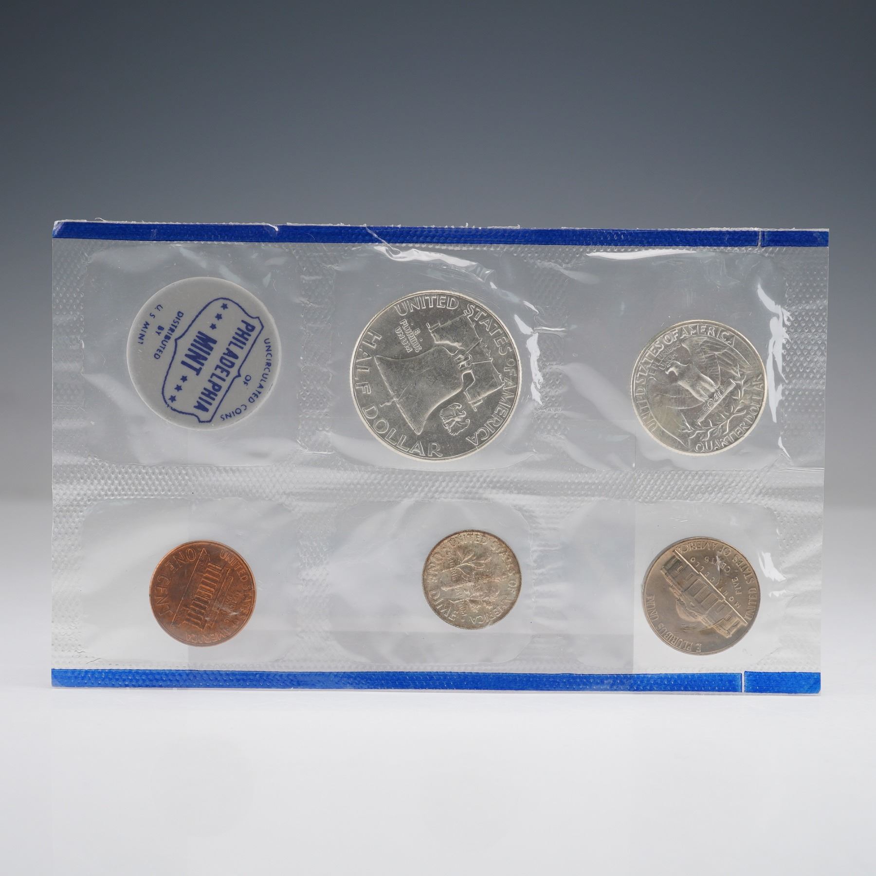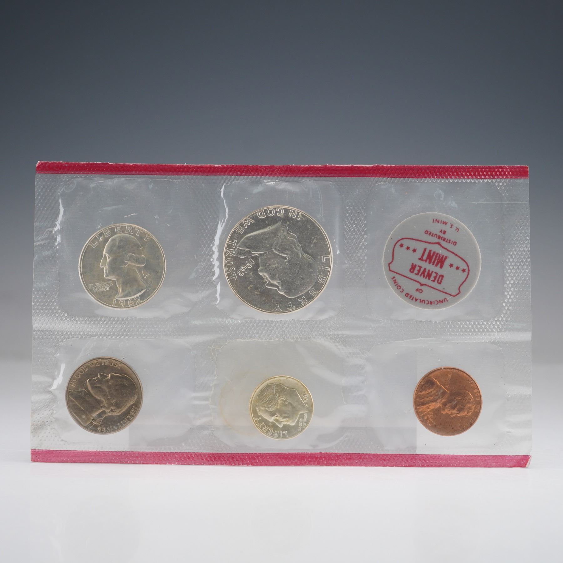 This 1962 United States Mint Uncirculated Coin Set includes two complete groups of five coins each, representing both the Philadelphia and Denver Mints. The set contains the Lincoln cent, Jefferson nickel, Roosevelt dime, Washington quarter, and Franklin half dollar from each mint. Included in each set is respective mint emblems. Each coin exhibits full mint luster and crisp detail, exemplifying the superior production quality of early 1960s U.S. coinage. The coins and emblem is encased within the original cellophane packaging.
