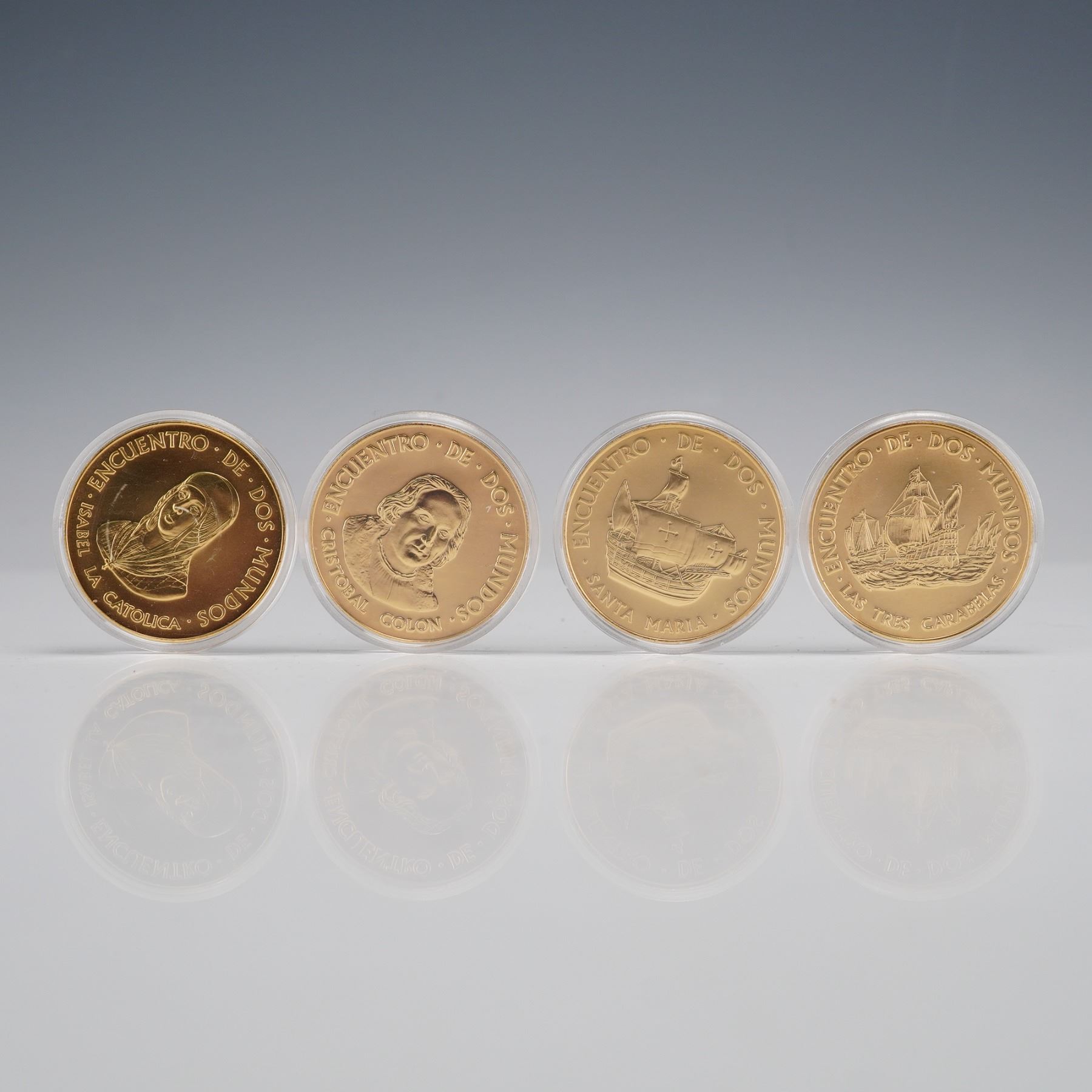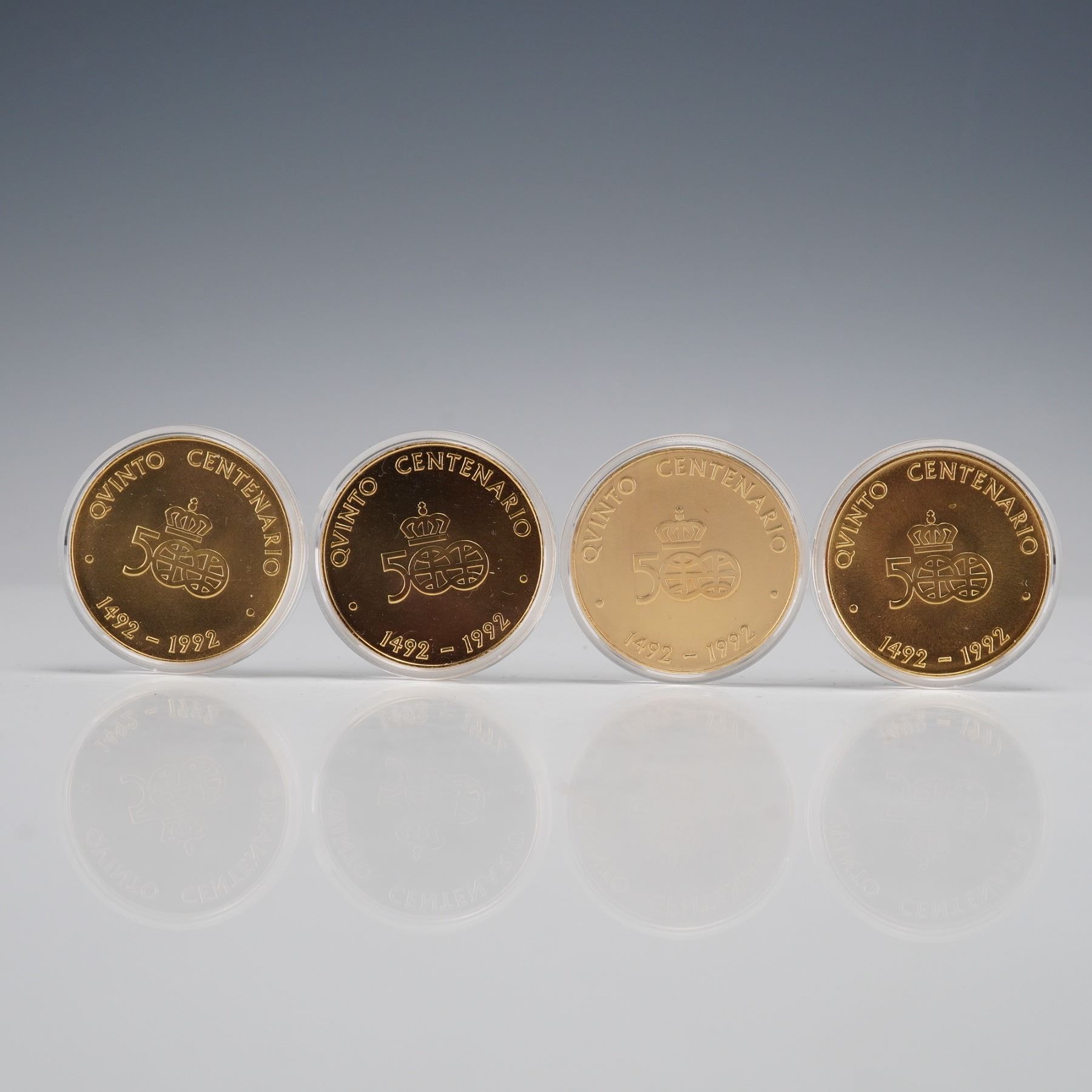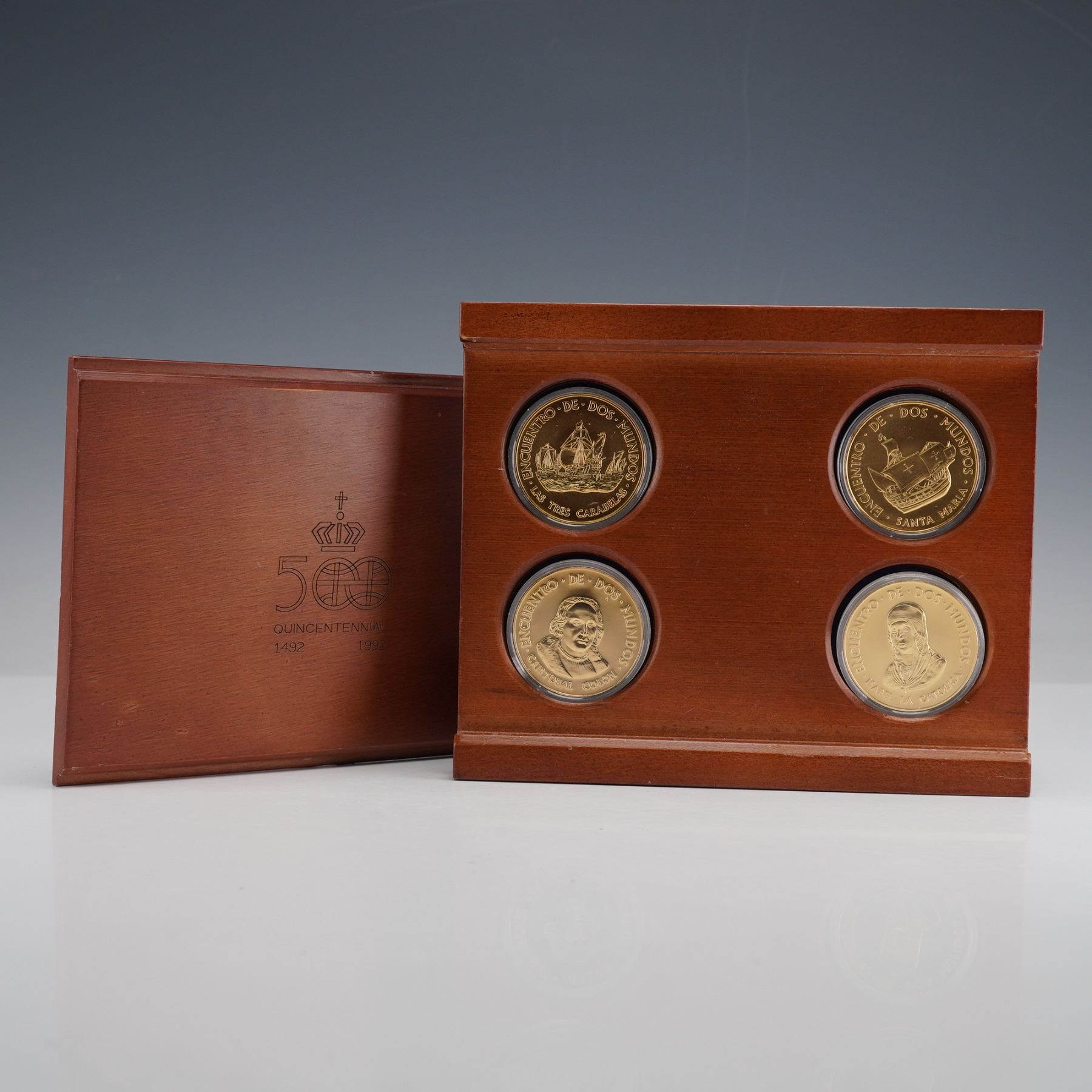 A four piece commemorative coin set issued for the Quincentenary of the Encounter of Two Worlds, dated 1492 to 1992. The group includes four round coins housed in individual protective capsules and presented in the original fitted wooden case. Designs feature portraits of Queen Isabella and Christopher Columbus along with ships from the 1492 voyage, including the Santa Maria and Las Tres Carabelas. The reverse of each coin displays the crowned 500 emblem with Quincentenary inscriptions and the commemorative dates. This lot includes all four coins and the wooden presentation case as shown.