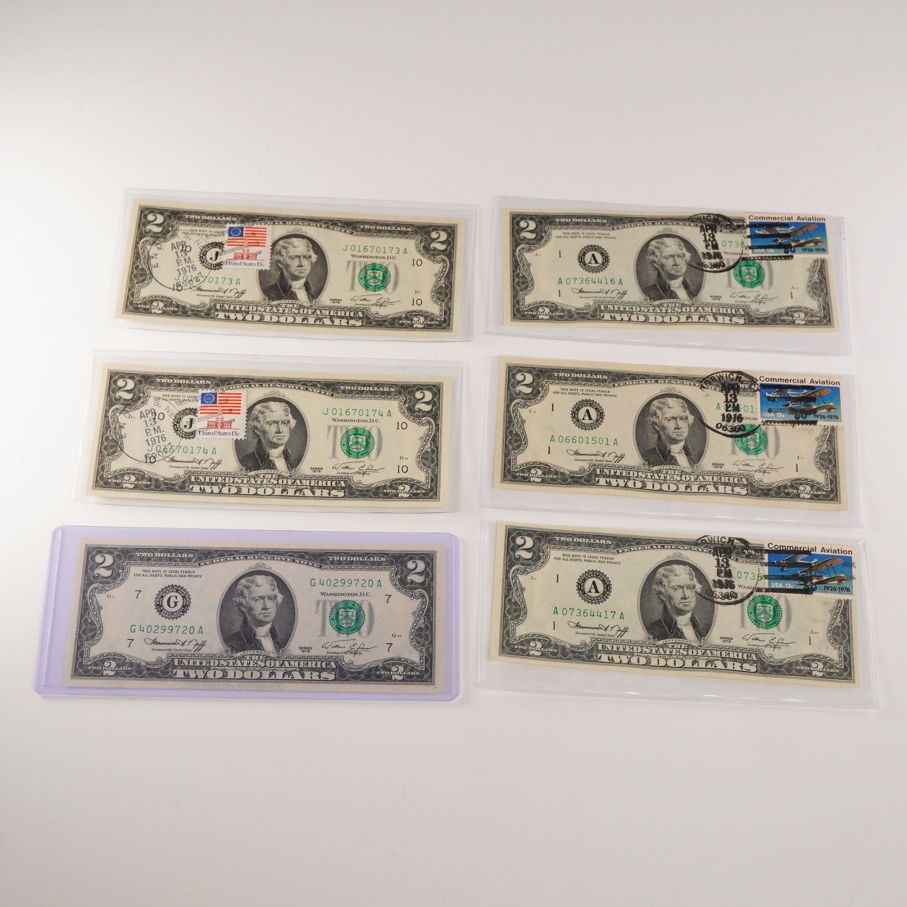 Collection of five 1976 Series U.S. $2 Federal Reserve Notes, four of which are marked as First Day Issues dated April 13, 1976. Each note features the portrait of Thomas Jefferson on the obverse with green Treasury seal and serial numbers, and four bear commemorative postal cancellations - two with American flag stamps and two with "Commercial Aviation" themed stamps. The reverse displays the engraving of The Signing of the Declaration of Independence by John Trumbull. Serial numbers include examples from both the Atlanta and Kansas City Federal Reserve Banks. Notes remain in crisp, lightly handled condition with strong detail and color.