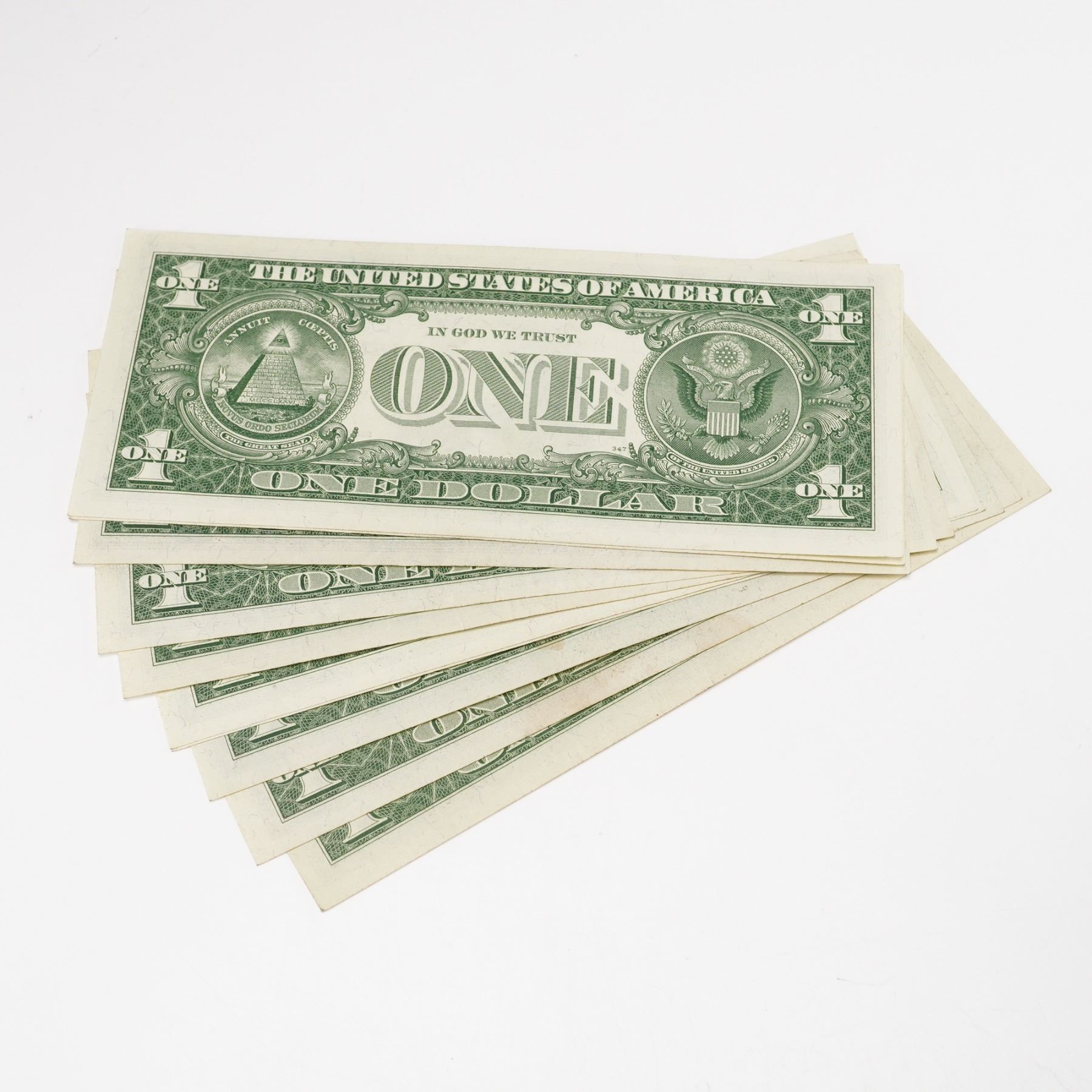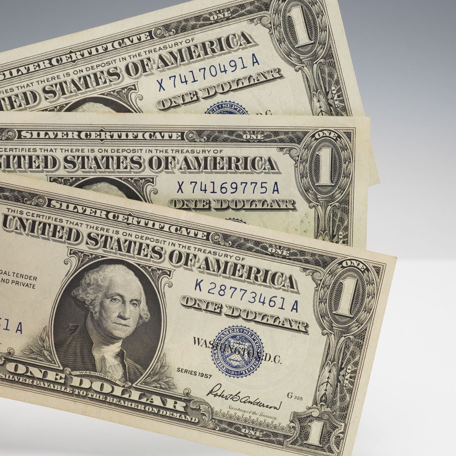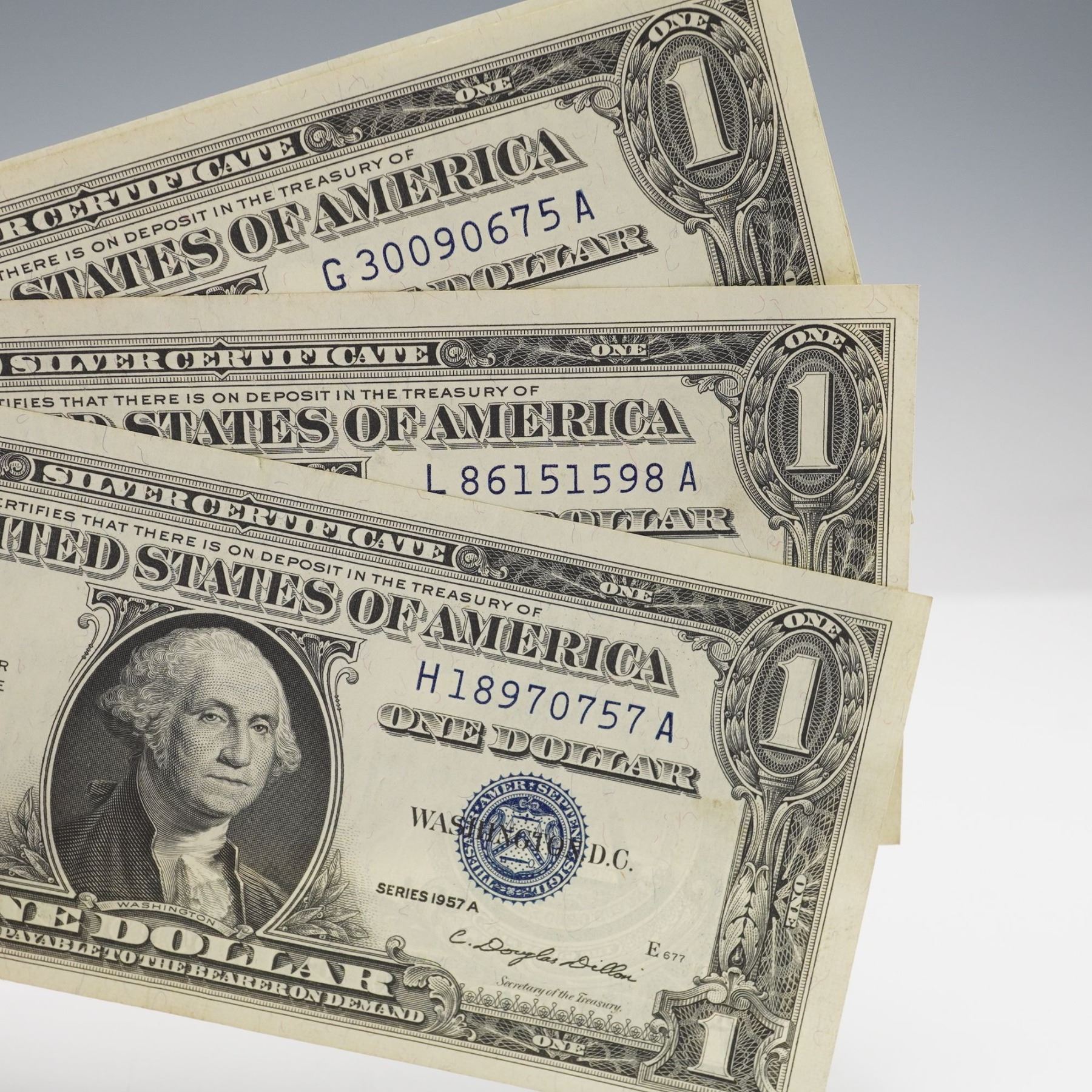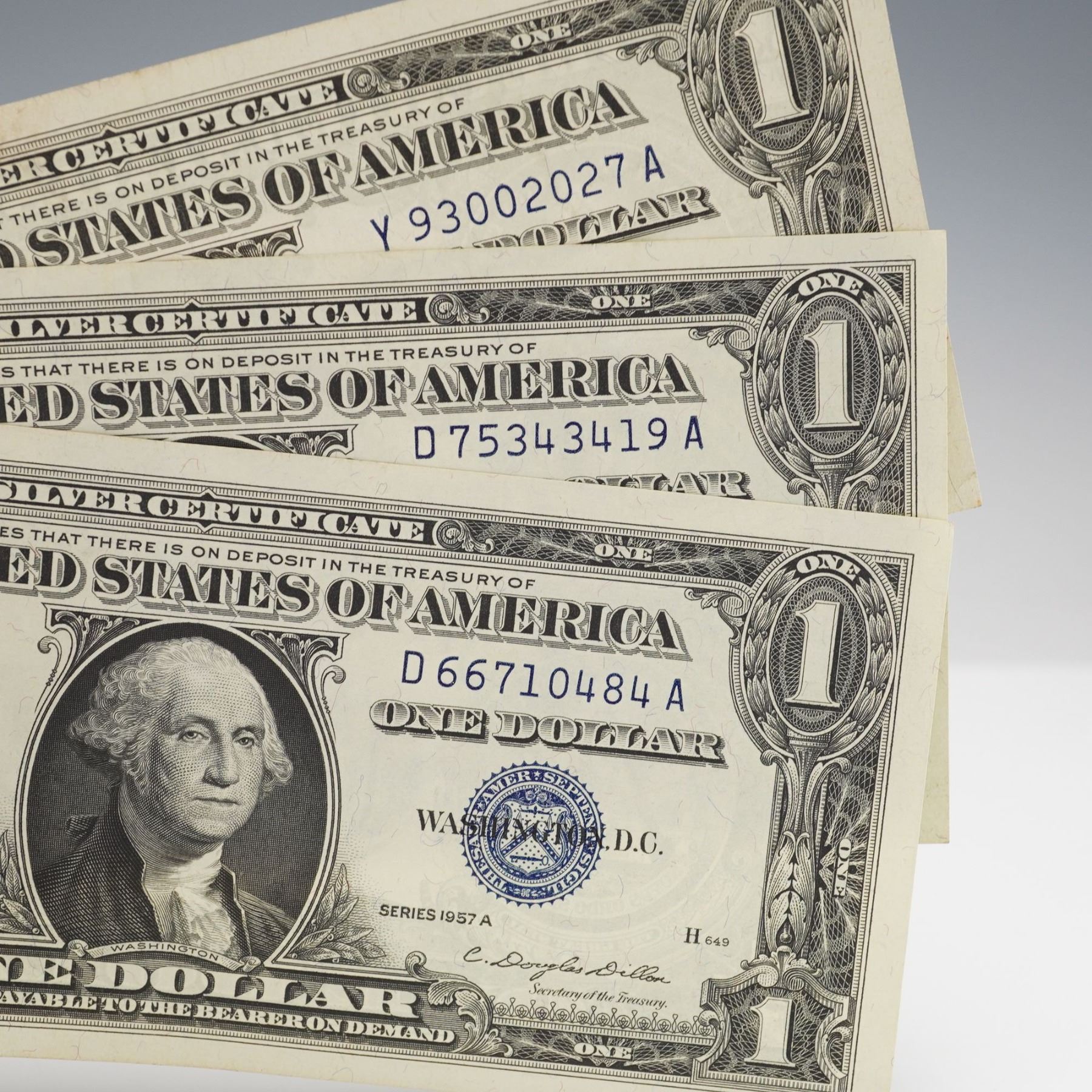 U.S. one dollar silver certificates, including four Series 1957 and six Series 1957A notes. Each note features the portrait of George Washington at center, with blue Treasury seal and serial numbers. Reverse depicts the Great Seal of the United States with the denomination ONE prominently displayed.
