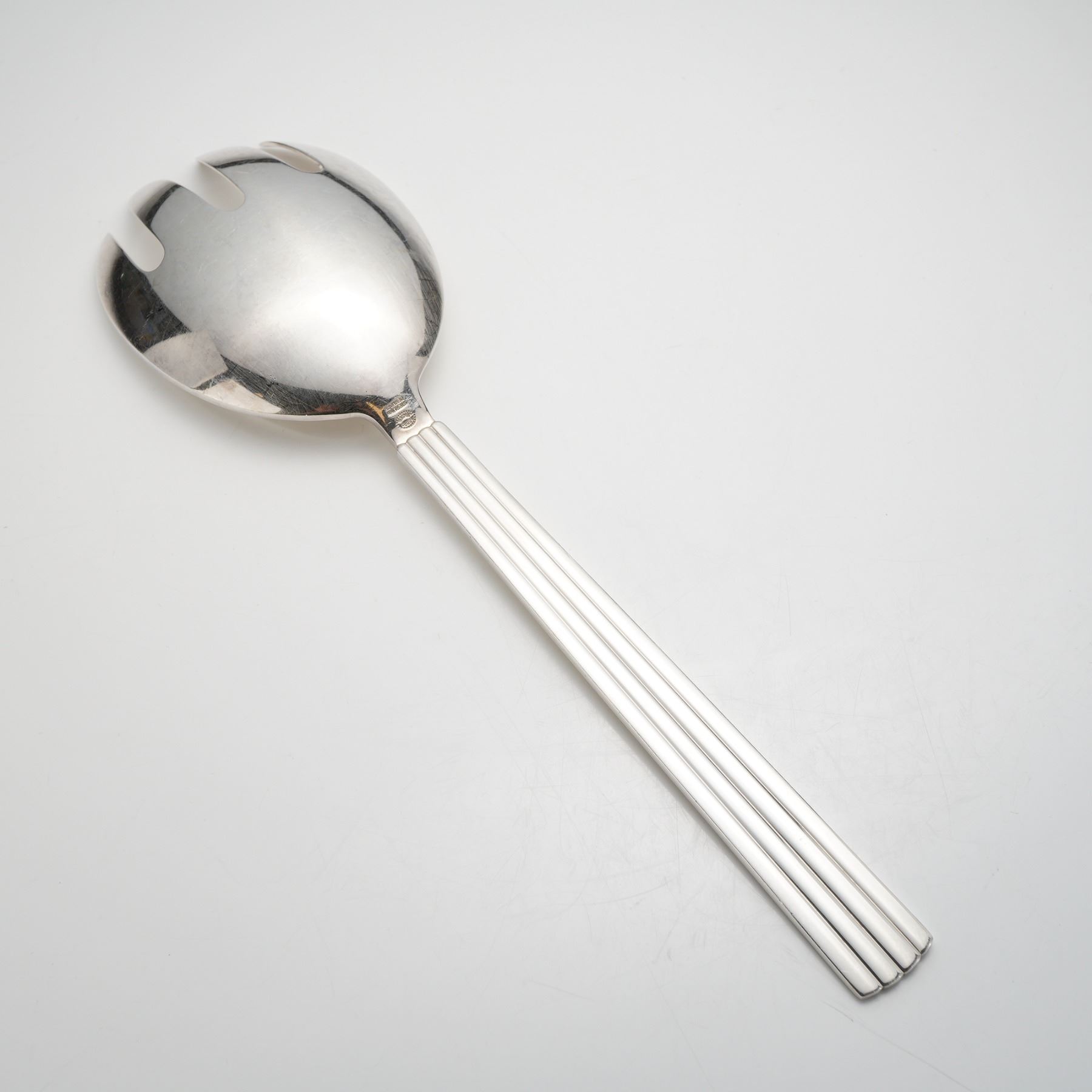 This sterling silver serving fork is in the Bernadotte pattern, designed by Sigvard Bernadotte for Georg Jensen in 1939. The piece features an Art Deco-inspired design with a long, streamlined handle decorated with longitudinal parallel ridges. The head of the fork is broad with four tines, suitable for serving salad or other side dishes. The reverse of the neck bears the post-1945 Georg Jensen maker mark within a dotted oval, accompanied by the stamps STERLING and DENMARK in block letters.