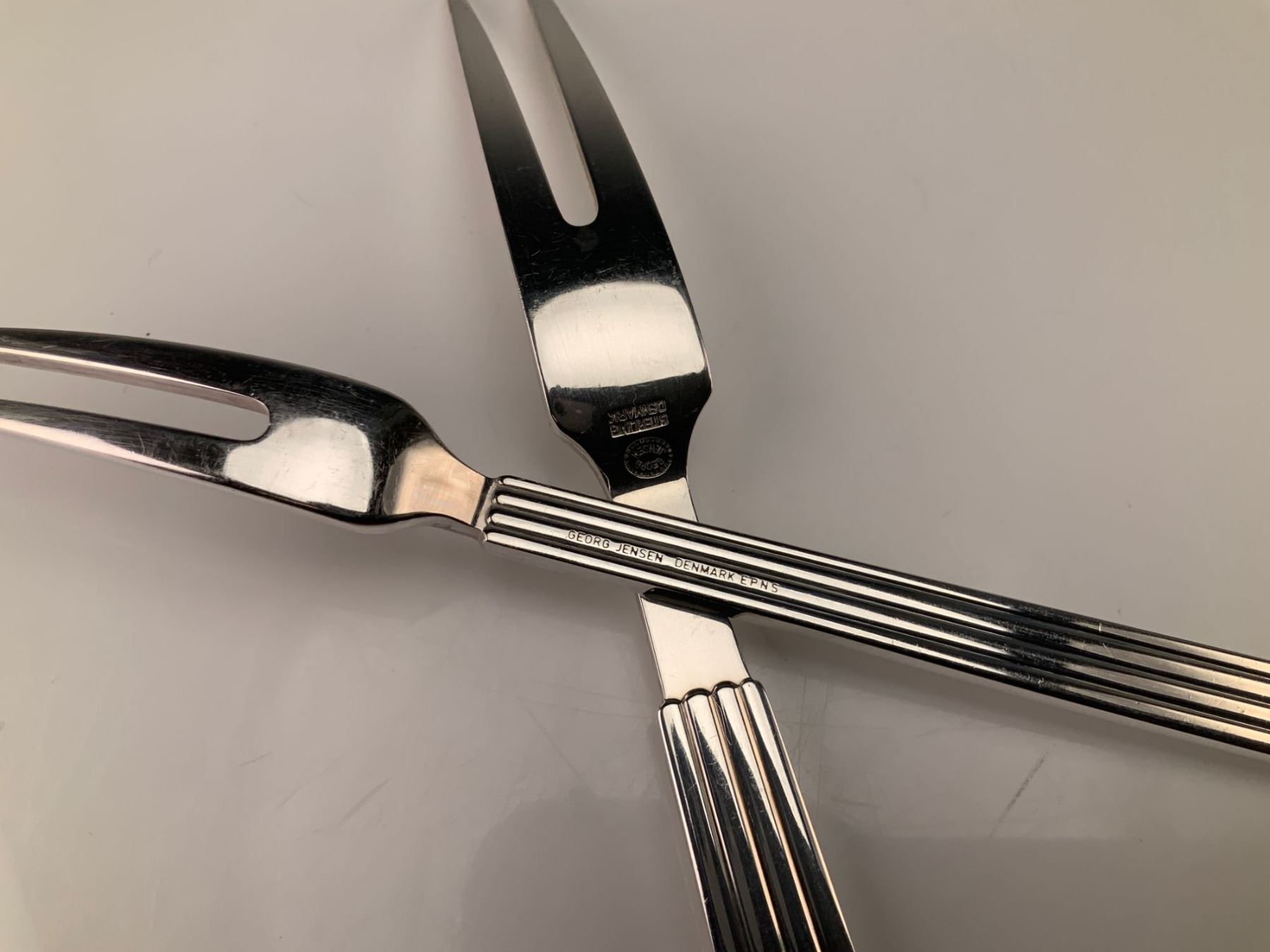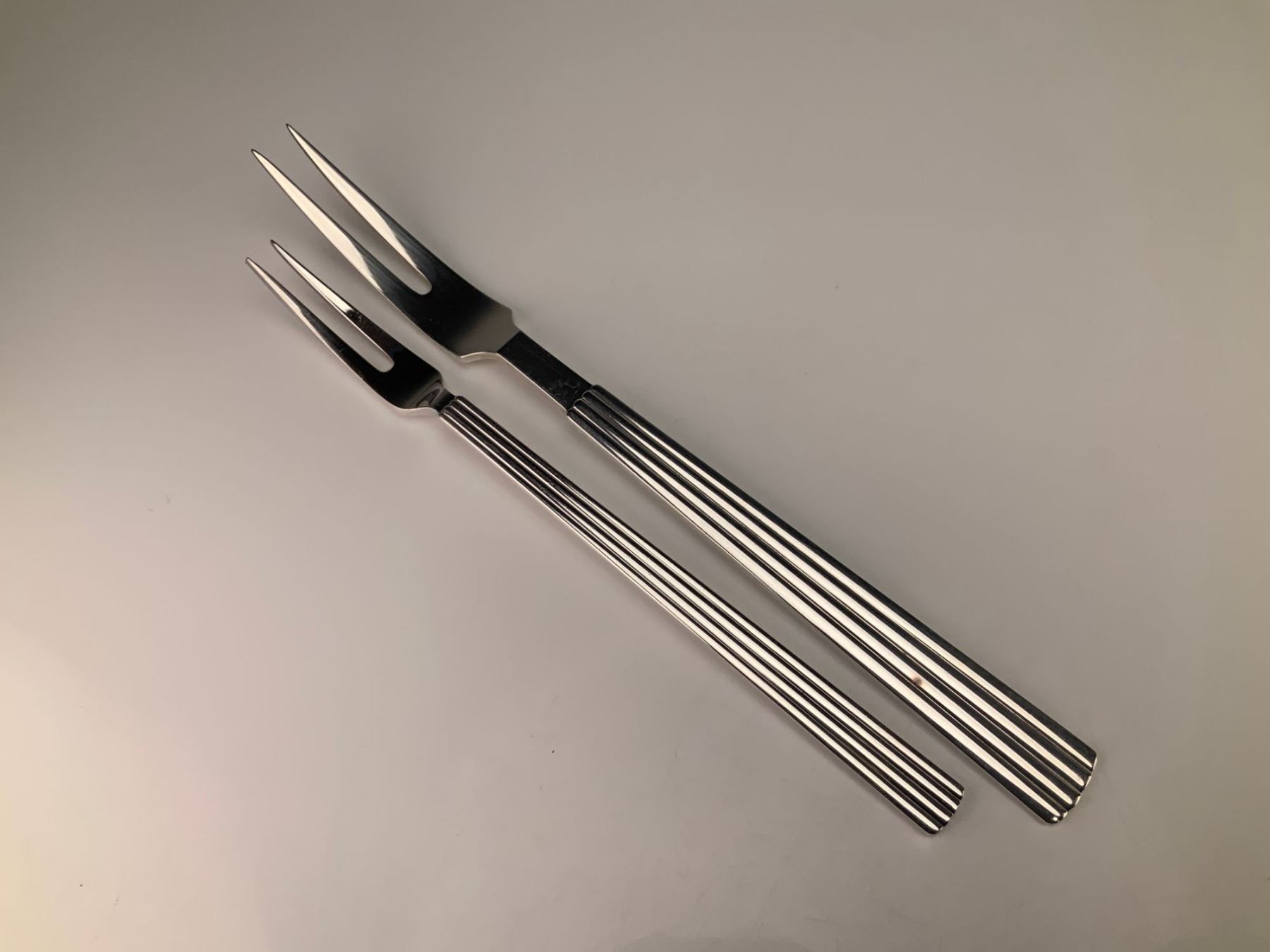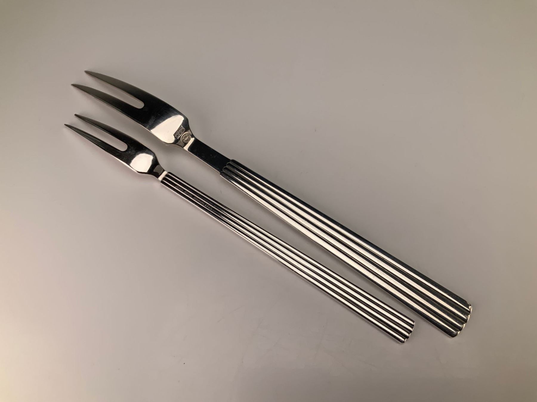 A two-piece group of serving forks in the Bernadotte pattern, originally designed by Sigvard Bernadotte in 1939 for Georg Jensen. The set includes one large meat serving fork and one smaller cold cut or hors d'oeuvre fork. Both items feature cylindrical handles with vertical fluted decoration. The larger fork is sterling silver and bears the post-1945 dotted oval Georg Jensen maker's mark along with the stamps DENMARK and STERLING on the reverse of the neck. The smaller fork is electro-plated nickel silver (EPNS) and is stamped GEORG JENSEN DENMARK EPNS on the handle.