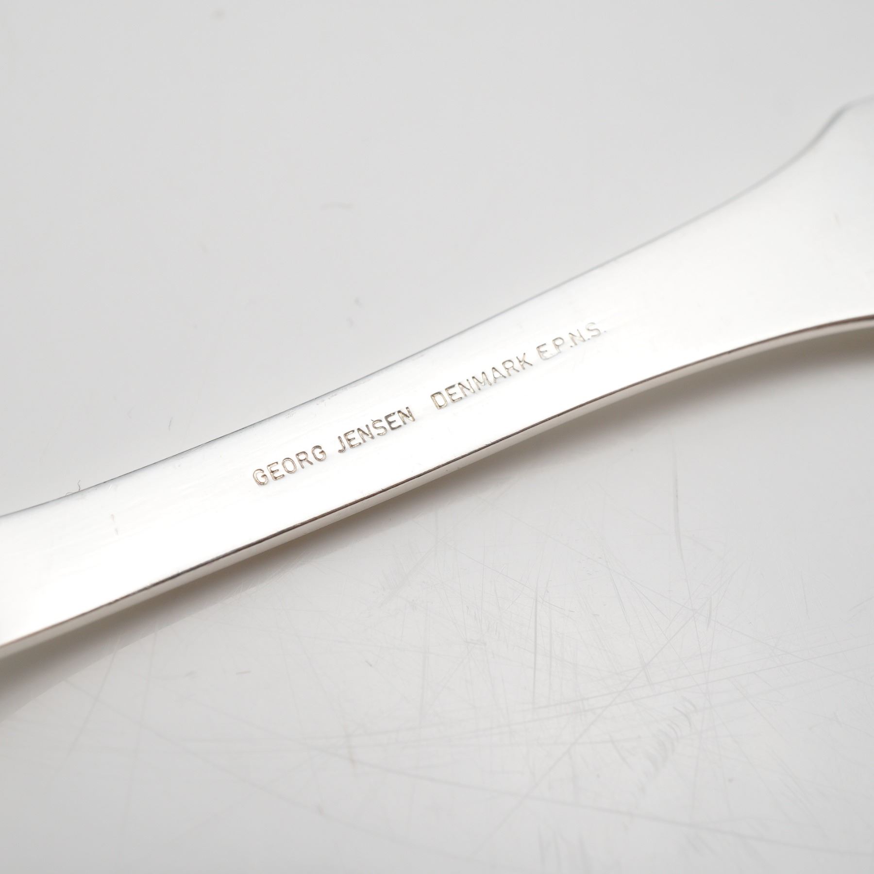 This pair of fish forks is manufactured by Georg Jensen of Denmark in the Mermaid pattern. The items are constructed from electroplated nickel silver, as indicated by the EPNS designation. The design features a modernist aesthetic with a hand-hammered finish visible on the tapered handles and the upper portion of the fork heads. Each fork is configured with three tines, including one notched outer tine. The reverse of each handle is stamped with the maker and origin marks. Stamps and Hallmarks: GEORG JENSEN DENMARK E.P.N.S.