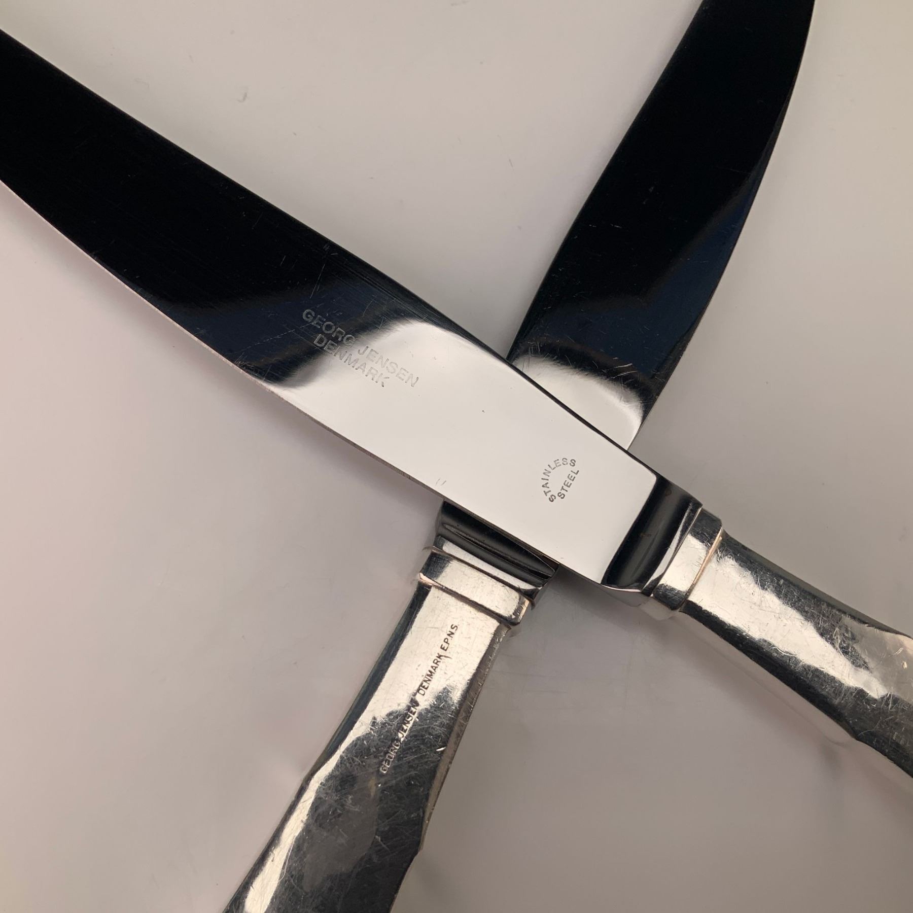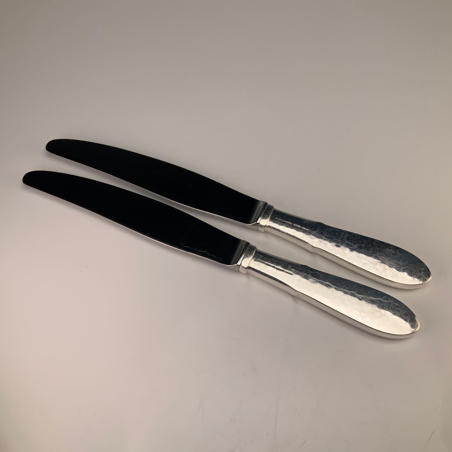 This pair of Georg Jensen knives is in the Mermaid pattern, featuring a distinctive hand-hammered finish. The handles are constructed of electroplated nickel silver (EPNS), while the blades are made of stainless steel. Each blade is marked with Georg Jensen over Denmark and a circular stainless steel stamp. The handles are also stamped with Georg Jensen, Denmark, and EPNS. The design is characterized by a flared, hammered texture typical of mid-century Danish flatware.