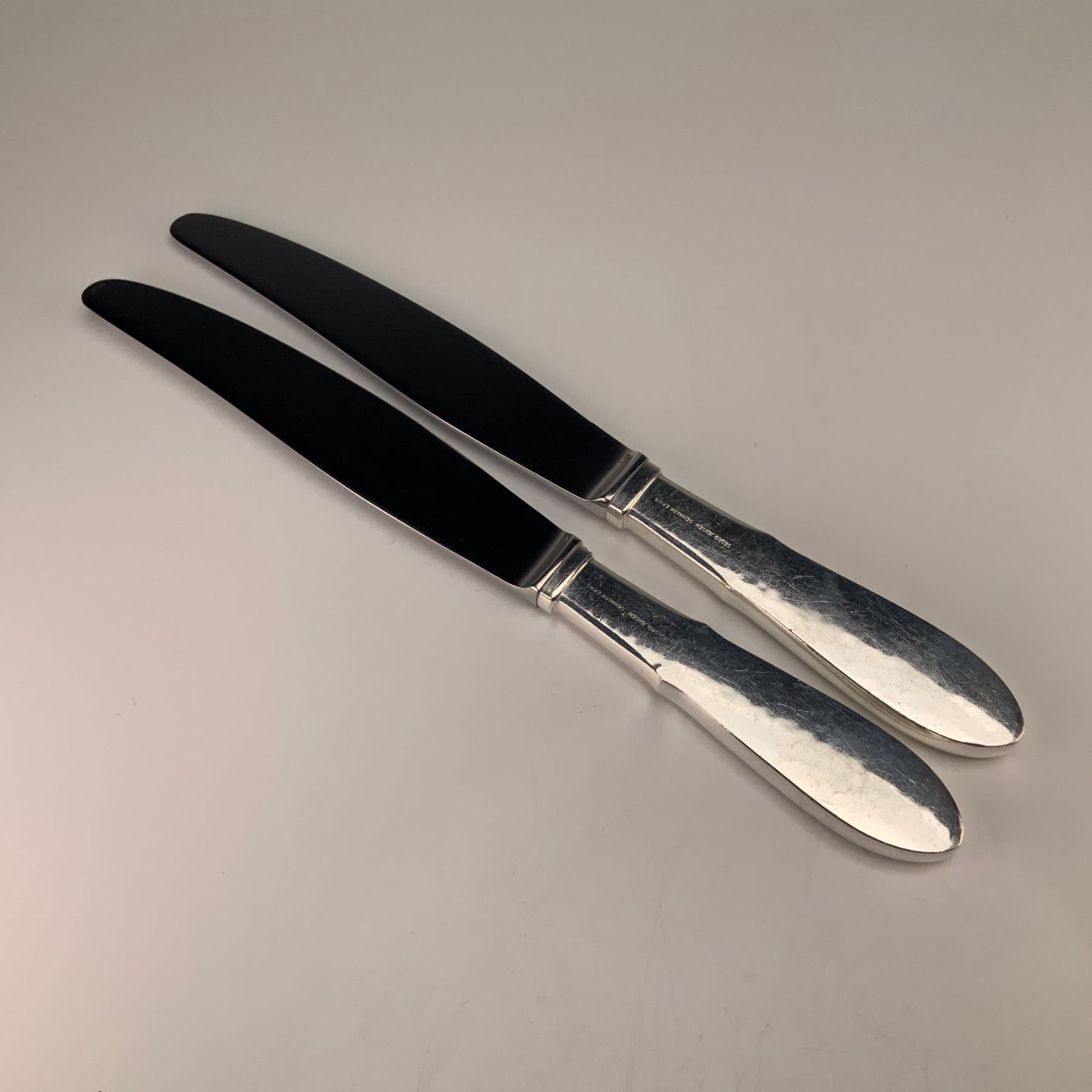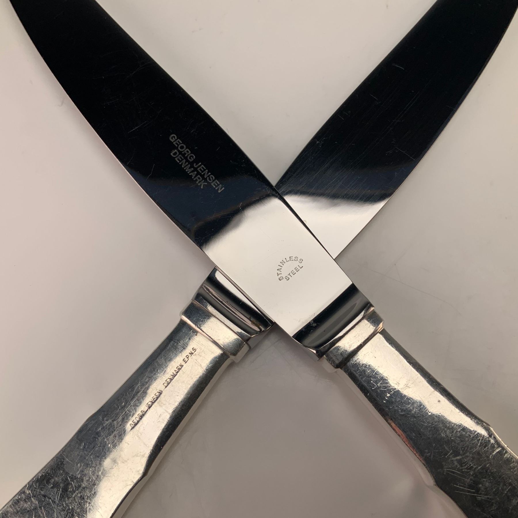 This pair of dinner knives is in the Mermaid pattern by Georg Jensen, Denmark. The handles are constructed of silver-plated nickel silver, marked EPNS, and feature a hammered texture with faceted edges. The tapering blades are made of stainless steel. The blades are marked Georg Jensen Denmark and include a circular stamp for stainless steel. The handles are stamped Georg Jensen Denmark EPNS near the bolster.