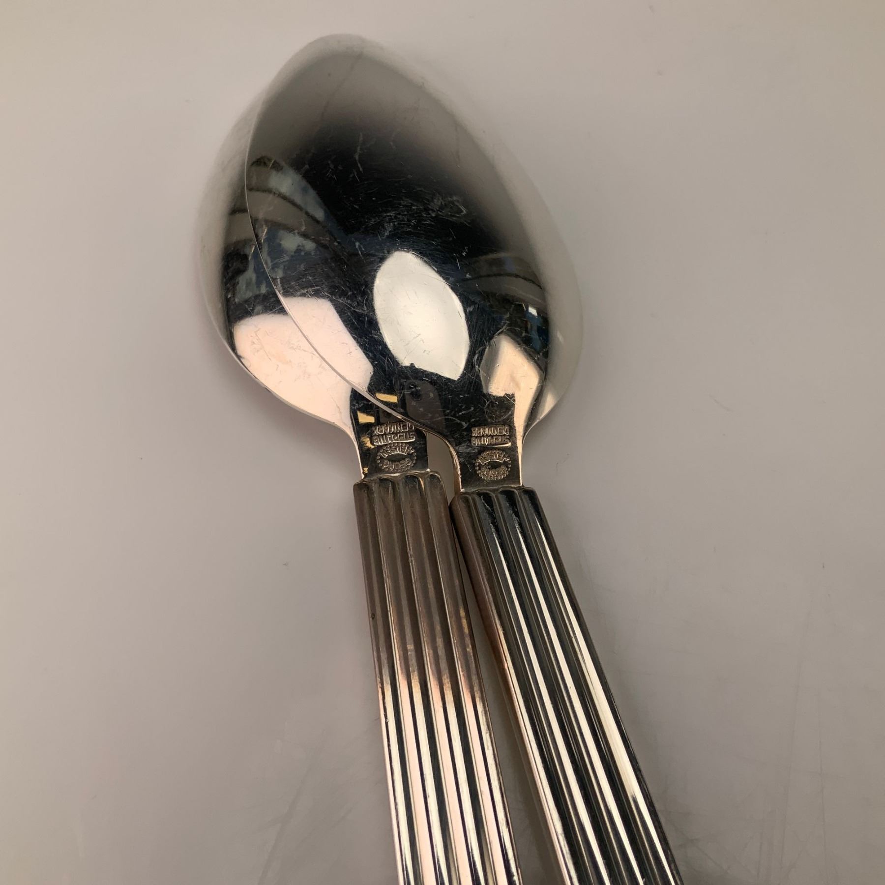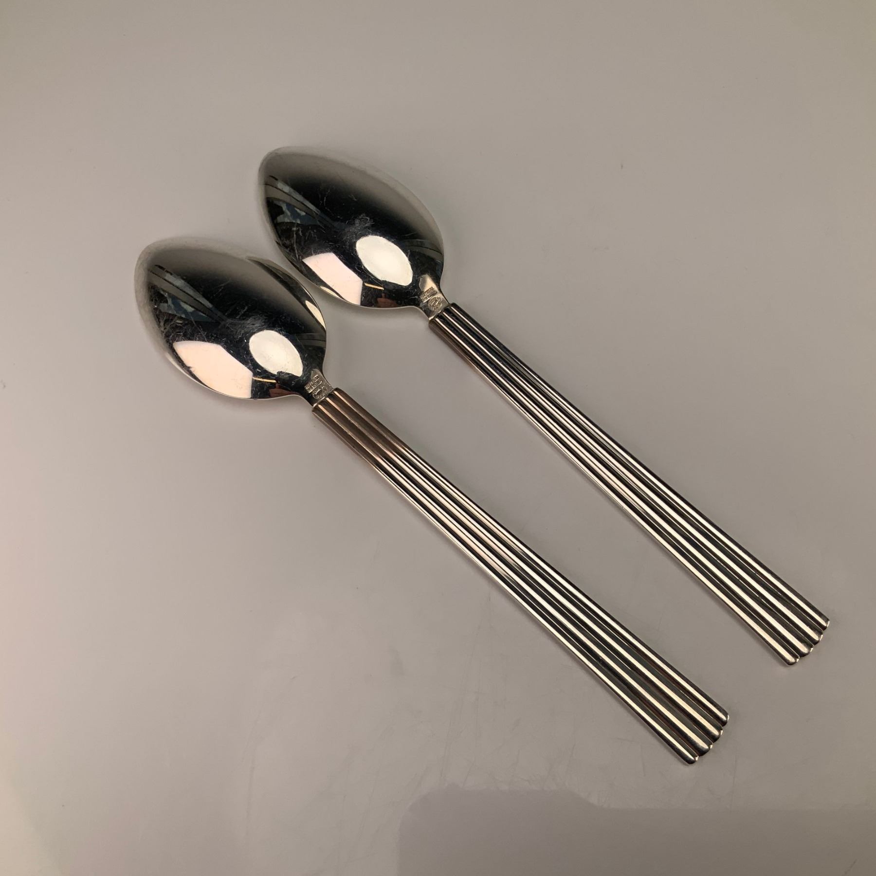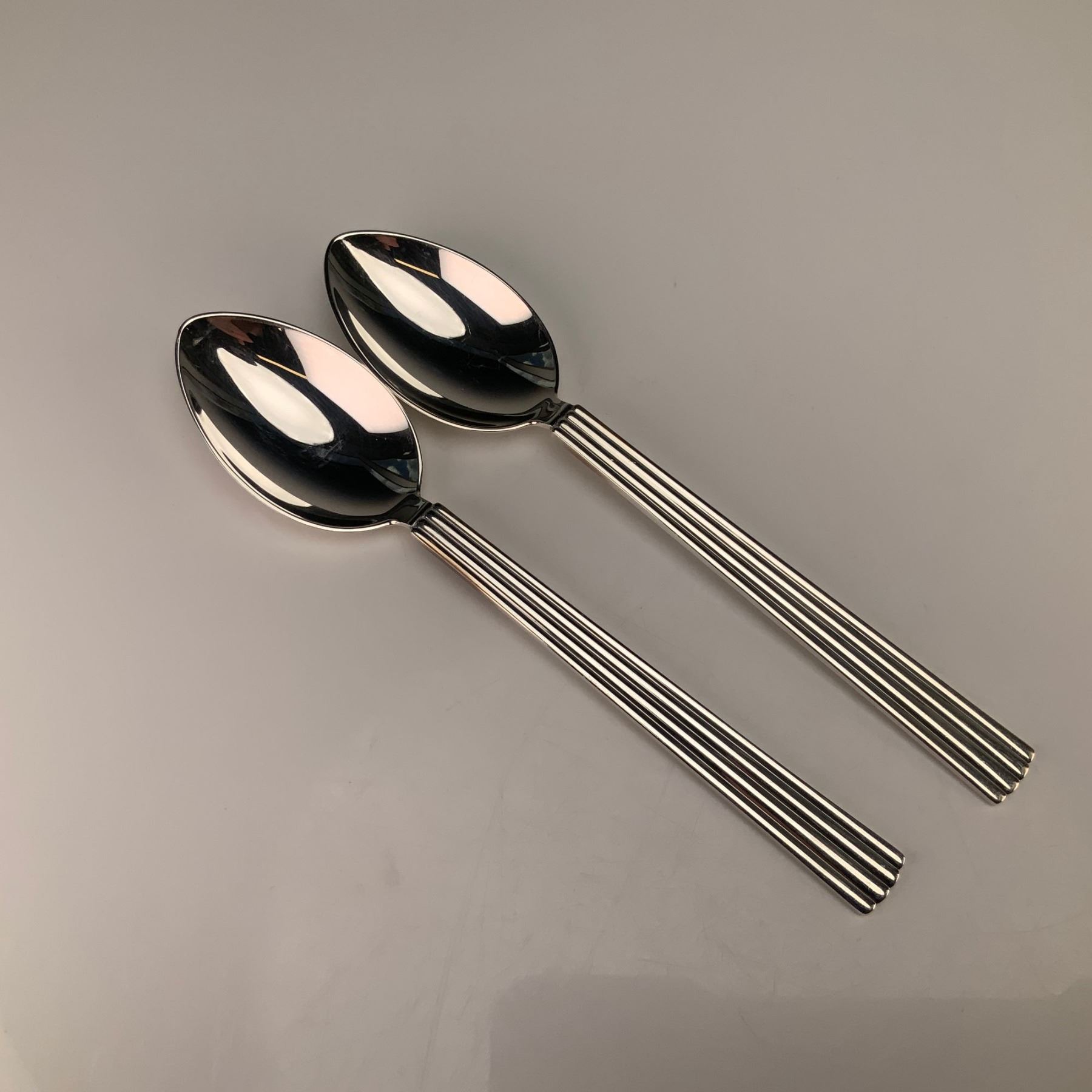 This pair of sterling silver teaspoons is in the Bernadotte pattern, designed by Sigvard Bernadotte for Georg Jensen. Each spoon is crafted from sterling silver and features a classic Art Deco-inspired design with a rounded bowl and a tapering, fluted handle terminating in a rounded end. The reverse neck of each piece is stamped with the marks STERLING and DENMARK. Below these marks is the Georg Jensen oval hallmark with a beaded border and the 925S purity mark.