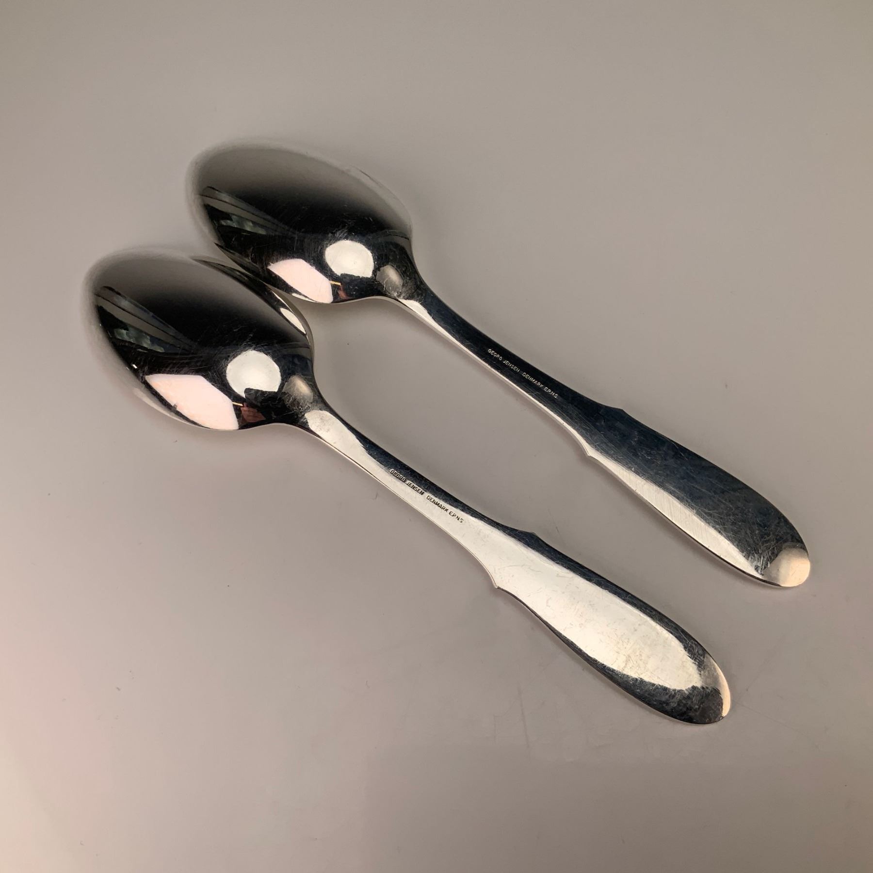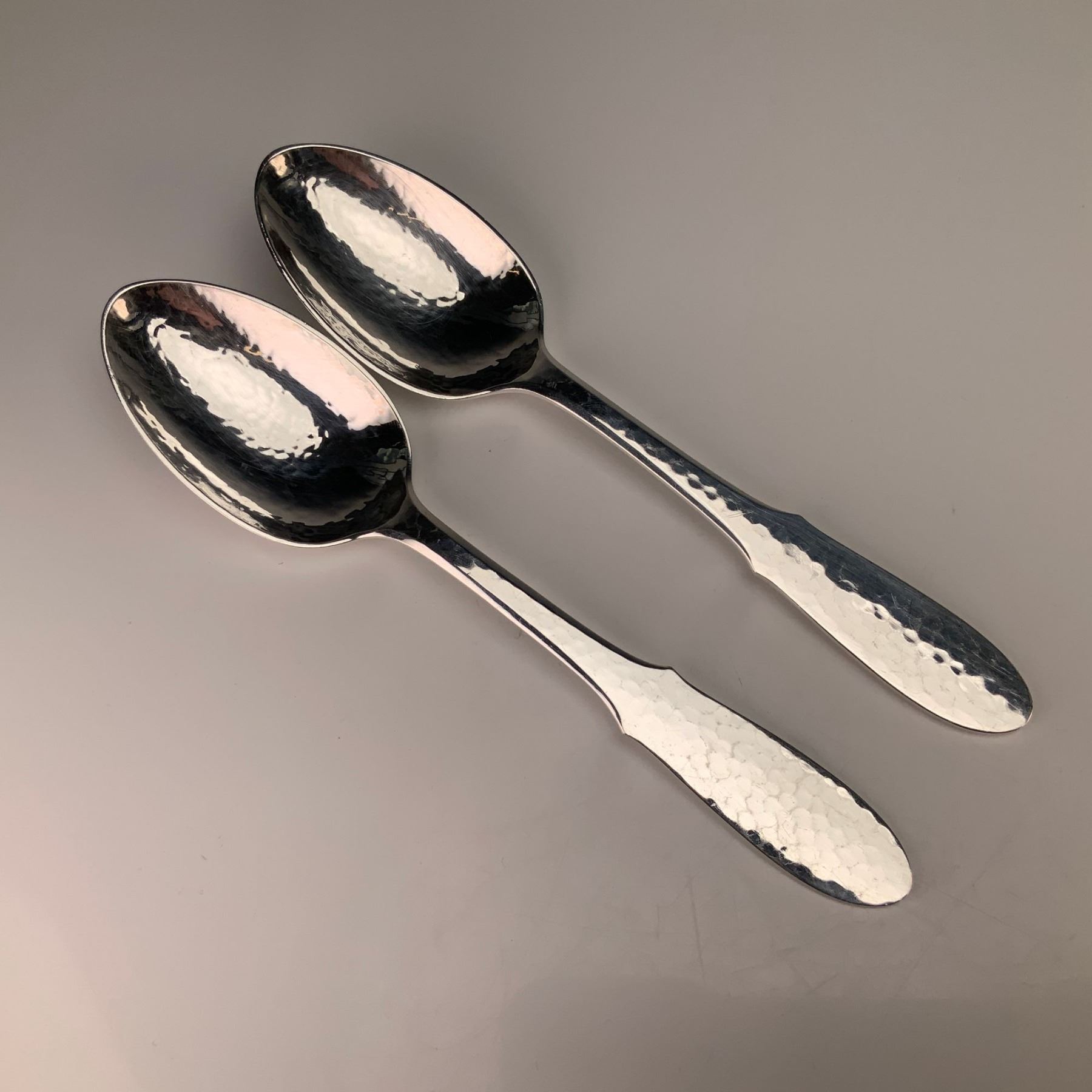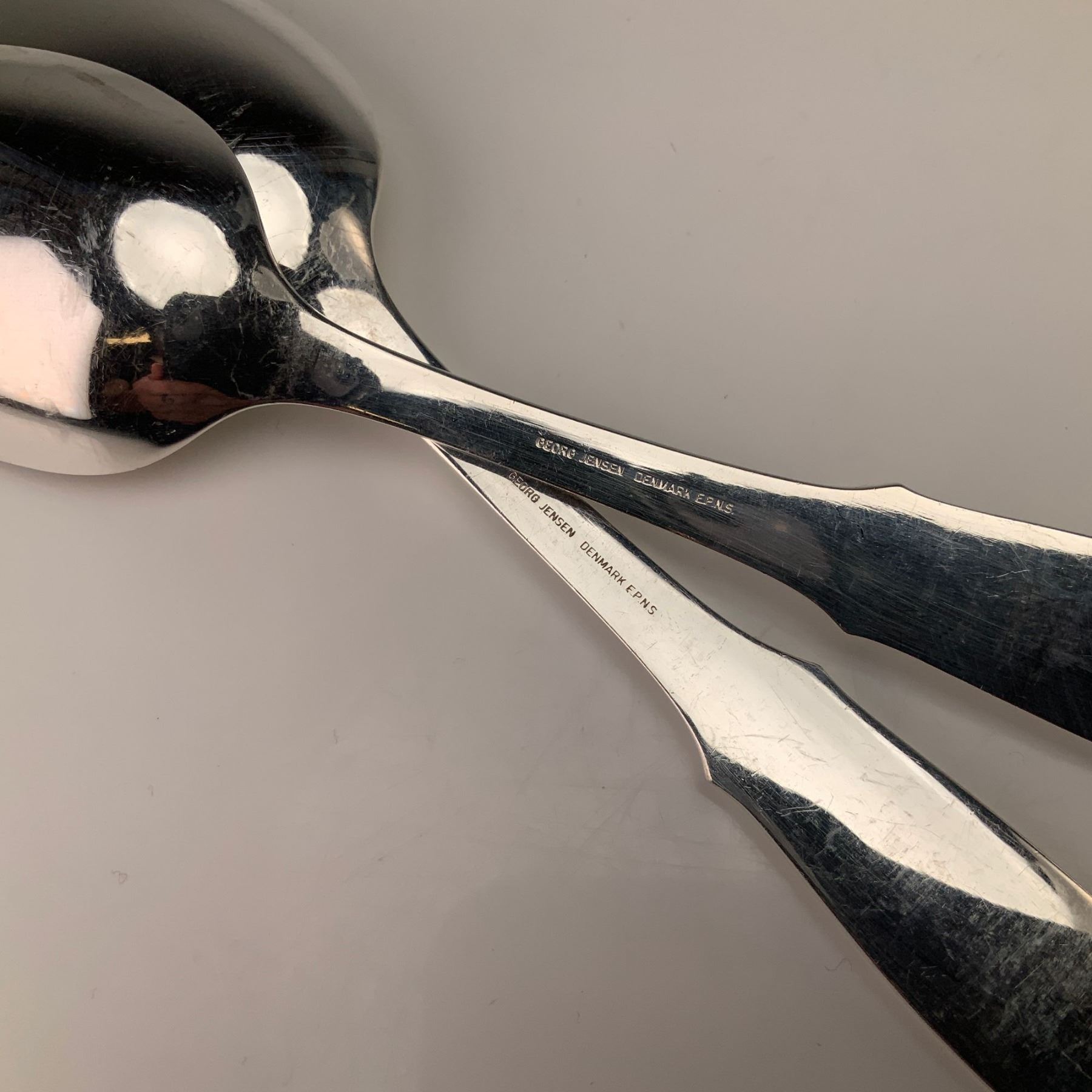 This pair of silver-plated spoons is in the Mermaid pattern by Georg Jensen of Denmark. Each spoon is constructed from electroplated nickel silver (EPNS) and features a distinctive hammered or planished finish on the face of the oval bowl and the tapering handle. The handles are designed with a subtle notched shoulder and a rounded terminal. The reverse of each handle is smooth and bears the stamped marks: GEORG JENSEN DENMARK EPNS.
