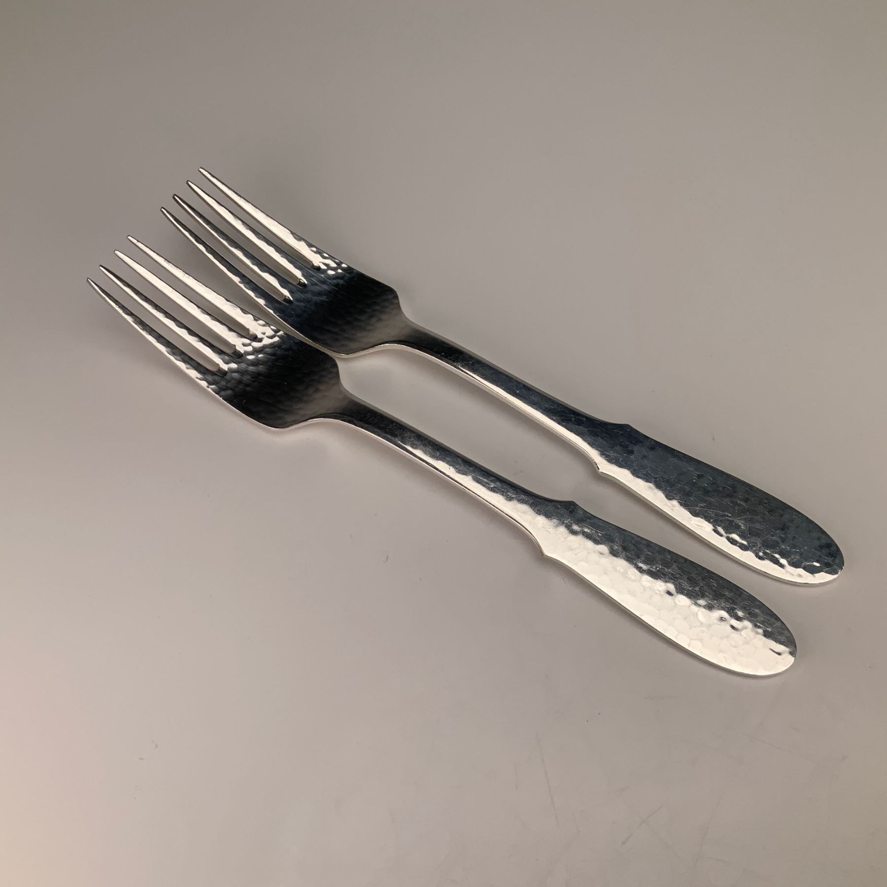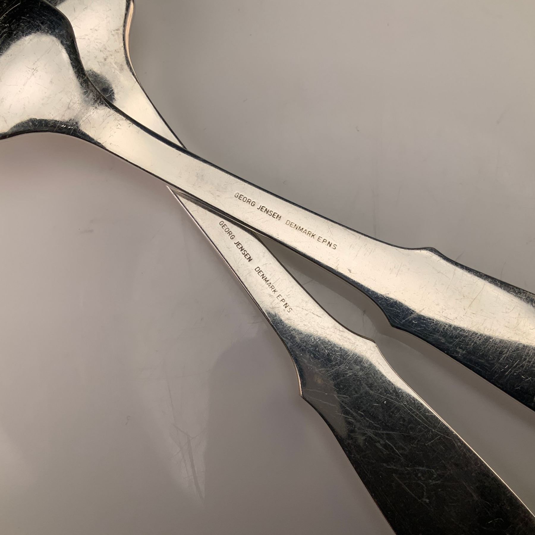 This lot consists of two silver-plated forks in the Mermaid pattern by Georg Jensen. These items are made of electroplated nickel silver (EPNS) and were produced in Denmark. The design is characterized by a hammered finish on the handles and at the base of the tines. The handles are flared with rounded tips and notched shoulders. The reverse of each stem is stamped with the marks GEORG JENSEN, DENMARK, and EPNS.