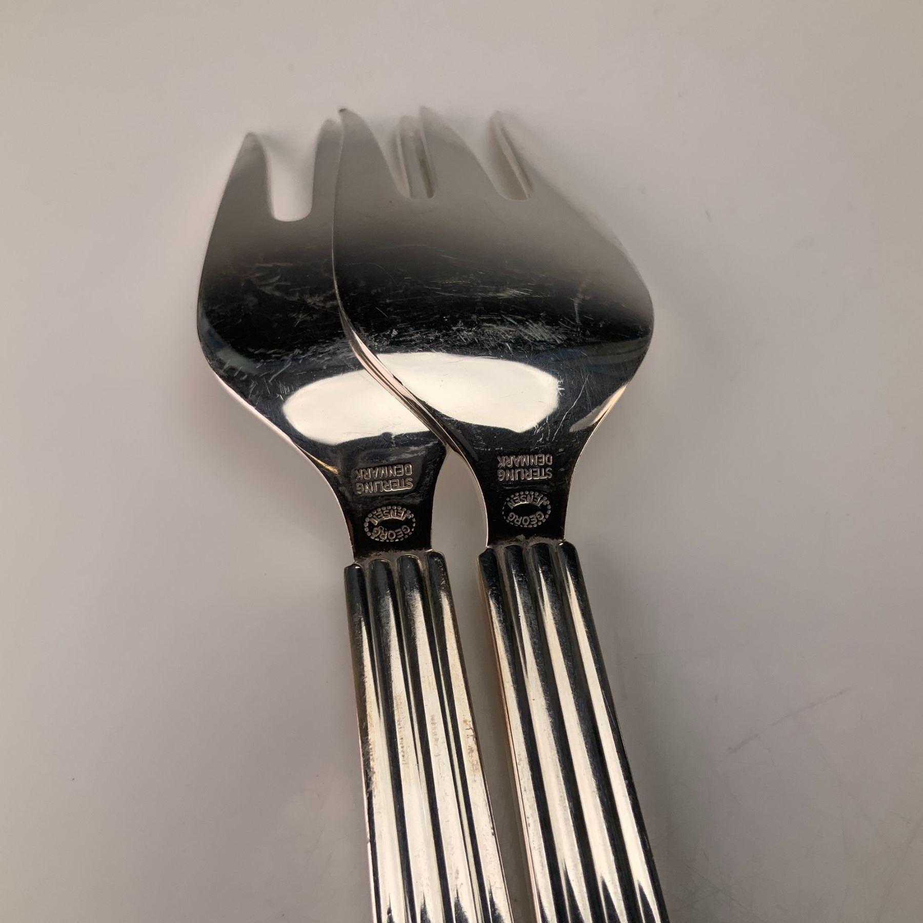 A pair of sterling silver forks in the Bernadotte pattern, designed by Sigvard Bernadotte for Georg Jensen in 1939. Each fork features a three-tined design with broad, slightly curved heads. The long handles are characterized by classic Art Deco-influenced vertical fluting that extends to the rounded terminals. The reverse of the neck on each fork is stamped with the characters STERLING over DENMARK, positioned above an oval mark containing the letters GEORG JENSEN. This set of flatware demonstrates the streamlined, functionalist aesthetic associated with mid-century Danish silver design.