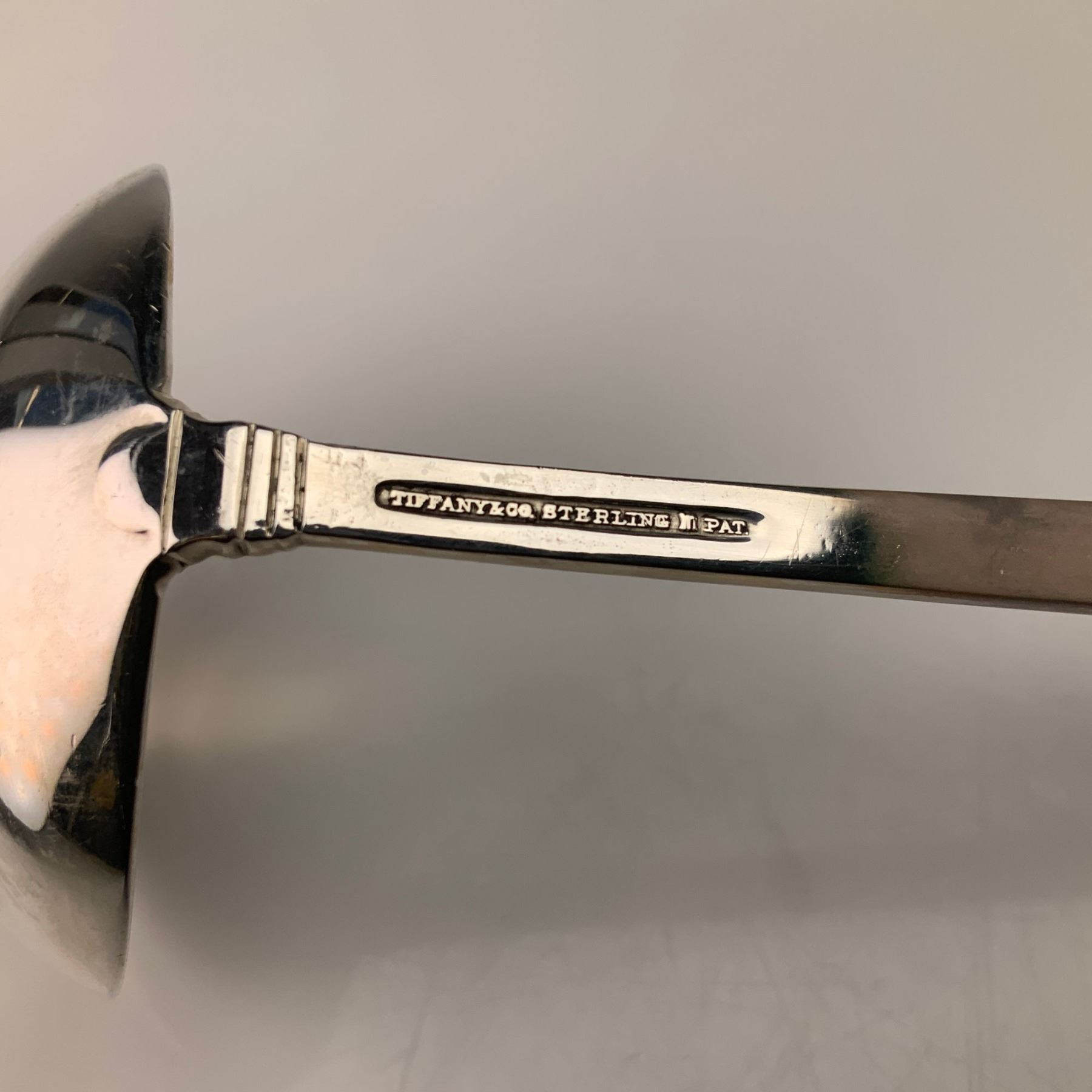 A sterling silver sauce ladle produced by Tiffany and Co. in the Hampton pattern. The ladle features a long, tapered handle with a pointed, faceted terminal and a triple-ribbed bolster where the handle joins the deep, circular bowl. The reverse of the handle is stamped with the recessed marks TIFFANY and Co. STERLING M PAT. The M mark indicates the piece was manufactured under the directorship of John C. Moore II, dating the production of this piece to between 1934 and 1947.