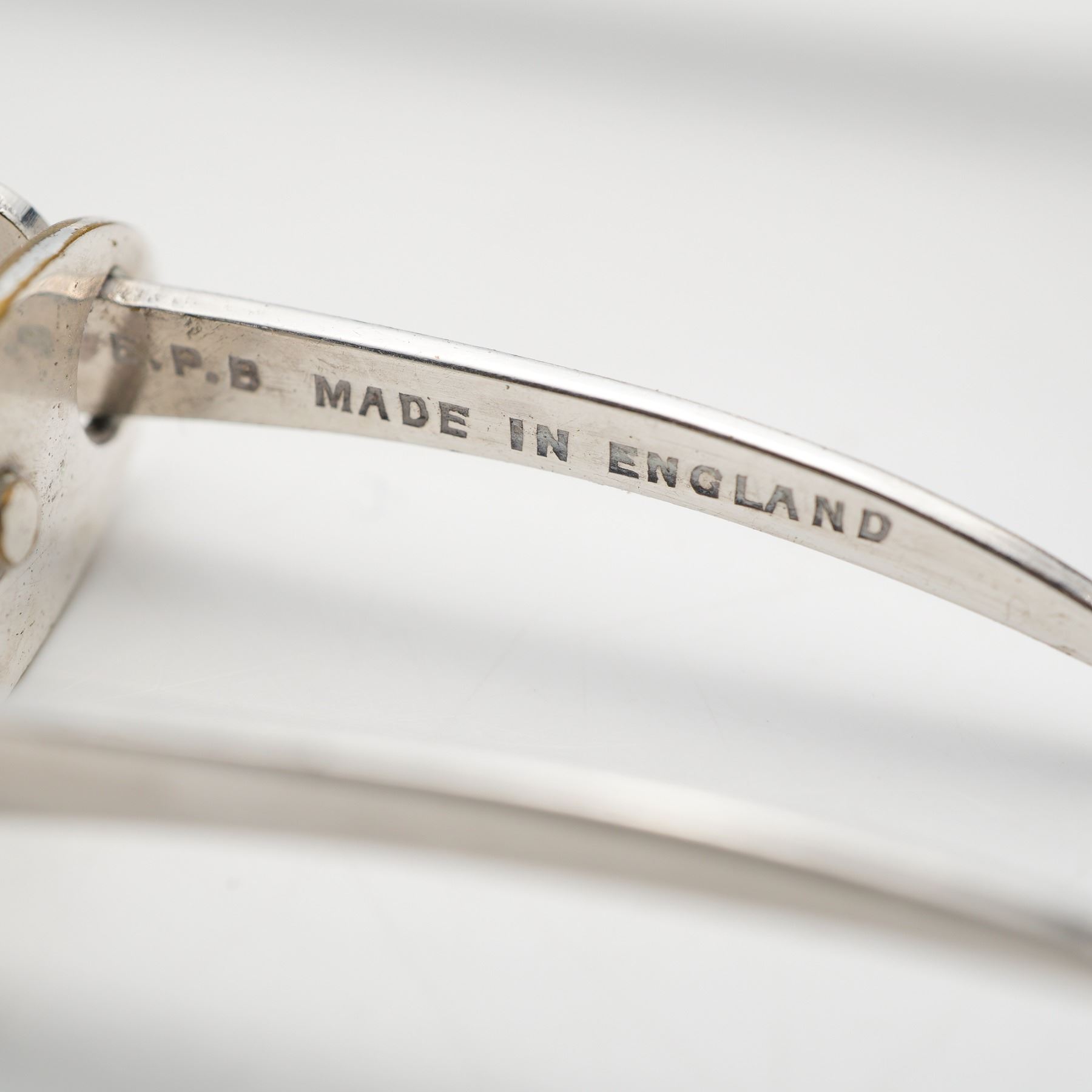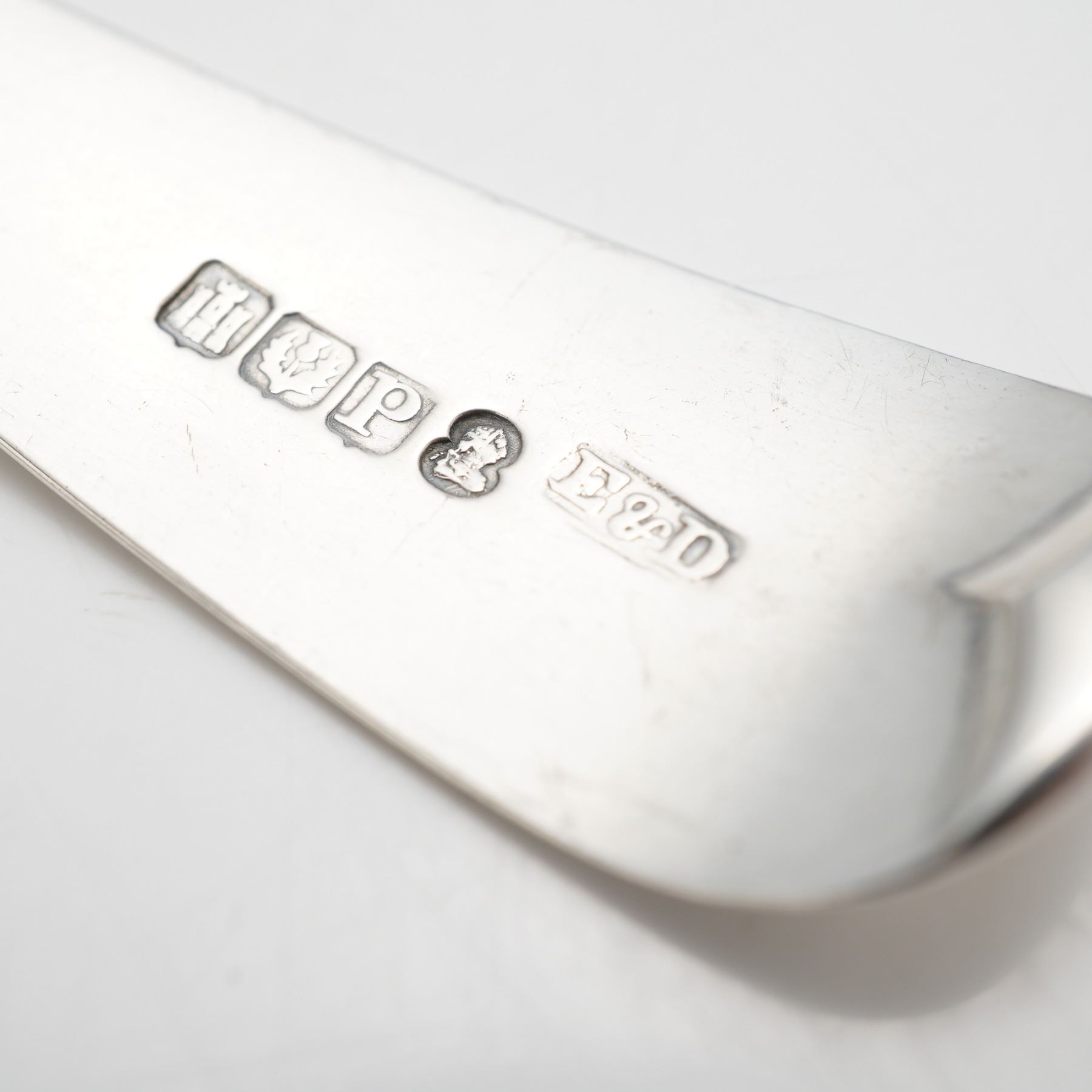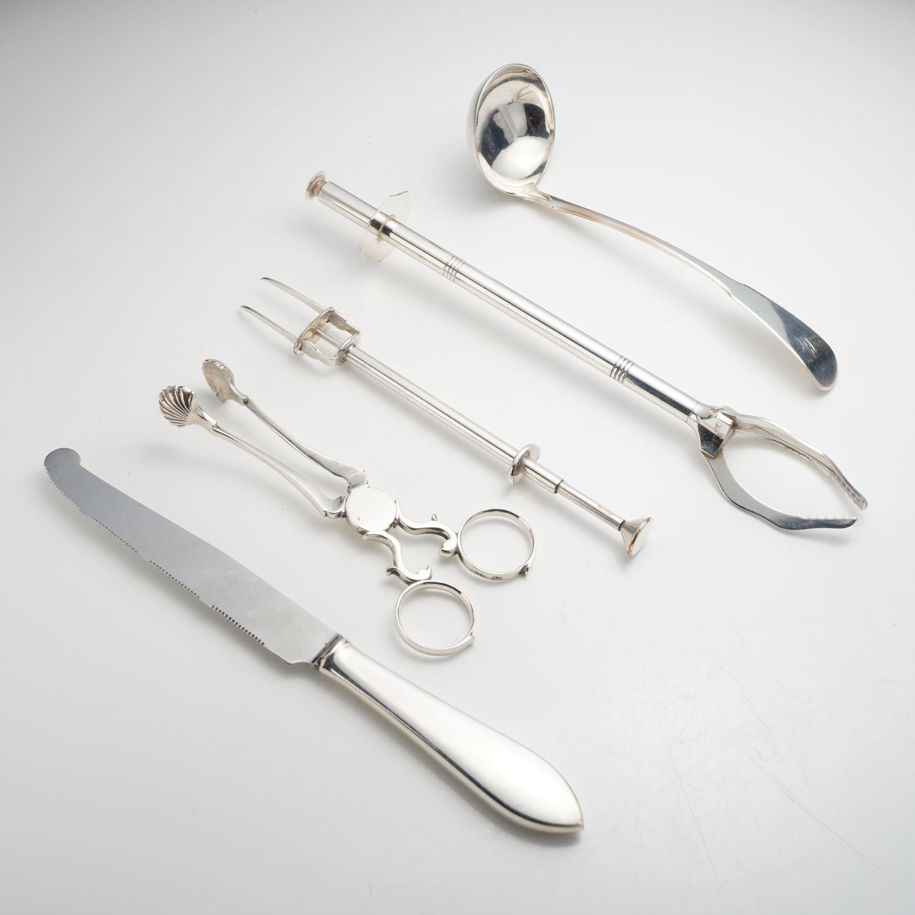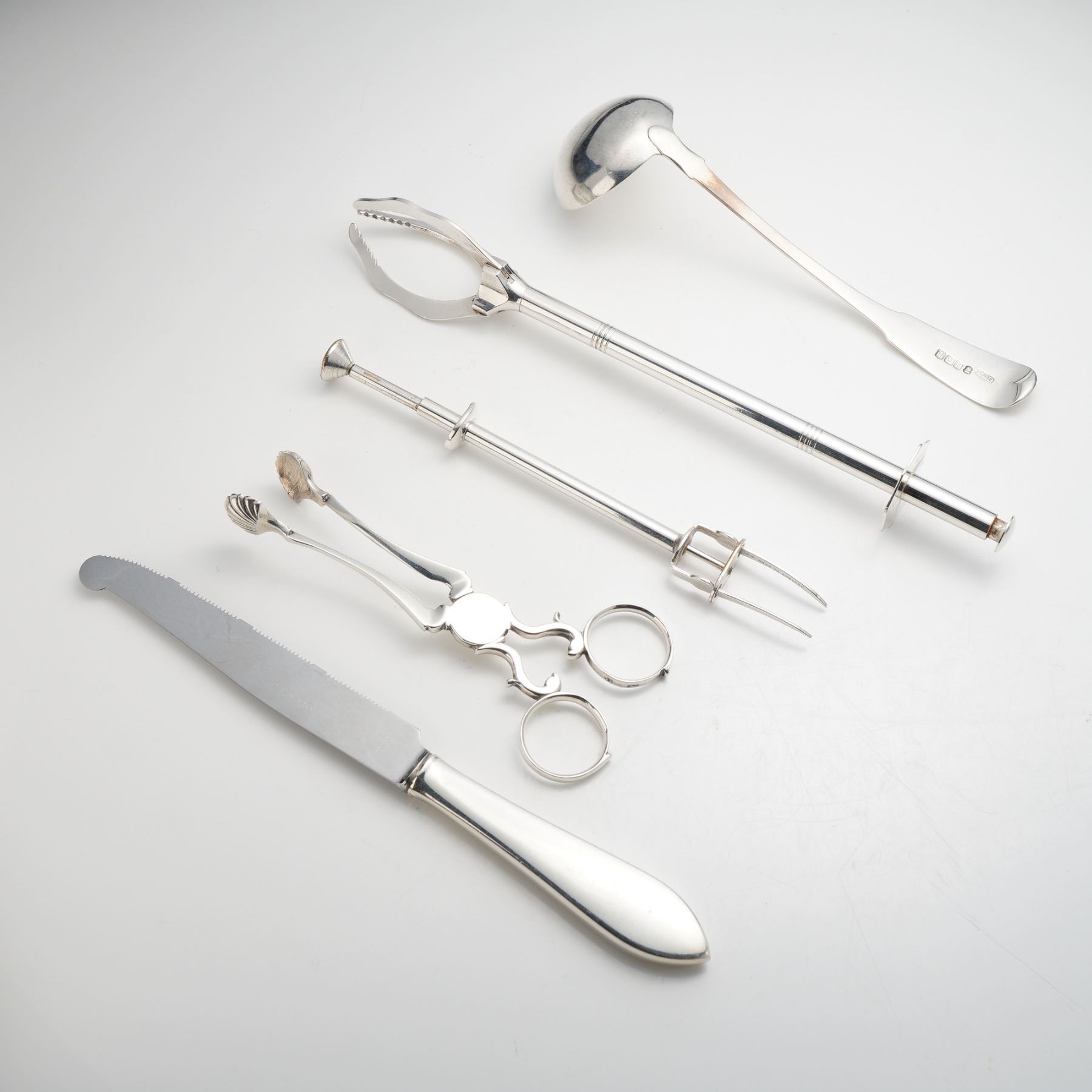 This collection of five serving utensils includes a variety of materials and origins, featuring both sterling silver and silver-plated pieces. A notable item in the group is a solid sterling silver sauce ladle designed in the fiddle pattern. The ladle is stamped with a series of English hallmarks including a lion passant indicating sterling fineness, an uncrowned leopard head for the London assay office, a lowercase letter p date mark for 1830, a monarch head duty mark, and the maker mark E & Co attributed to Eley and Co. The collection also includes a serrated utility knife with a stainless steel blade marked Tiffany and Co. and France, featuring a smooth silver-toned handle. Also present are a pair of long serving tongs with serrated gripping ends marked P.B MADE IN ENGLAND, indicating silver-plated construction. The set is completed by a mechanical pickle fork with a spring-loaded plunger mechanism and a pair of scissor-action tongs with shell-form grips, both manufactured from silver-toned metal.