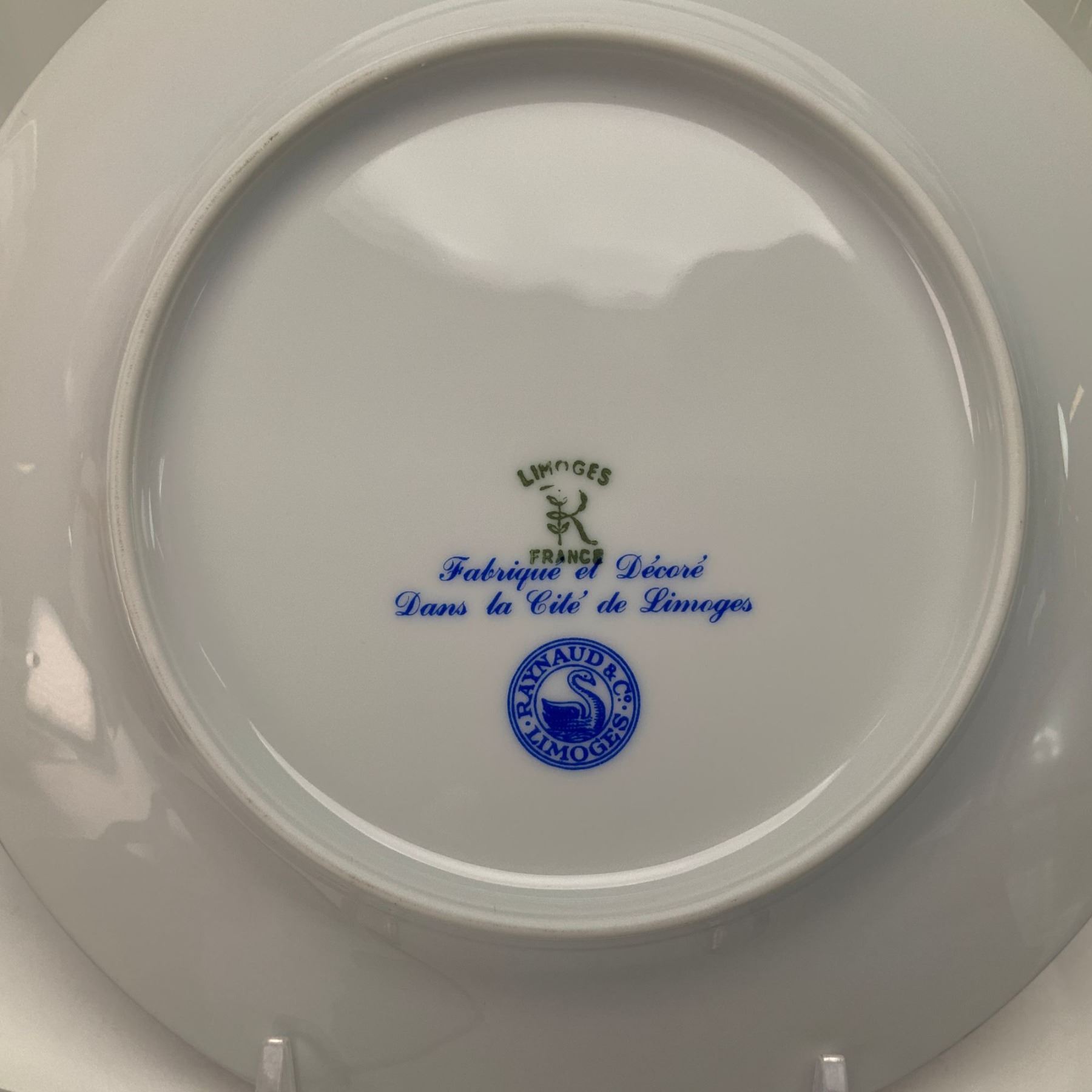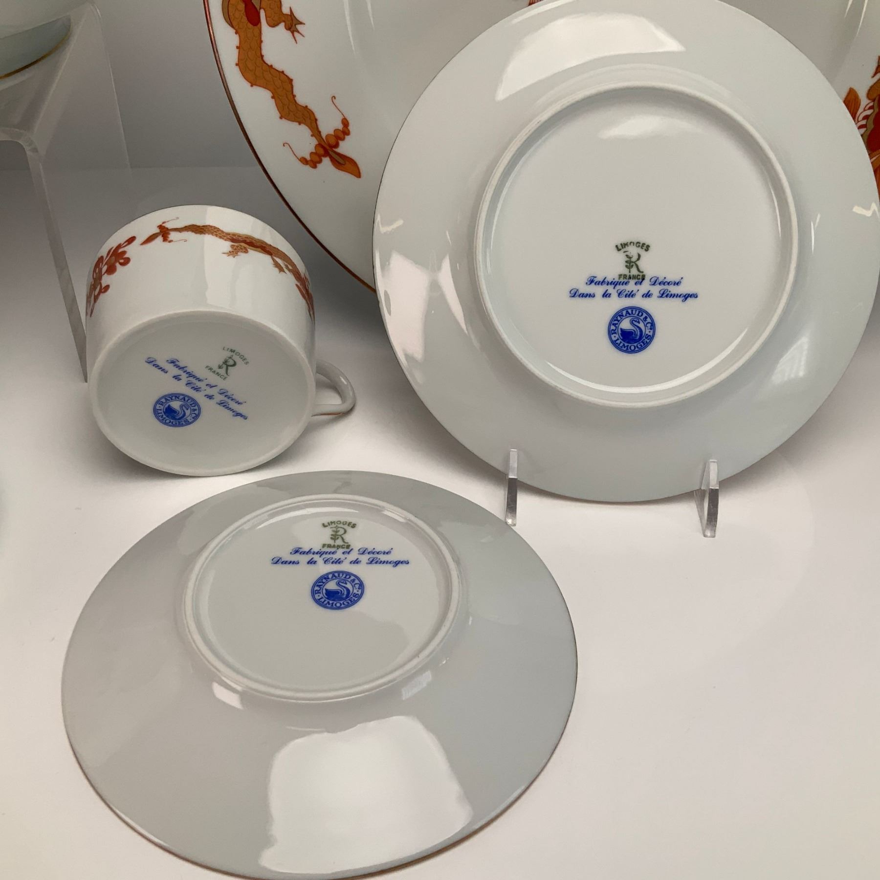 A seven-piece porcelain dinnerware set by Raynaud and Company of Limoges, France, decorated in the Red Dragon pattern. The Chinoiserie-style decoration features iron-red (rouge de fer) dragons and phoenixes with gilded accents and rims. This pattern is a classic interpretation of traditional Chinese export porcelain motifs. The underside of the pieces bears three distinct marks: a green stamp with LIMOGES over a stylized R and FRANCE; a blue cursive inscription reading Fabrique et Decore Dans la Cite de Limoges; and a circular blue seal featuring a swan with the words RAYNAUD and Co. LIMOGES. The set includes a charger, a covered casserole dish, a bread or side plate, two cups, and two saucers.
