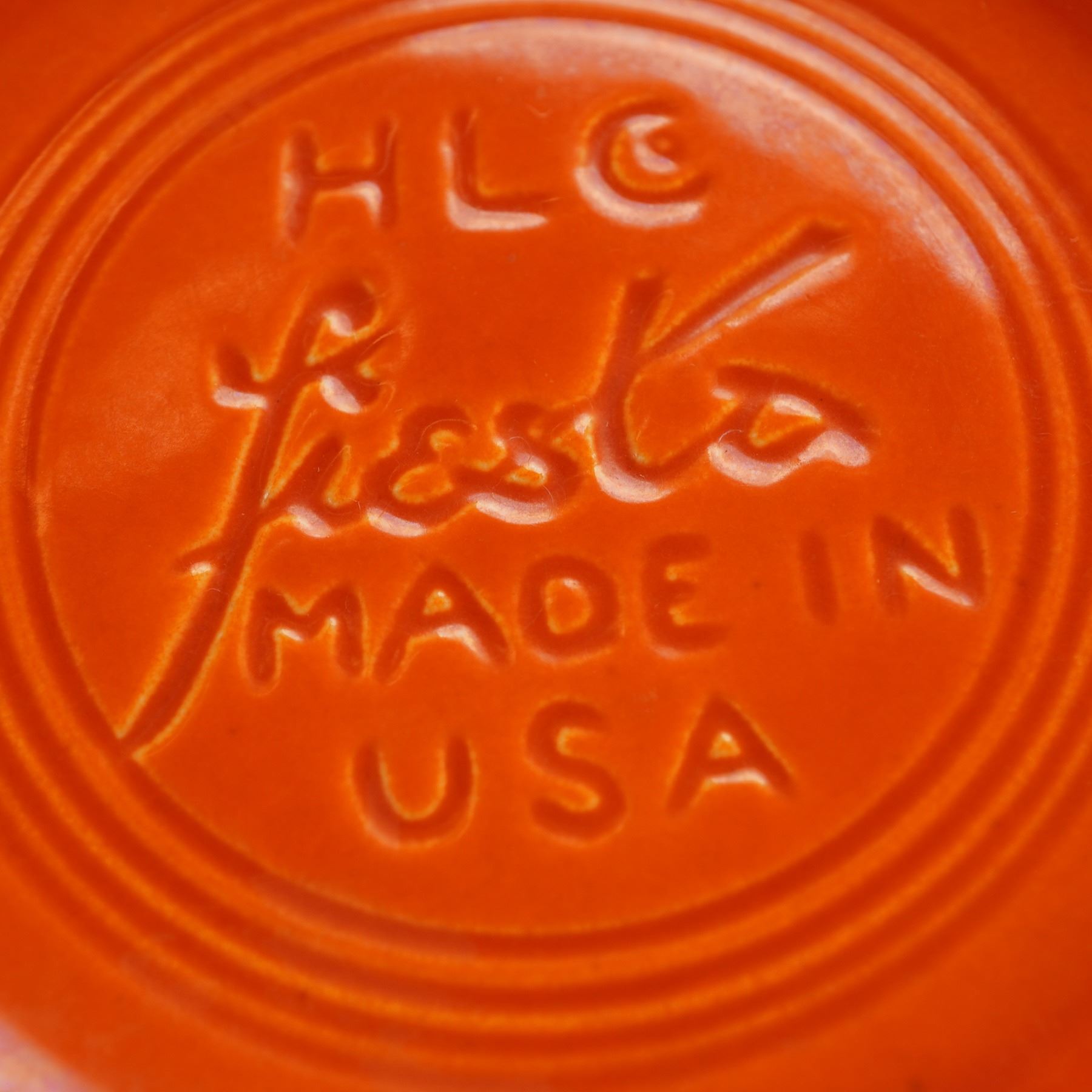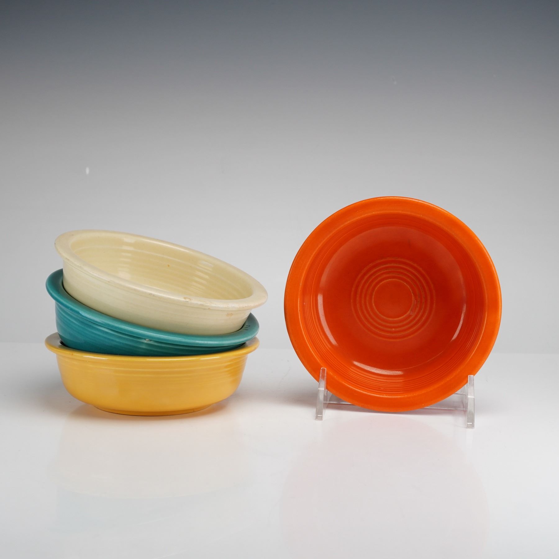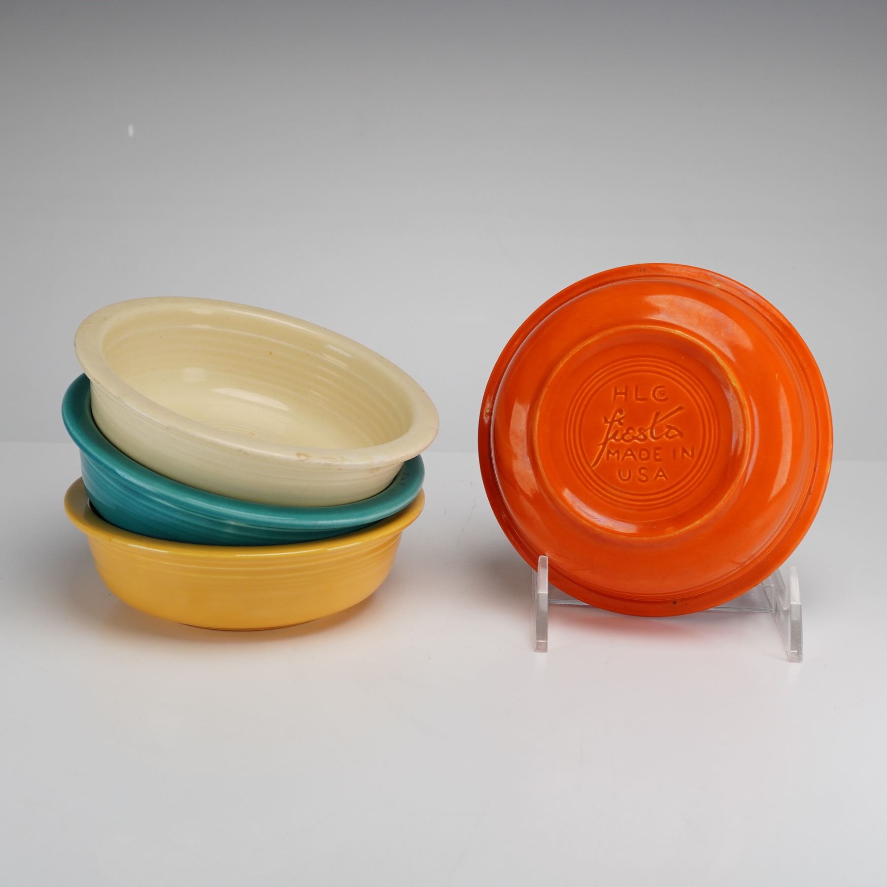 This 4pc set of Homer Laughlin Company (HLC) Fiesta bowls is a quintessential example of mid-century American tableware. These fruit or sauce bowls are made of glazed earthenware and feature the iconic concentric ring pattern on the interior and exterior. The set includes one bowl each in Ivory, Turquoise, Yellow, and vintage Red. The red bowl is a notable vintage example featuring the uranium-based glaze used by the company prior to 1972. The base of the red bowl is impressed with the factory mark HLC / Fiesta / MADE IN USA using the characteristic lowercase script. Measurement is for each item. Dimensions: 4 7/8 inches diameter.