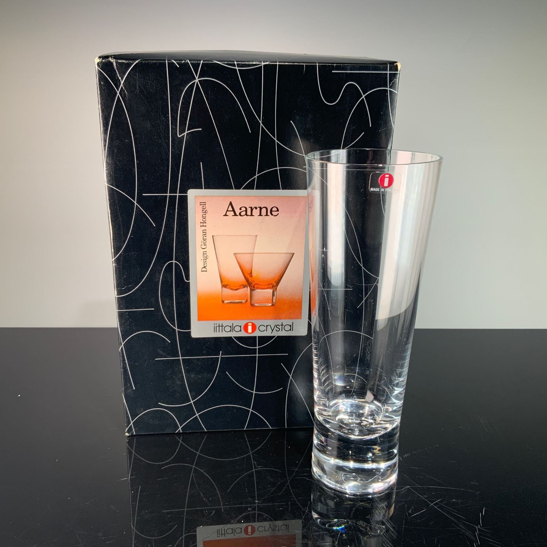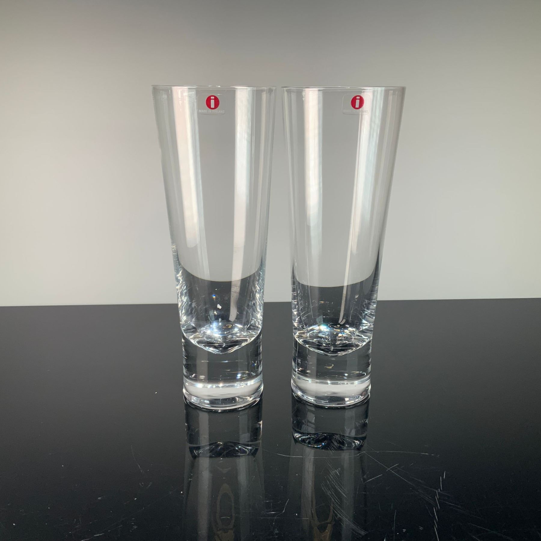 This lot comprises a pair of Iittala Aarne highball glasses, designed by Goran Hongell in 1948. Formed in clear crystal, each glass exhibits a sleek, slightly tapering silhouette with a heavy, thick base characteristic of the design. Each holds approximately 35 cl and is free from cut or engraved decoration, highlighting the collection's streamlined aesthetic. Both glasses retain the original red Iittala sticker at the rim, featuring a white lowercase "i" and "Made in Finland." The set is presented with its original box, labeled with the Aarne pattern and designer attribution.