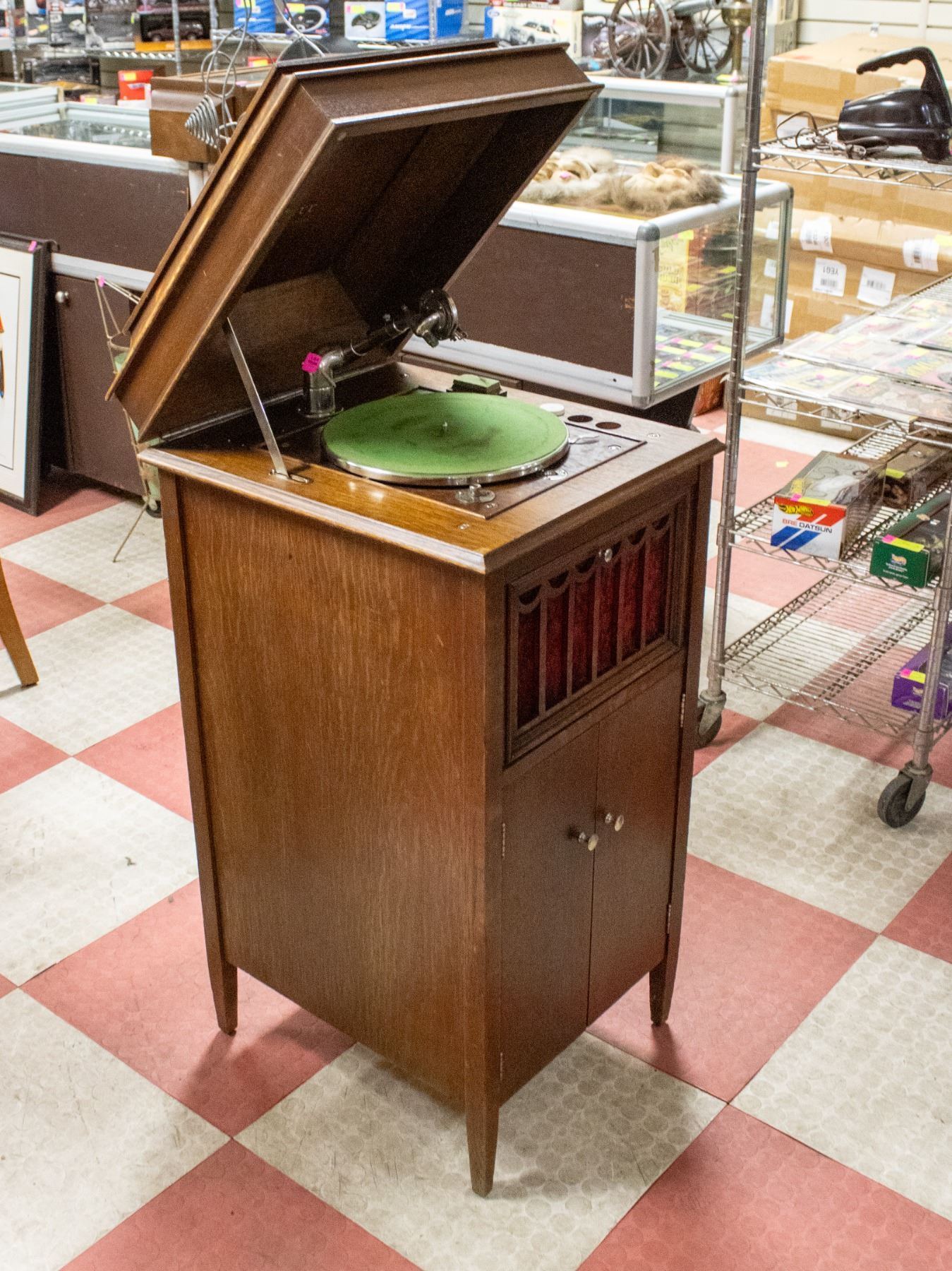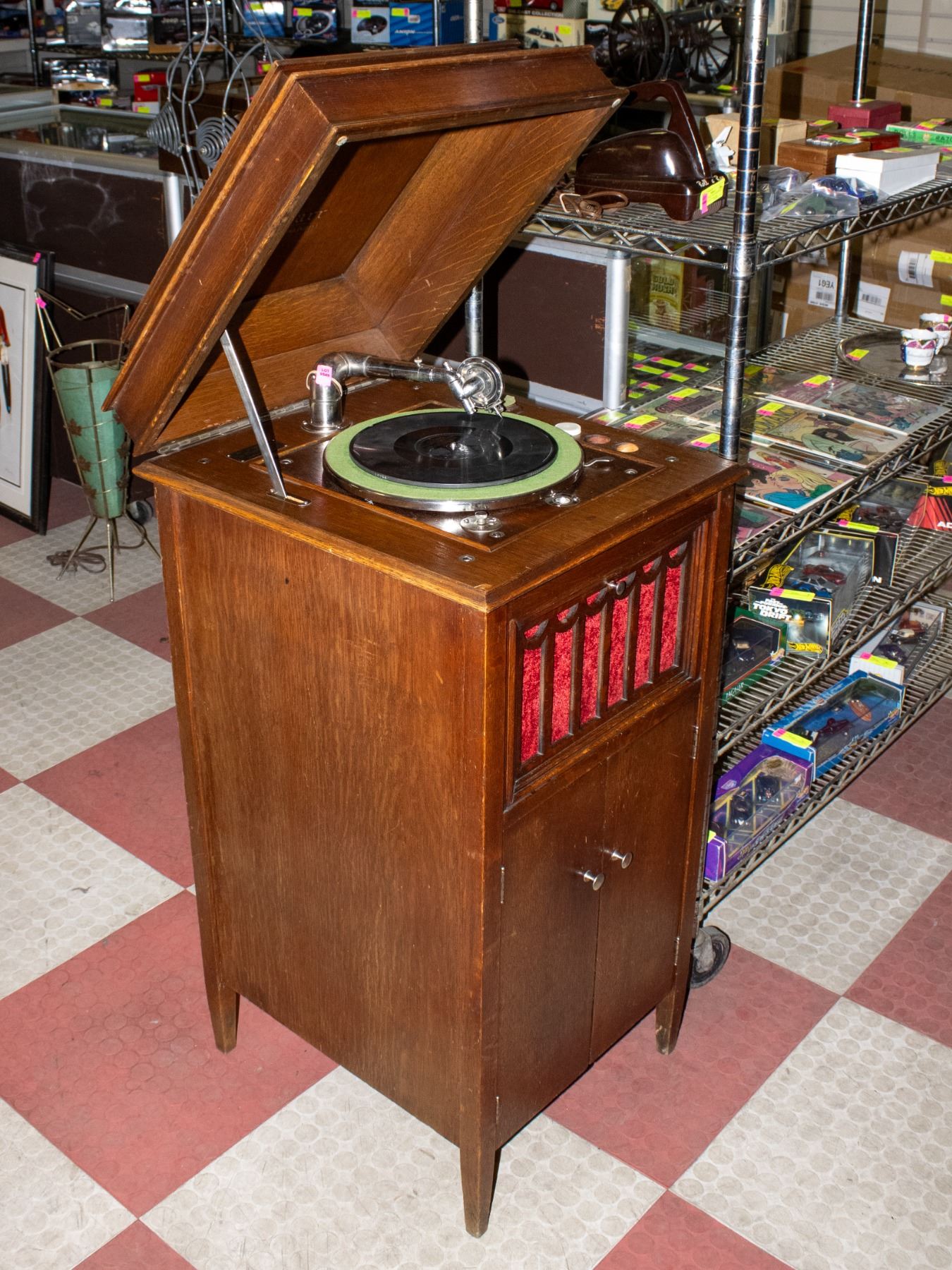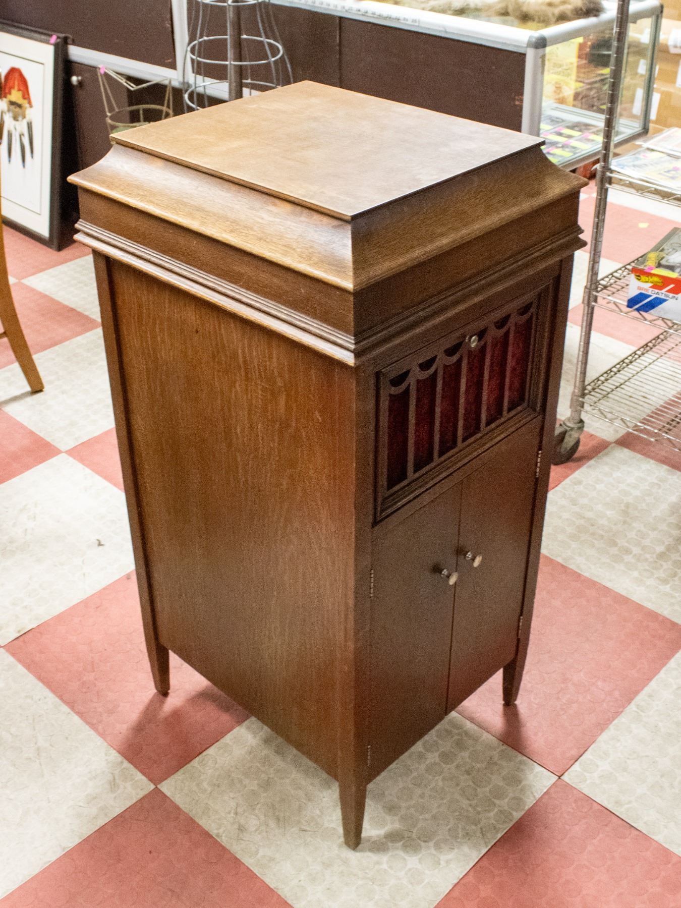 UPRIGHT PHONOGRAPH WITH ORIGINAL HARDWARE IN HARDWOOD CASING, FEATURES VINYL STORAGE SHELF UNDER CABINET.19" X 22" X 41.5"