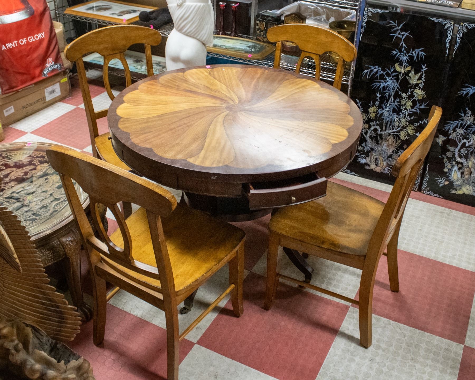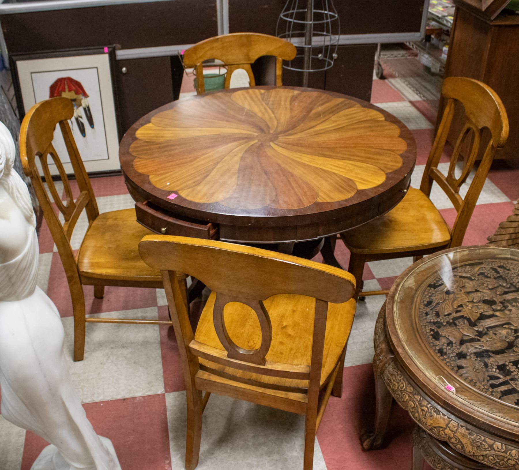 TABLE WITH FOUR UNDER MOUNTED DRAWERS AND FOUR MATCHING CARVED WOOD CHAIRS.
