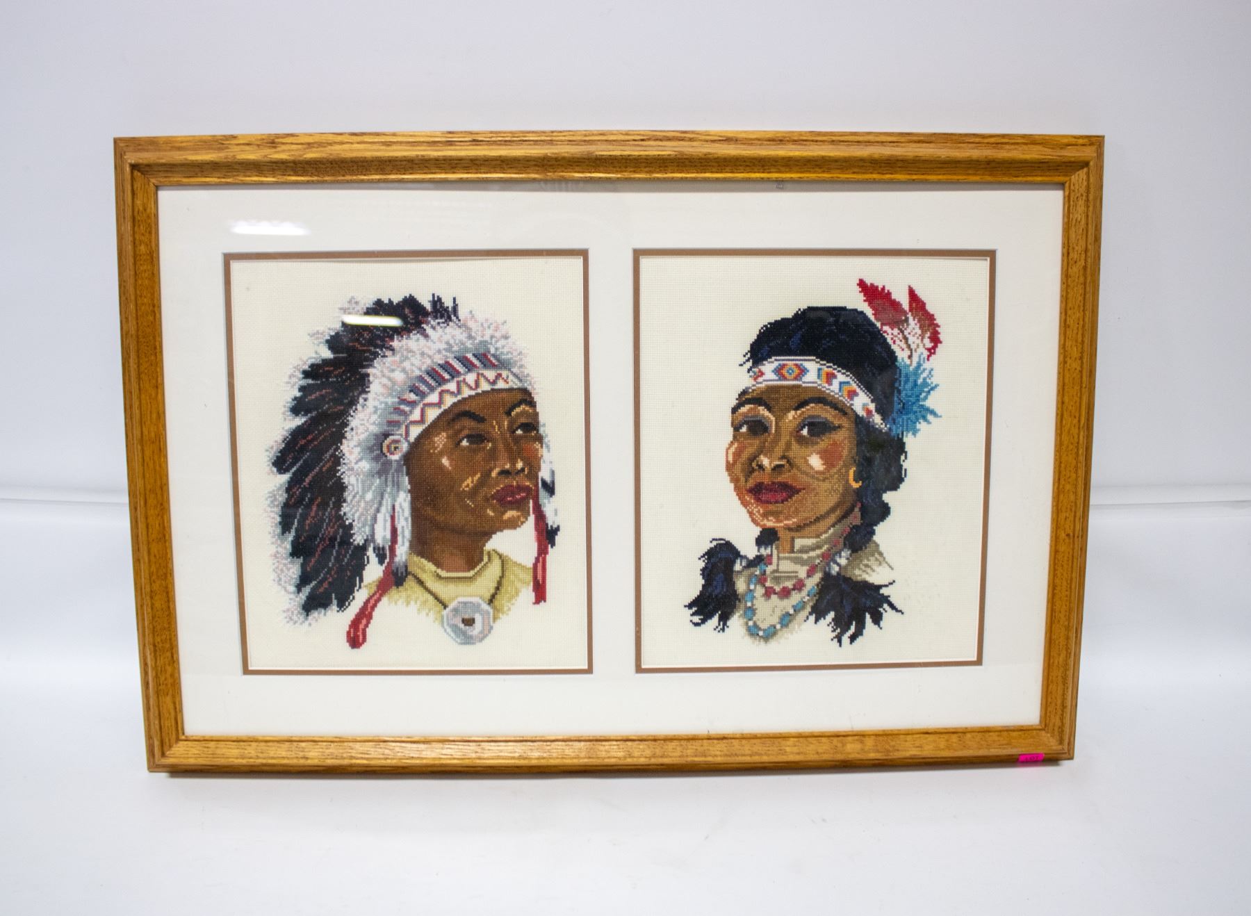 Lot 9570 FRAMED CROSS STITCH INDIGENOUS MAN AND WOMAN