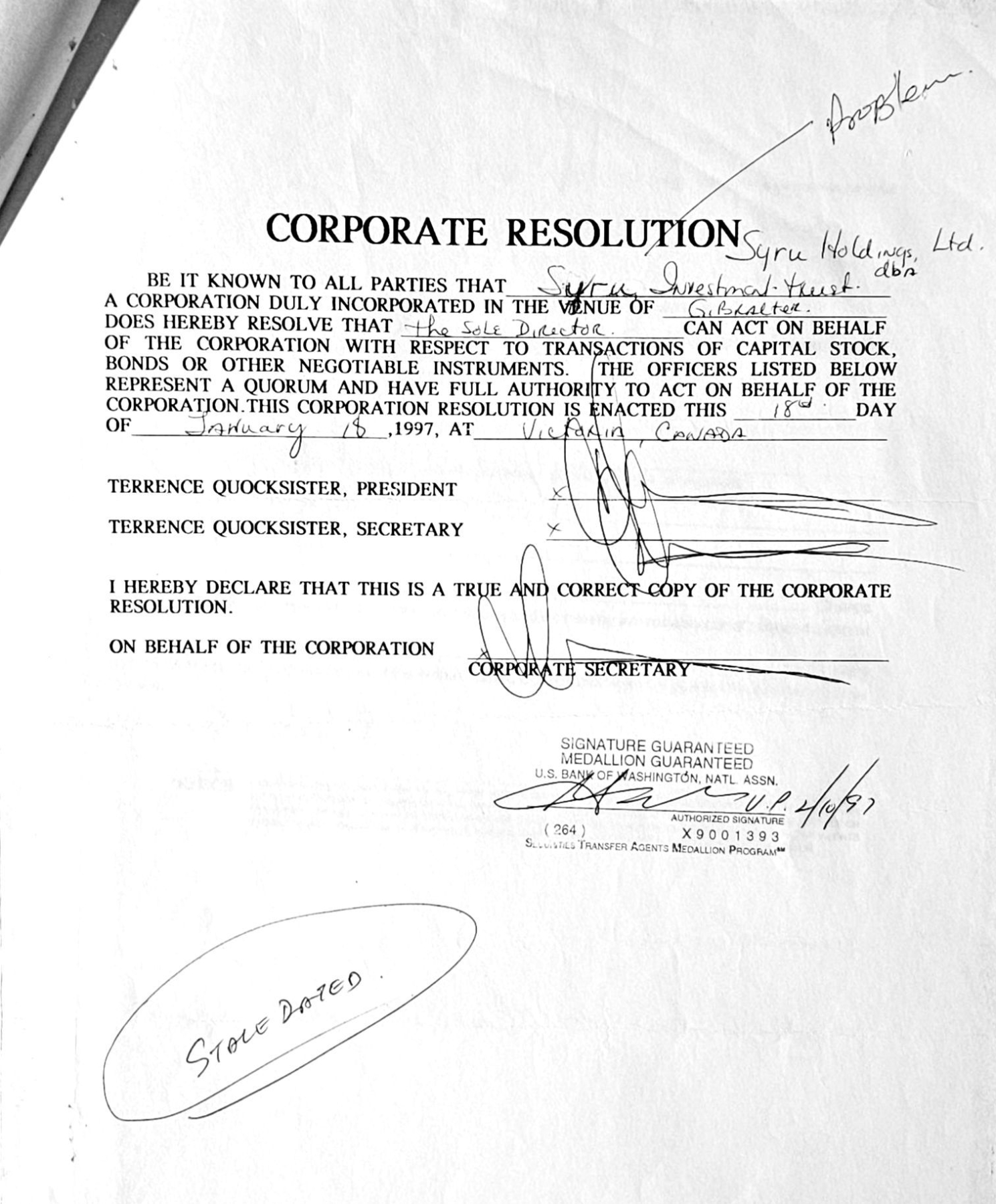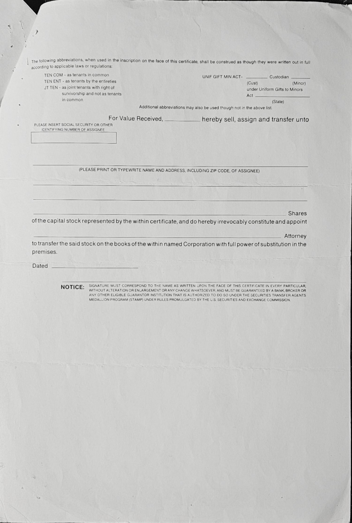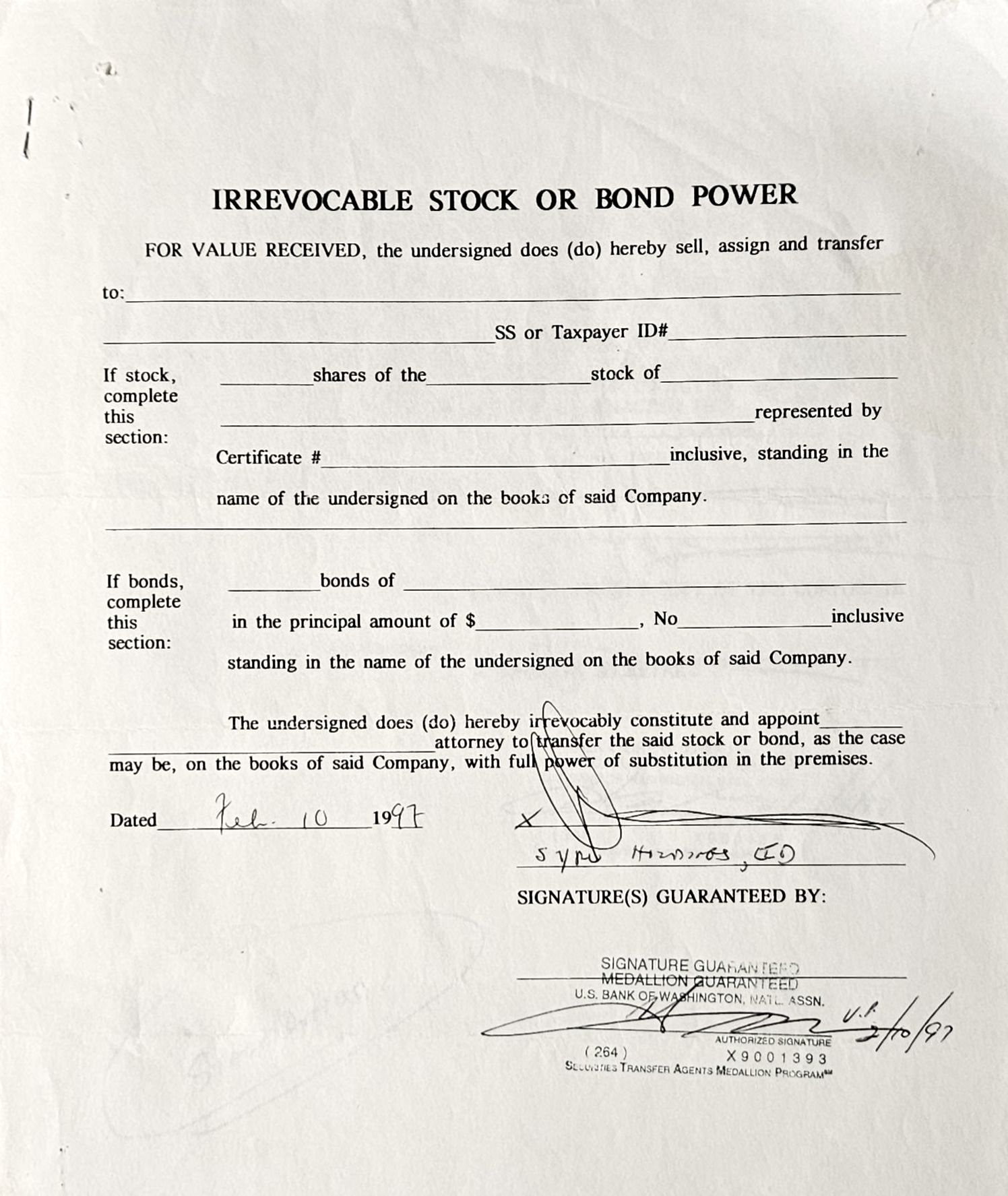 Vintage stock certificate with its authenticity papers.
