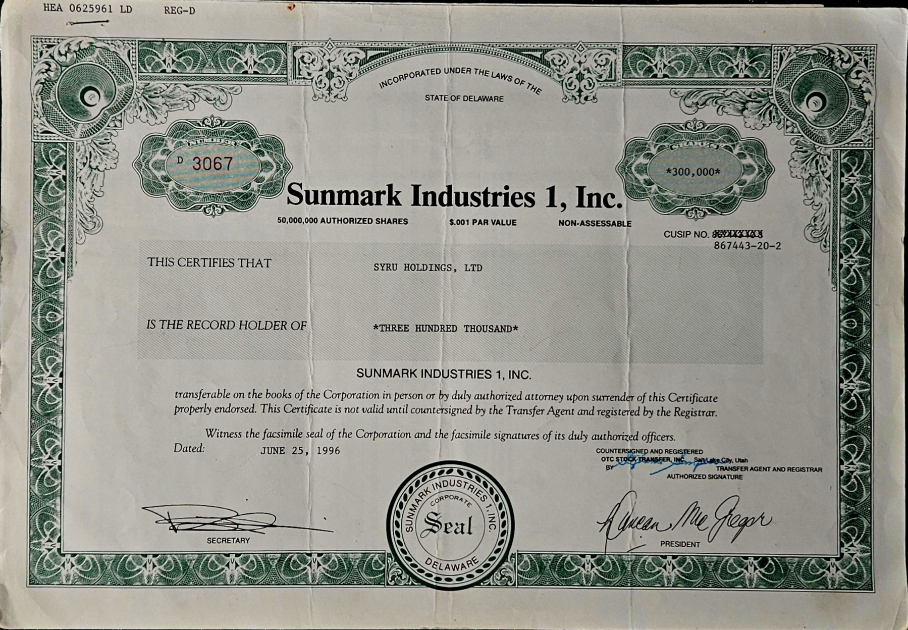 Lot 161 Vintage Stock Certificate (1996, Sunmark Industries 1, Inc.) #1