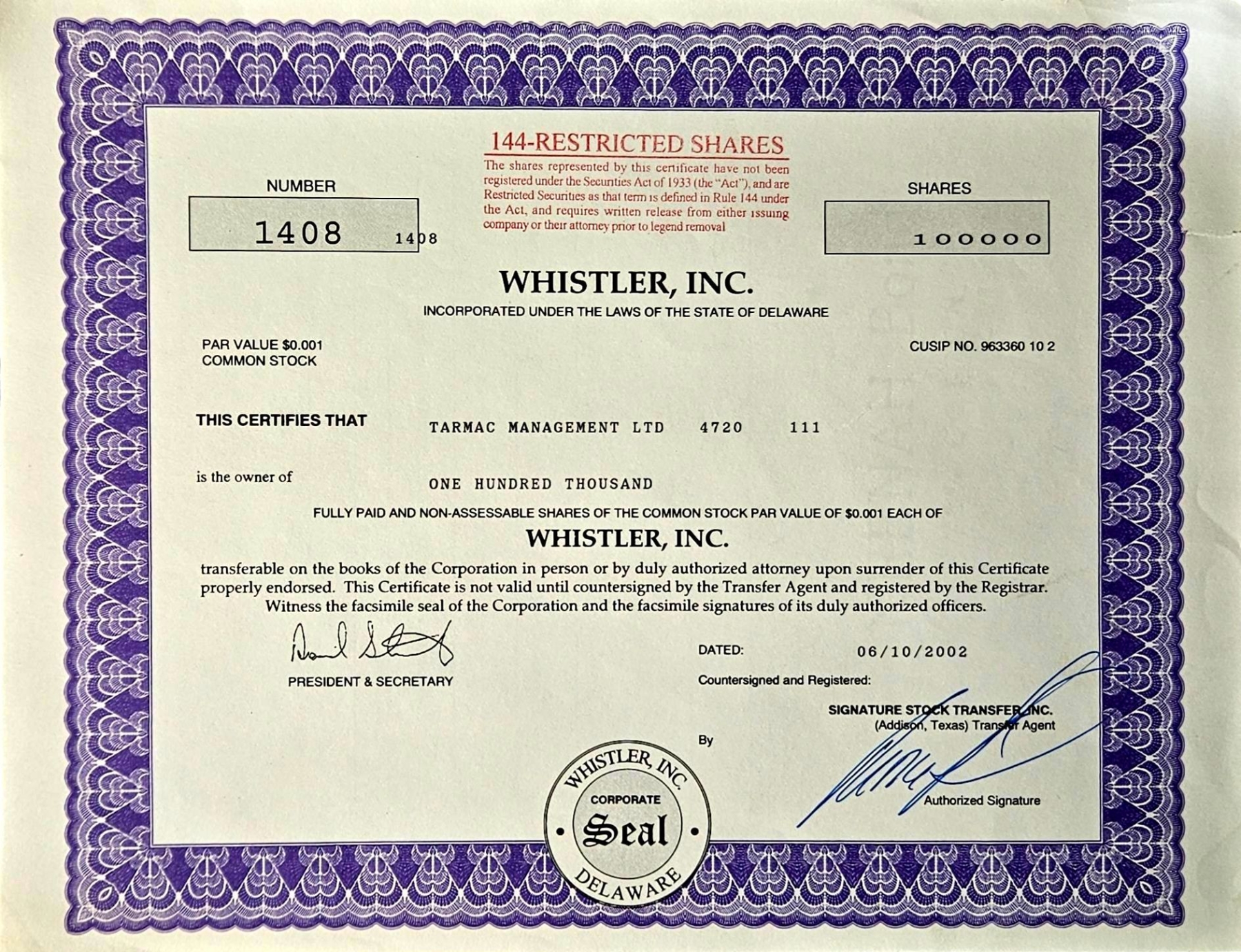 Lot 165 Vintage Stock Certificate (2002, Whistler Inc.) #3