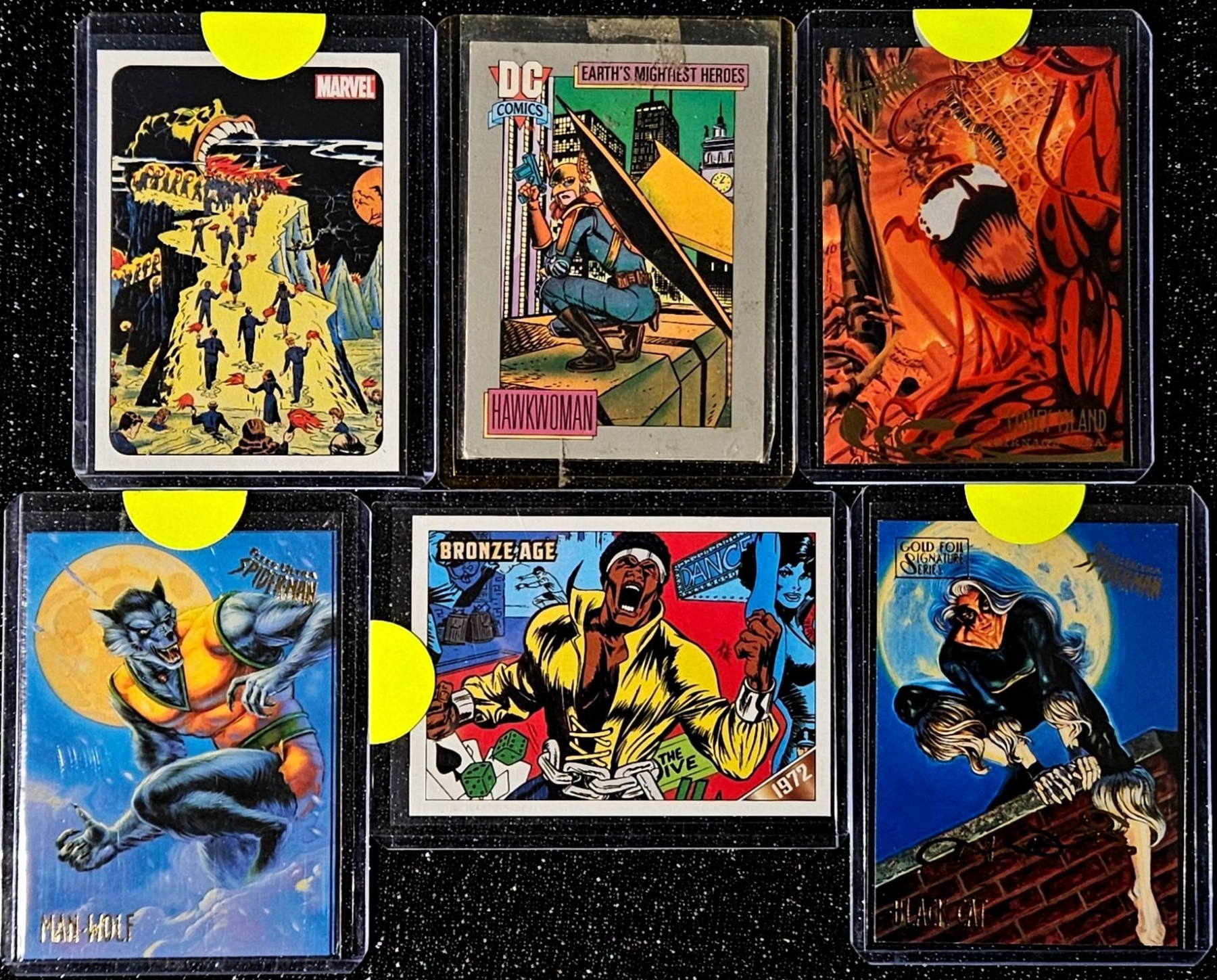 Features 5 Character Cards in plastic protective cases. Includes Marvel's Venom, Spider-Man, Black Cat, Man-Wolf, and DC's Hawkwoman.