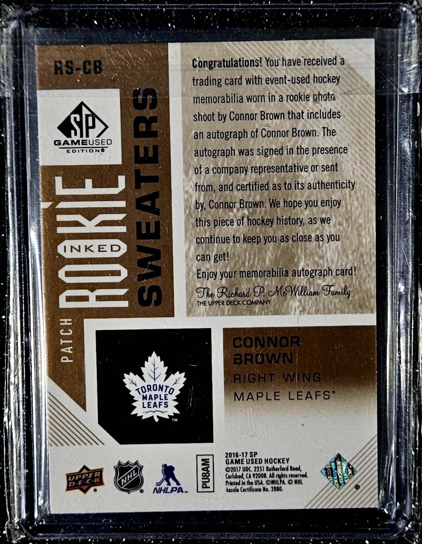 Lot 181 Connor Brown - 2016-17 Upper Deck "Game Used" Rookie Patch Autograph Card
