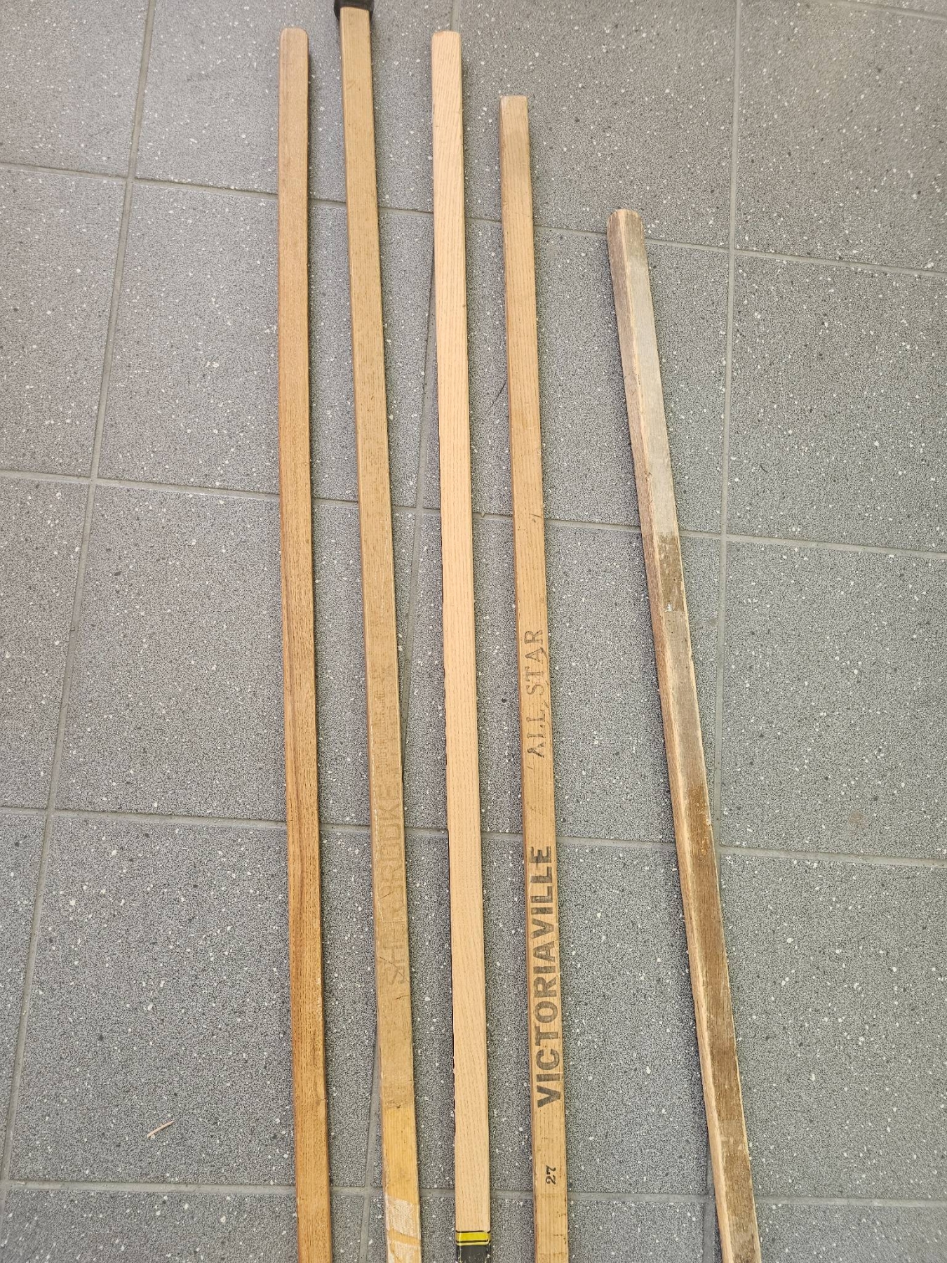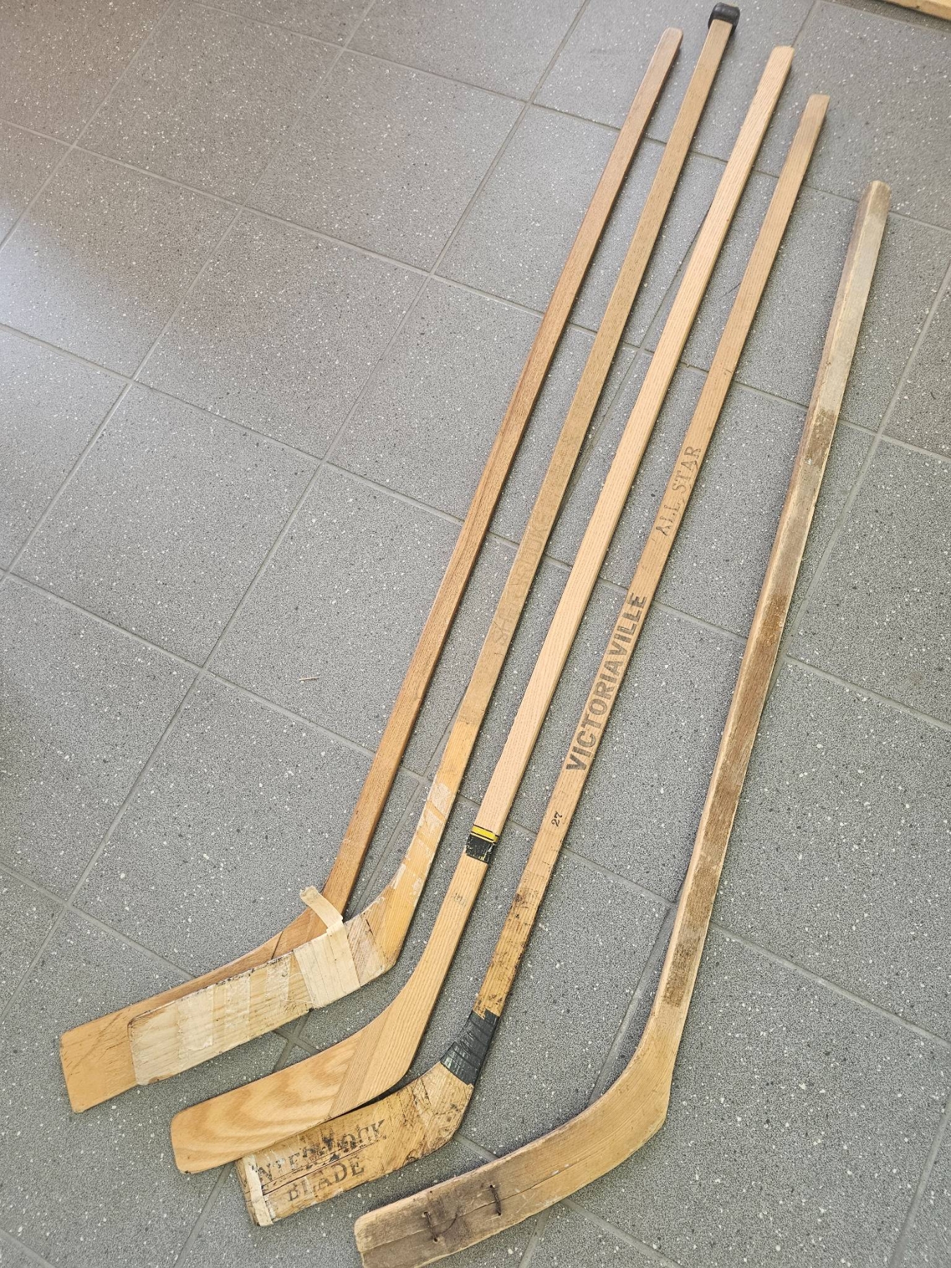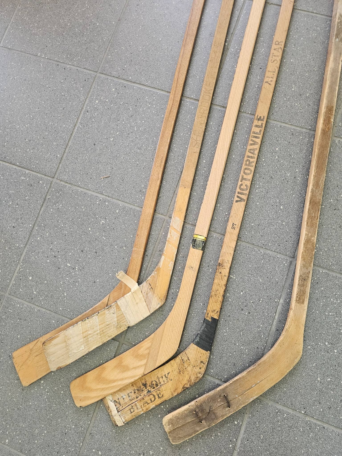Five vintage wooden hockey sticks, including various unbranded and branded designs such as a 'Victoriaville' model. Each stick shows signs of use with visible wear, scuffs, and some tape wrapping on the blades. Great for restoration, collection, or display. Sold as-is with signs of age and wear evident.
