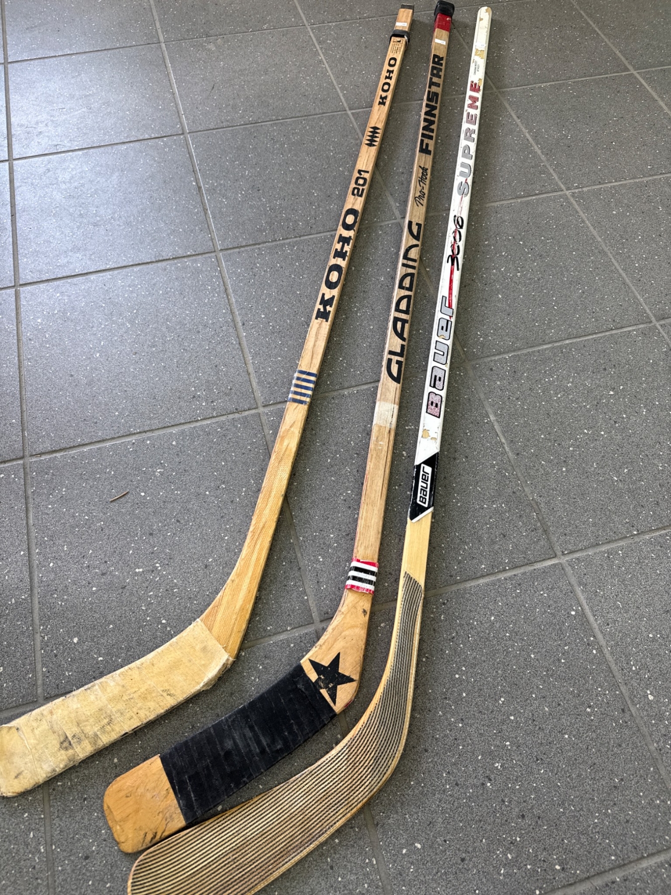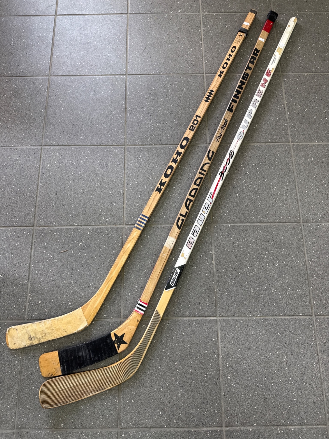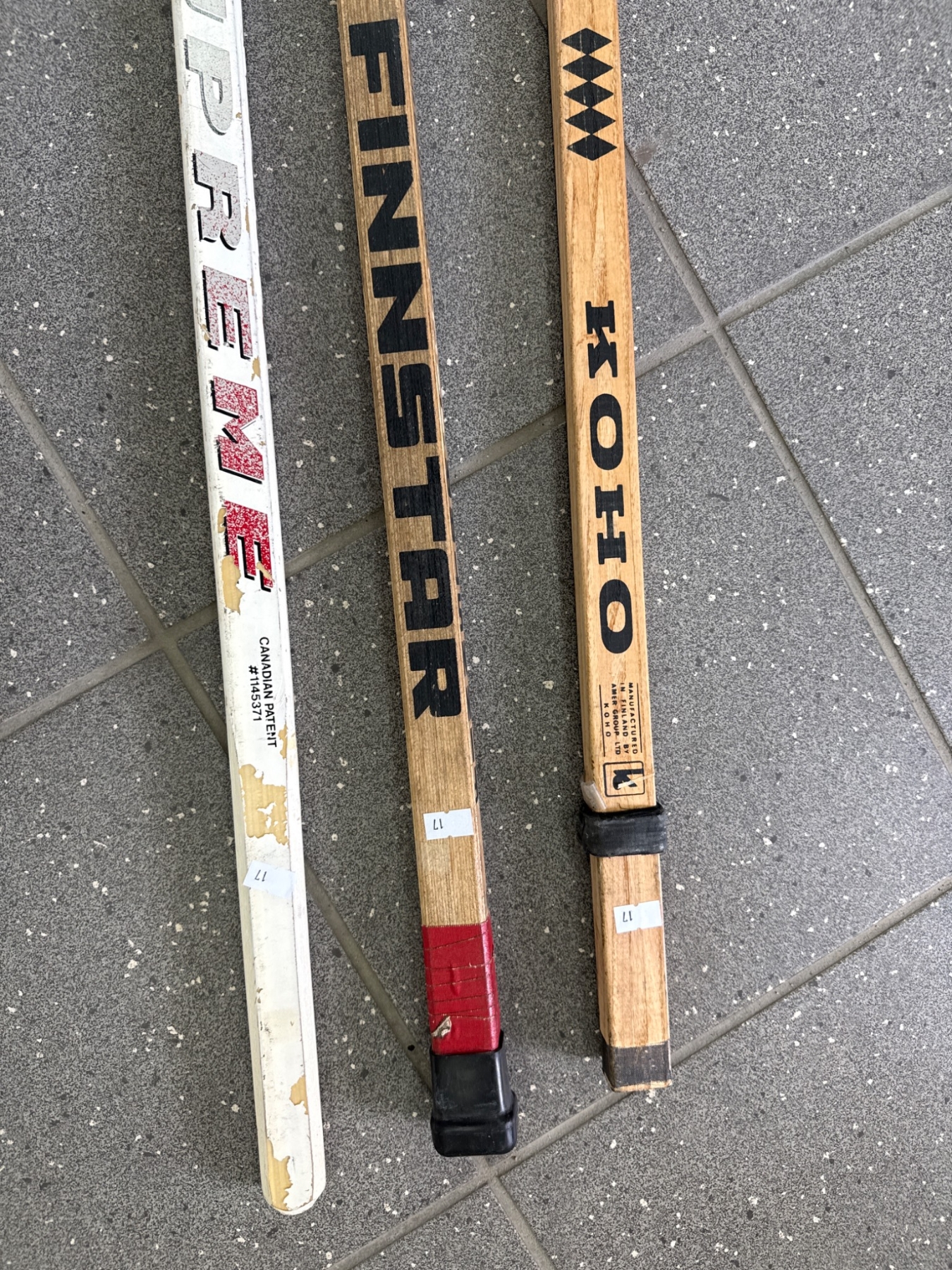Lot 17 Three Wooden Hockey Sticks by Koho, Finntar, and Supreme