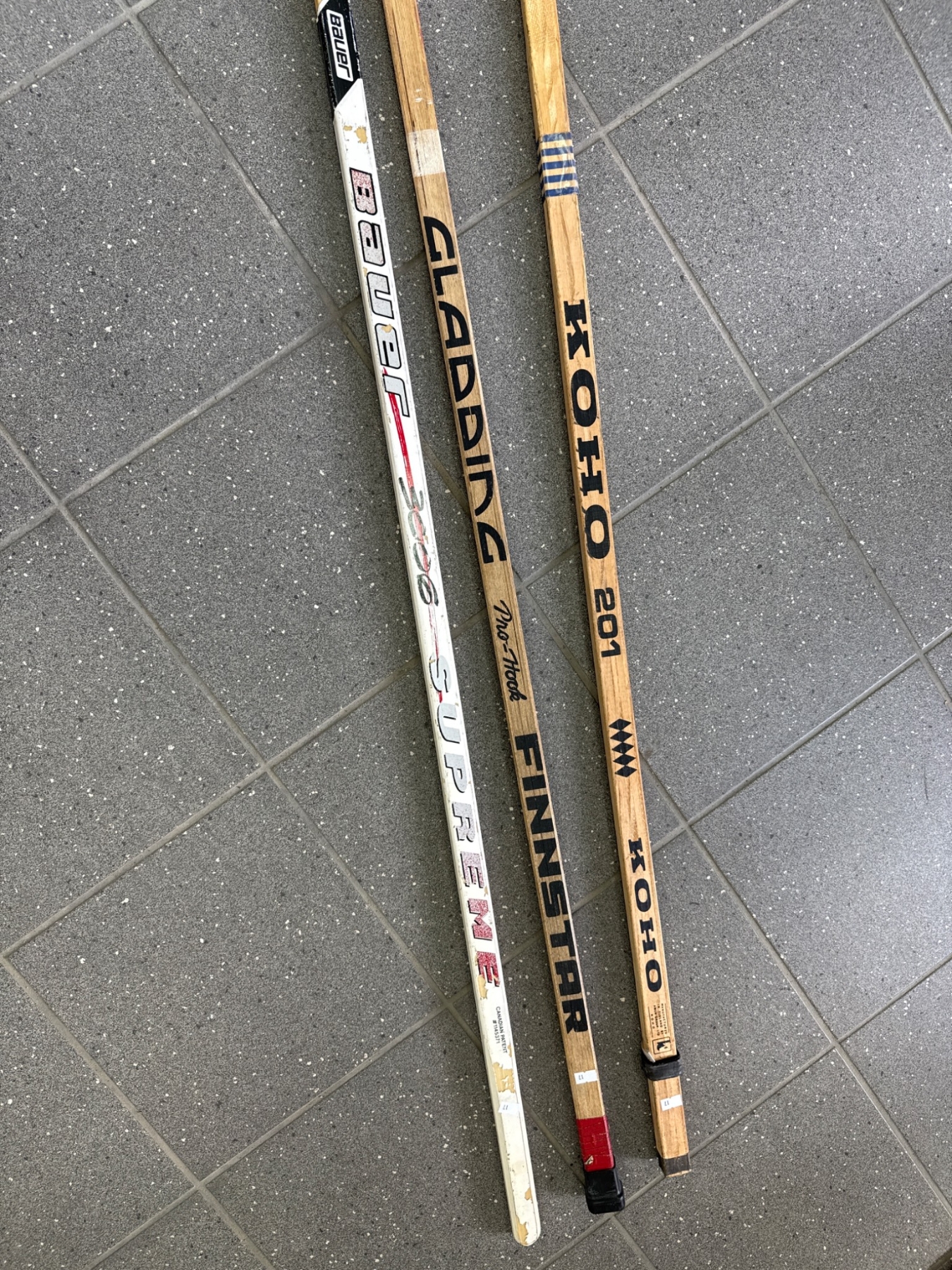 Collection includes three wooden hockey sticks: a Koho 201 stick, a Finntar stick, and a Supreme stick. They display signs of prior use, including scuffing and wear, consistent with their purpose. Branding and logos remain visible. Suitable for collectors or enthusiasts of hockey memorabilia.