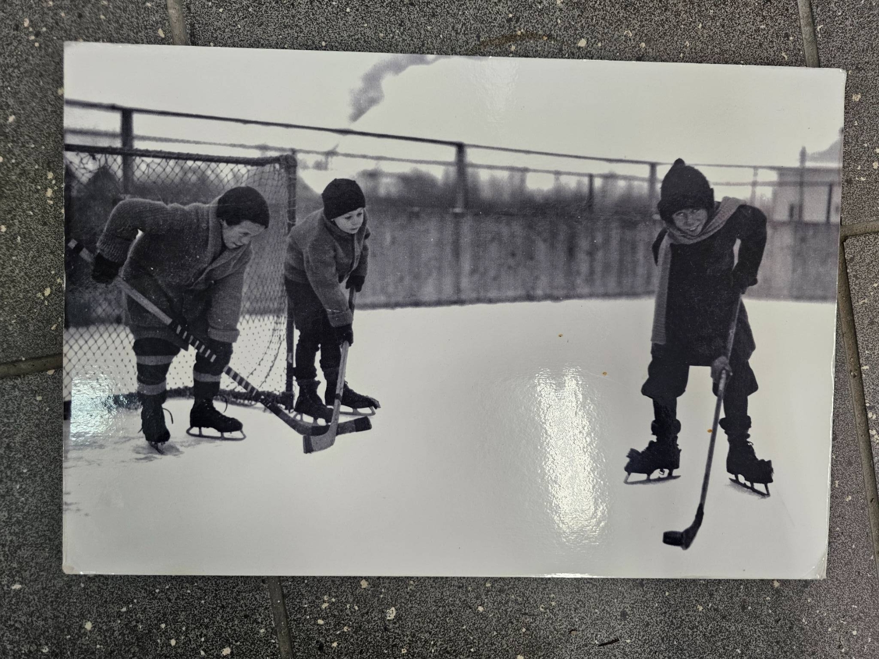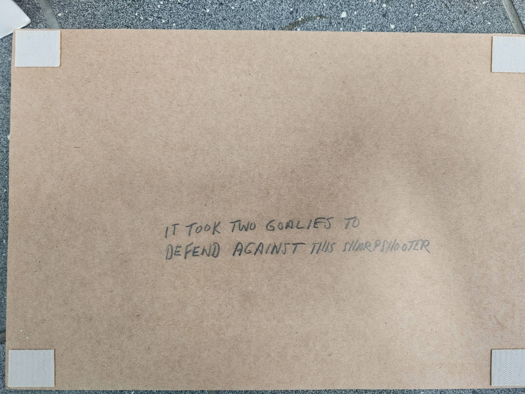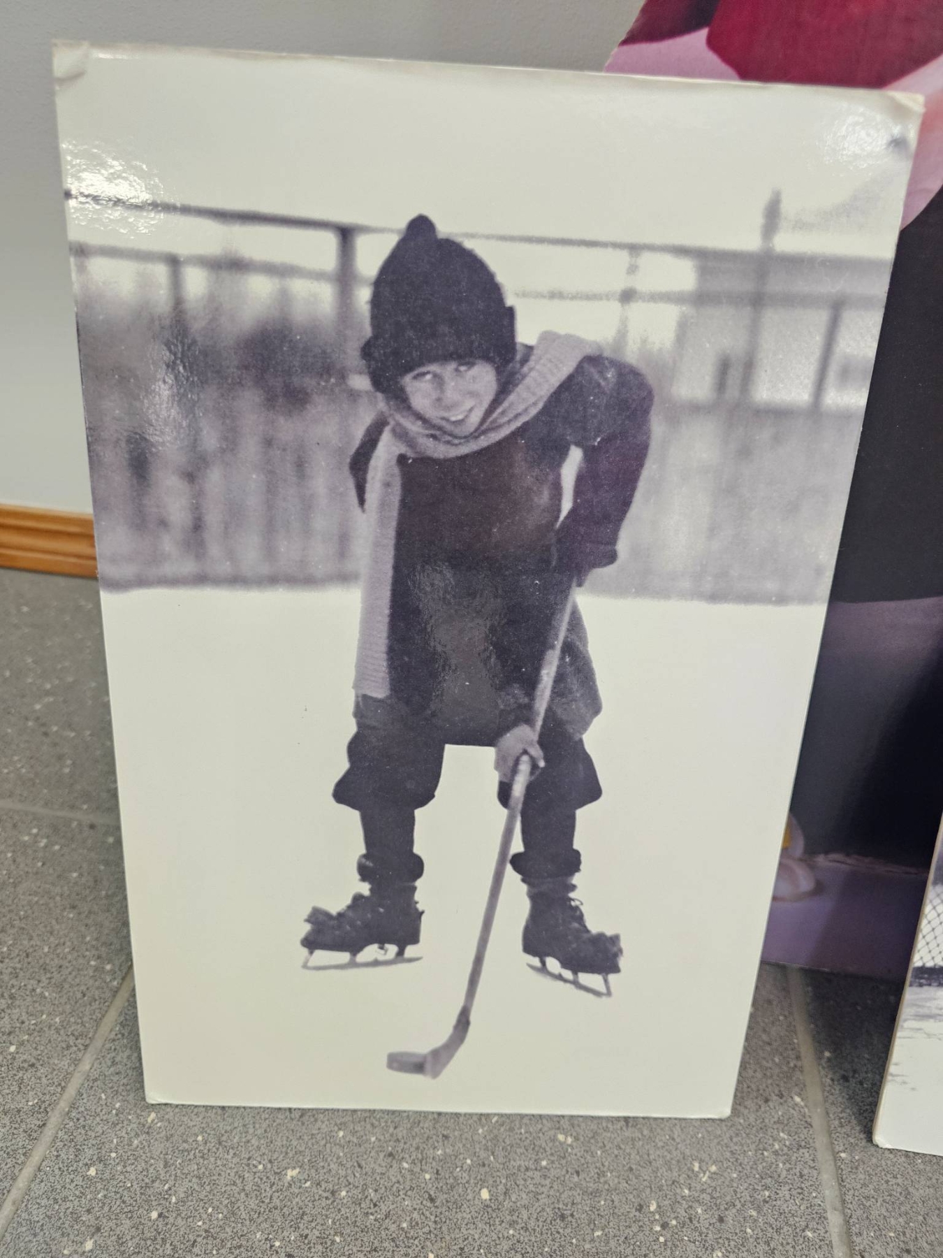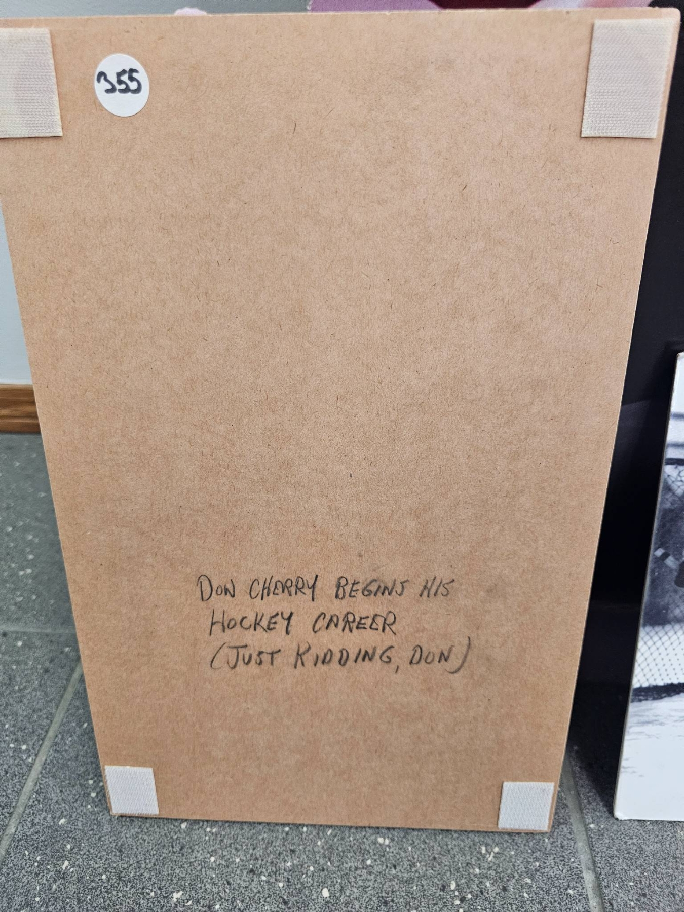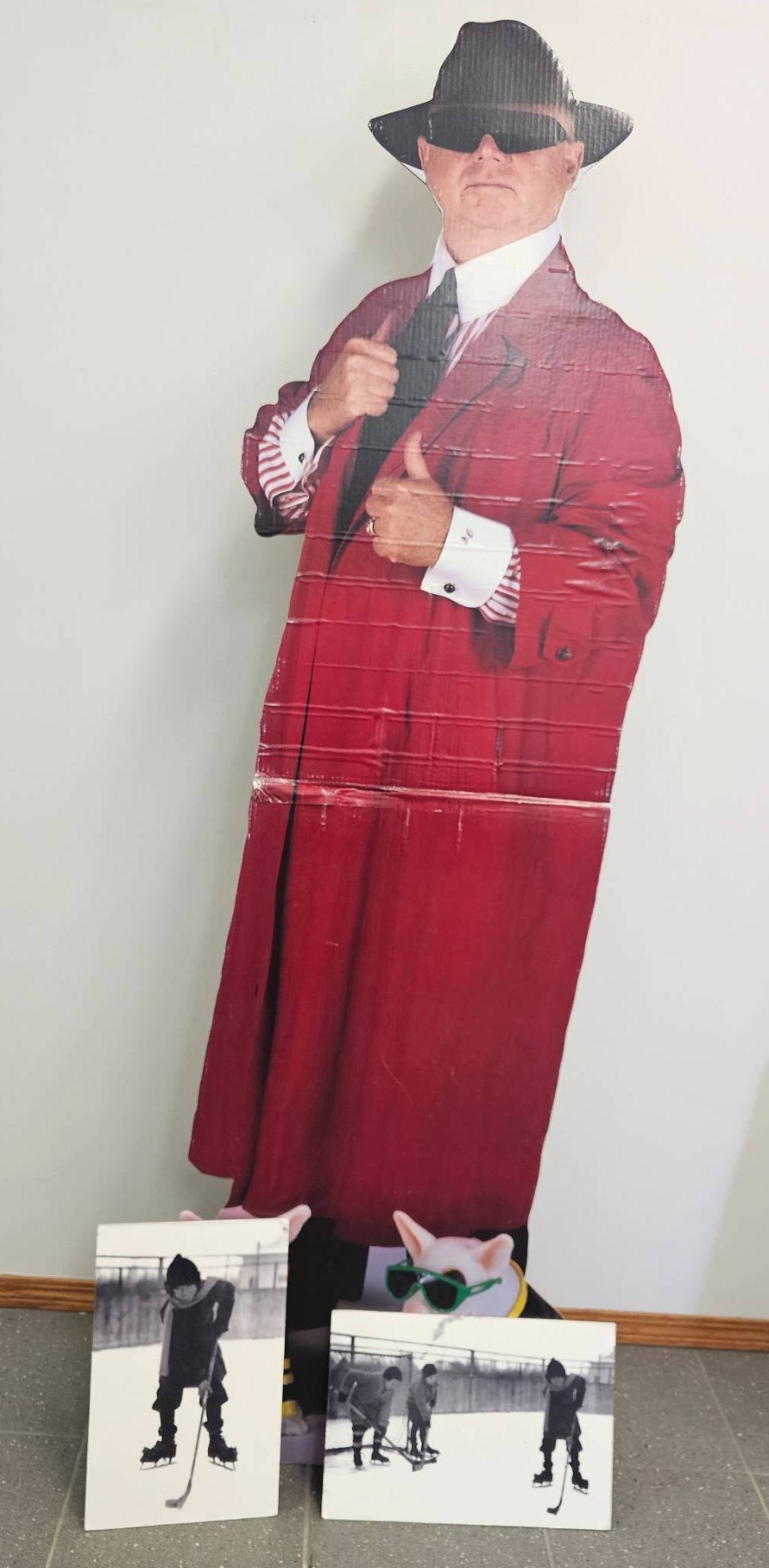 Don Cherry Begins His Hockey Career ( Just Kidding Don) A life-size cardboard standee of a person in a red trench coat and hat, accompanied by two black-and-white ice hockey-themed photographic prints mounted on boards. The backs of the boards feature humorous handwritten notes. Standee exhibits visible creases and wear; conditions of the mounted prints are good with minor handling marks.